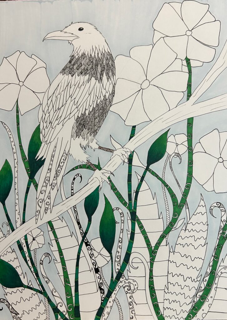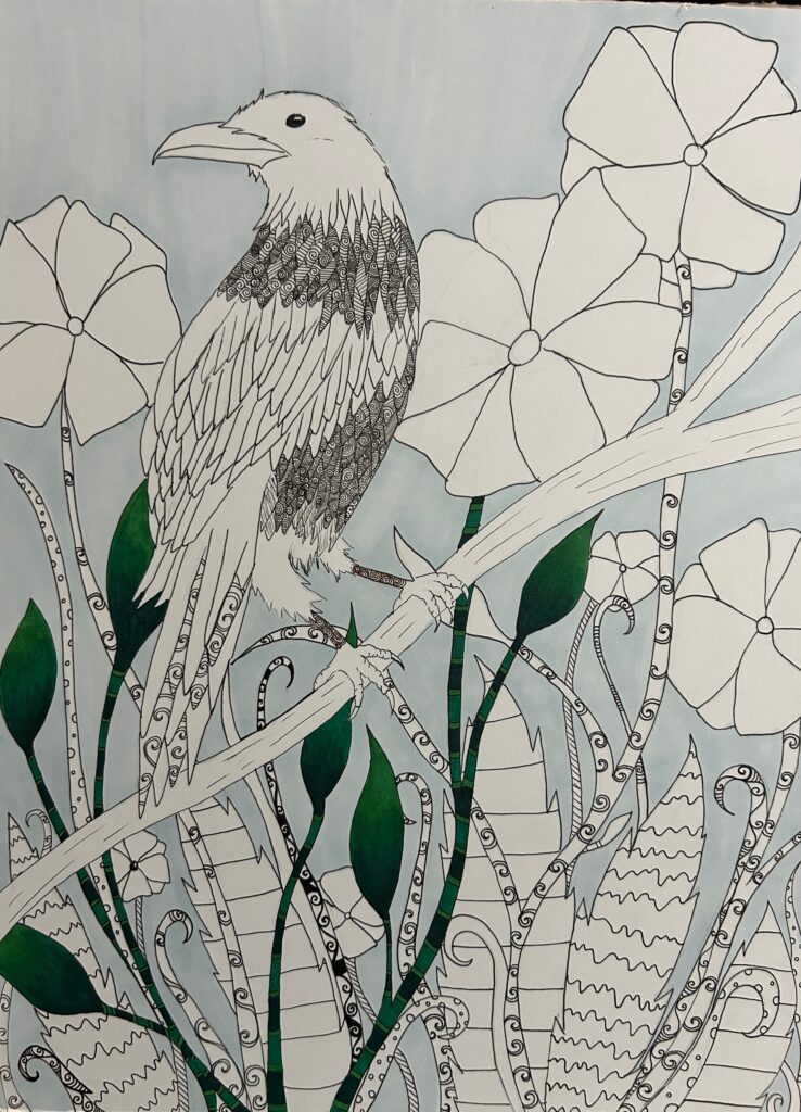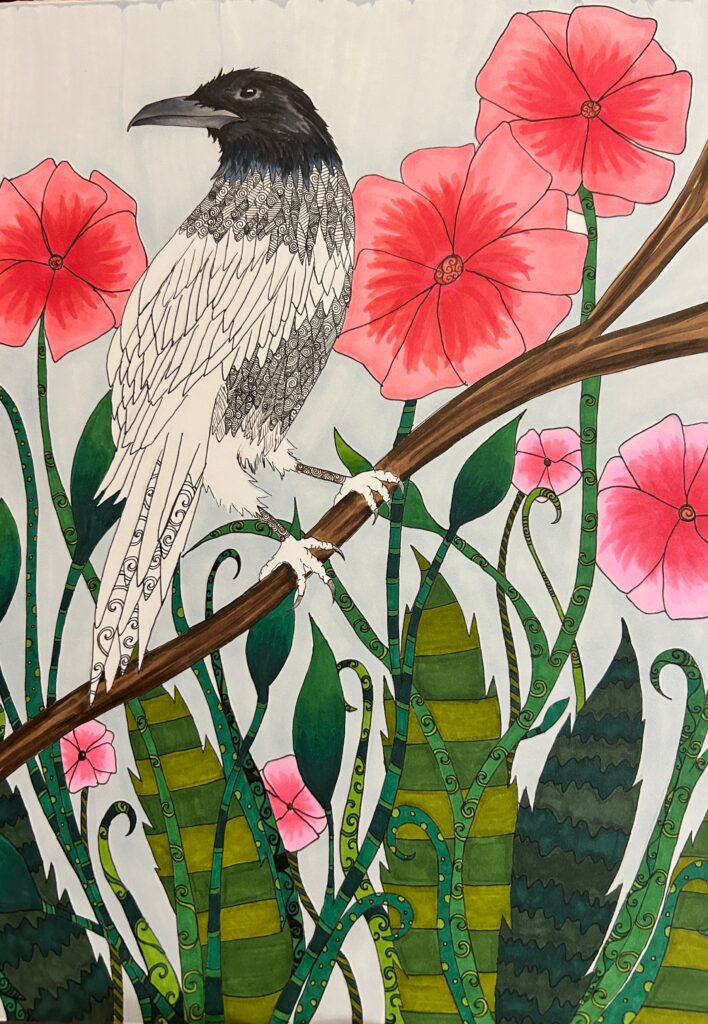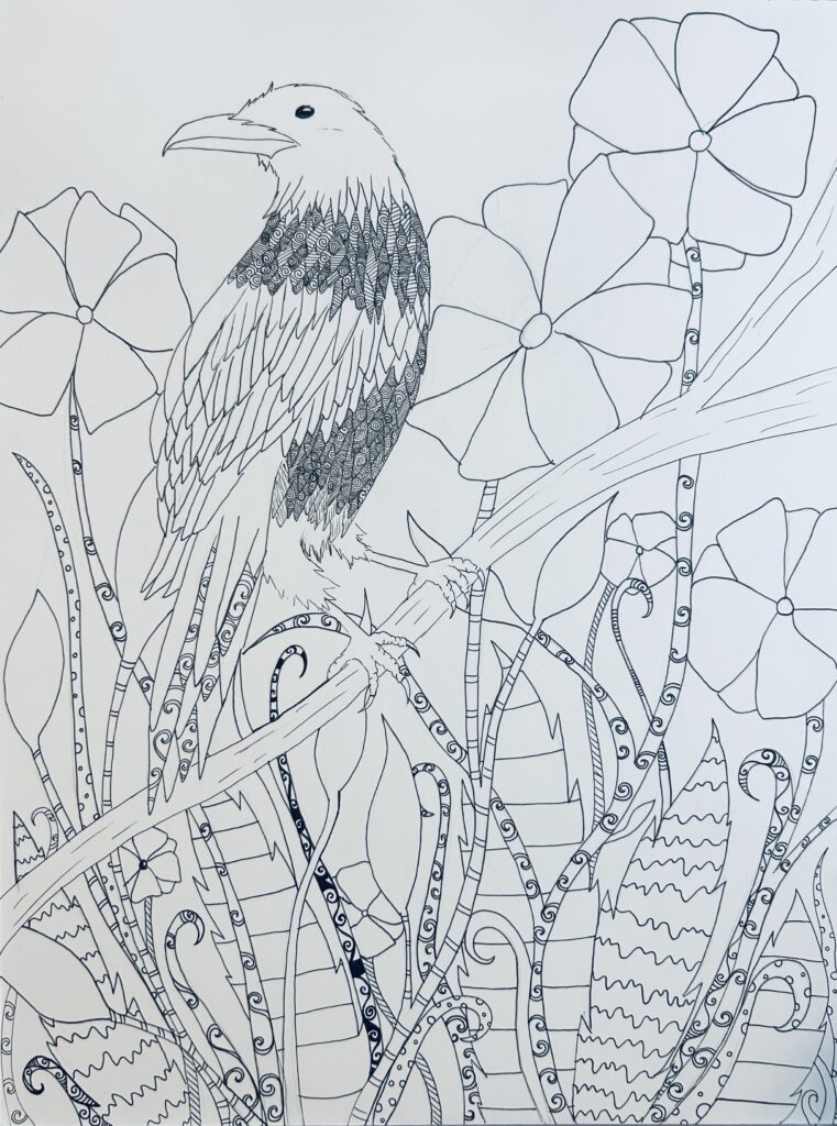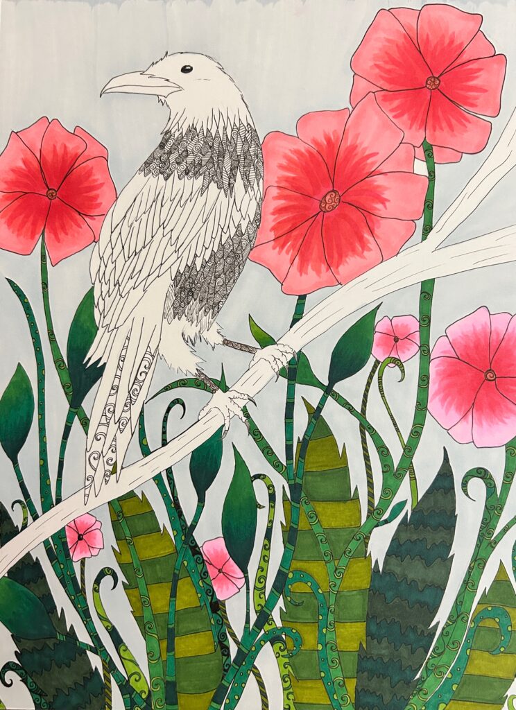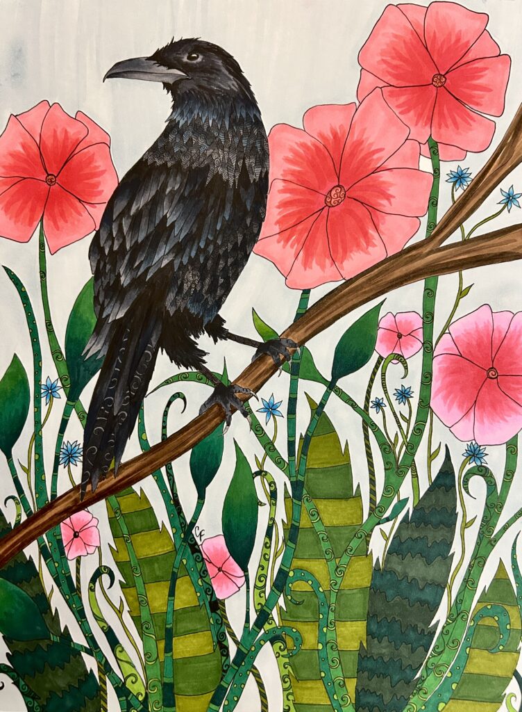 Artwork Crow and flowers drawing, progress pictures! ByCarolyn April 9, 2026April 9, 2026 Drawn with Sakura micron pens and Ohuhu alcohol markers on smooth marker paper.