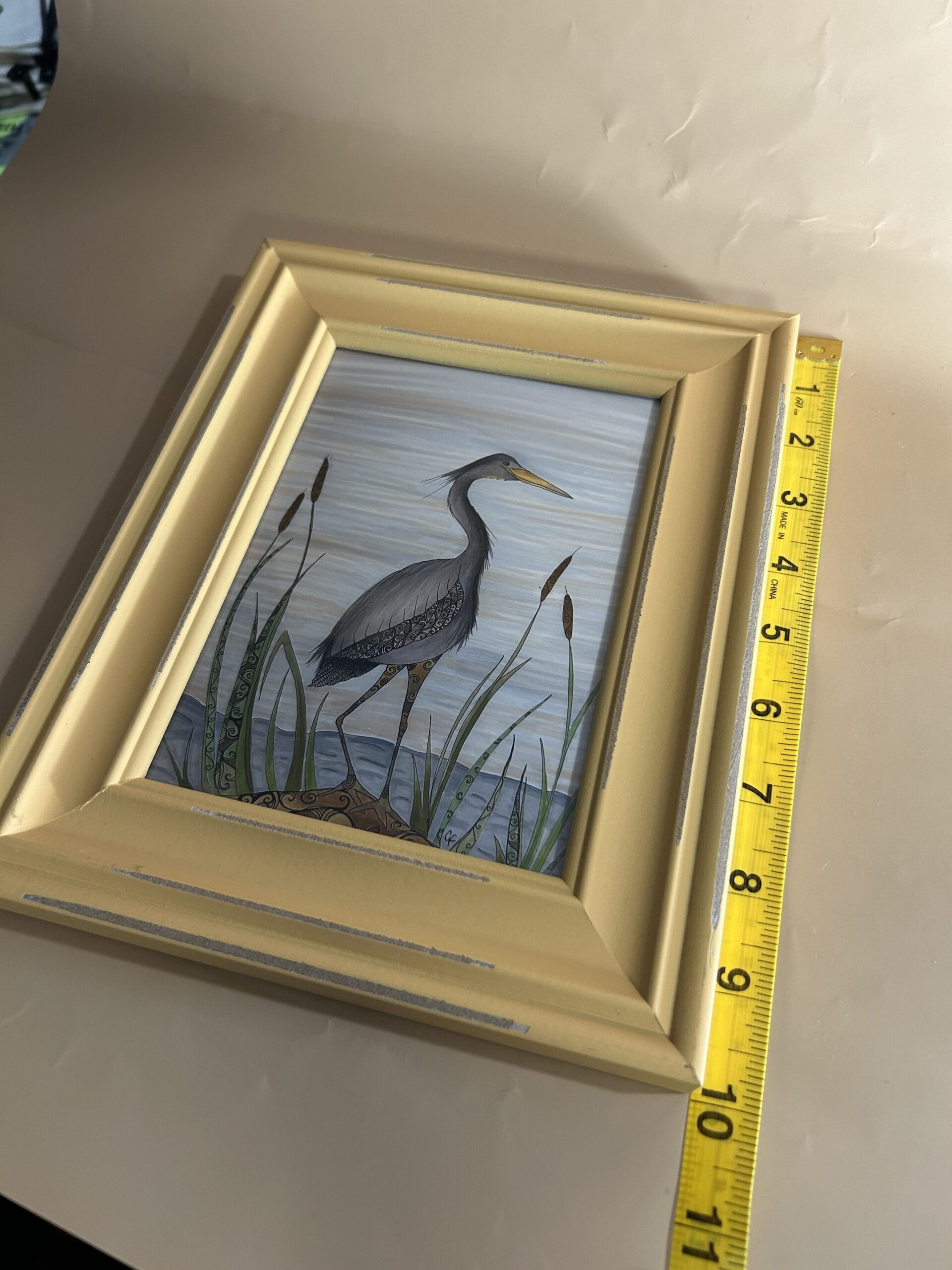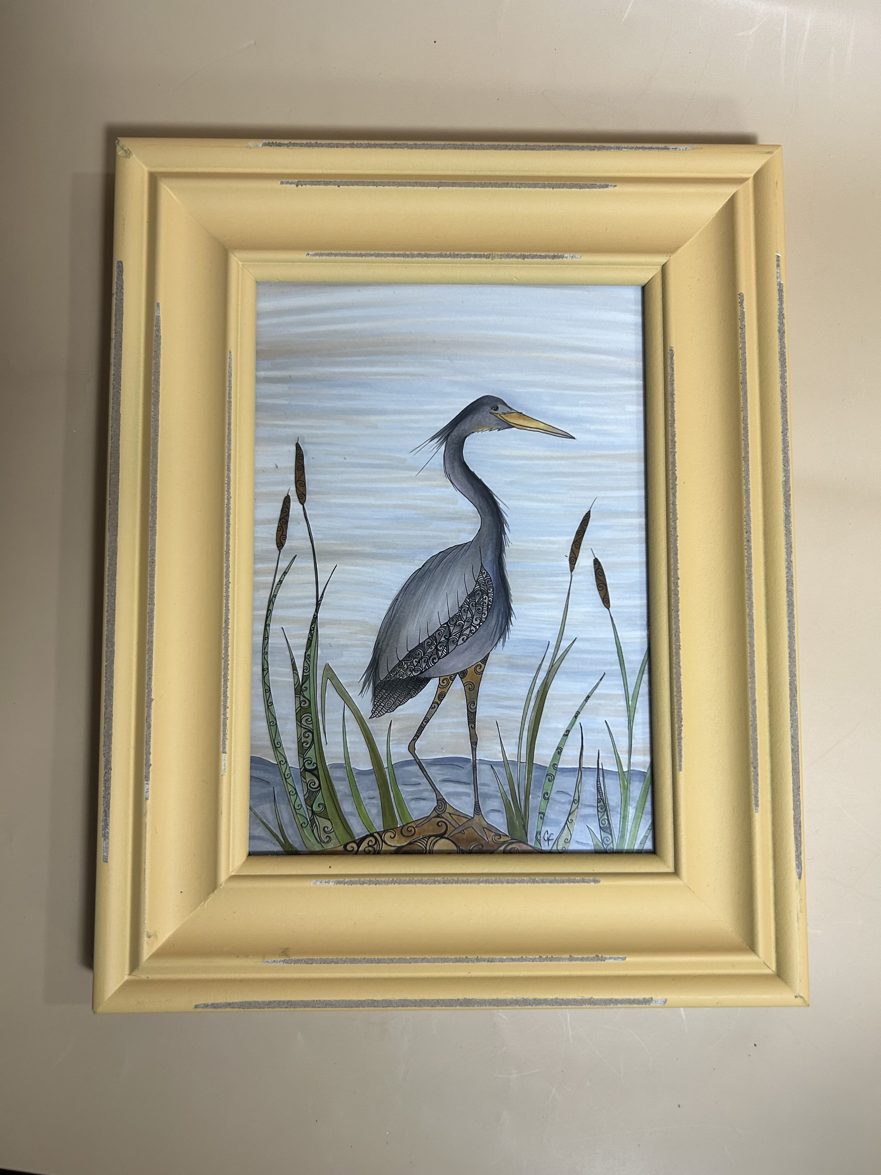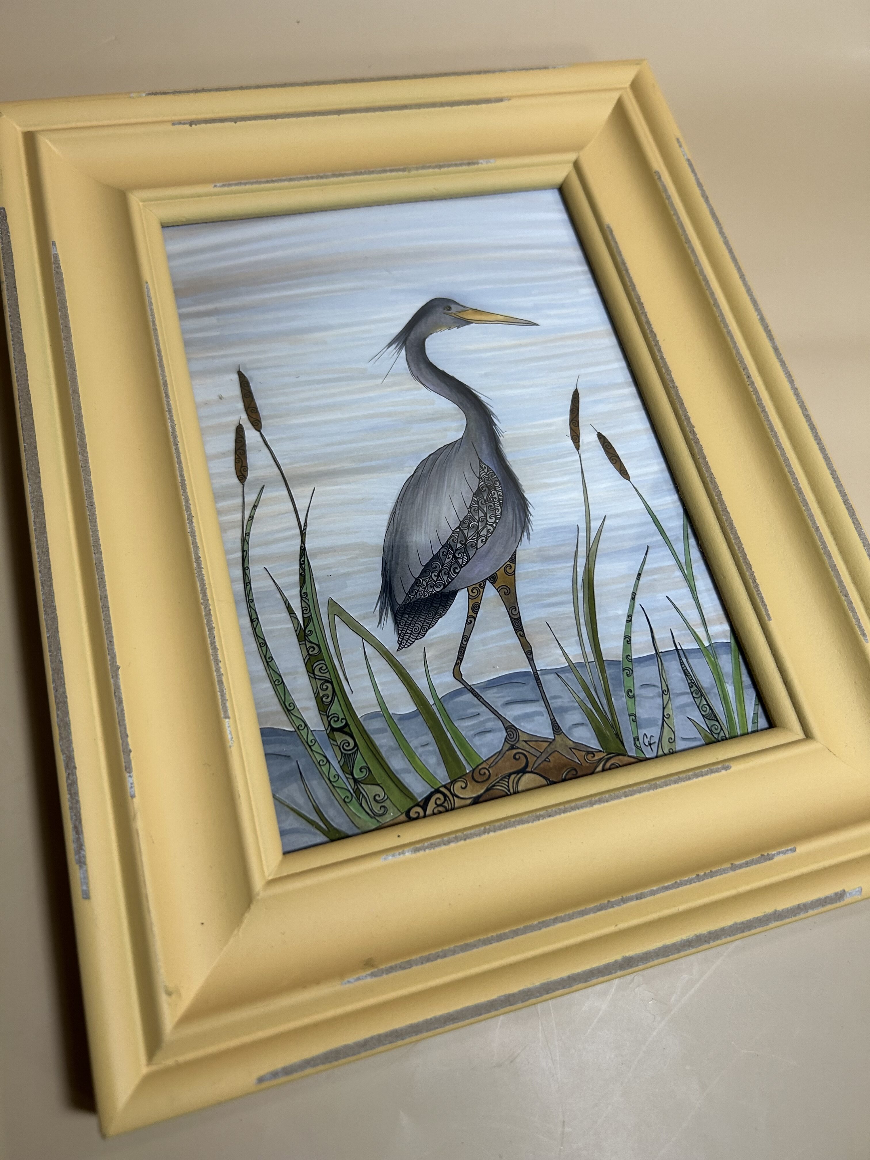 Framed art print-Blue Heron with yellow frame