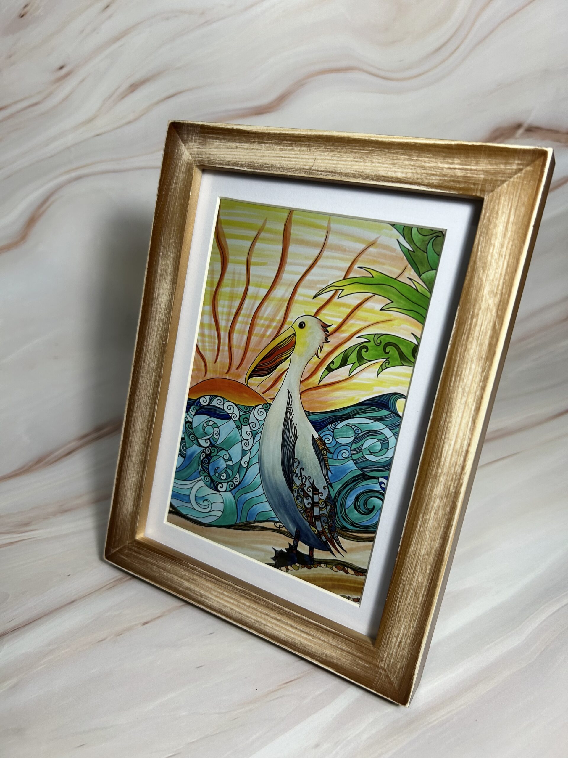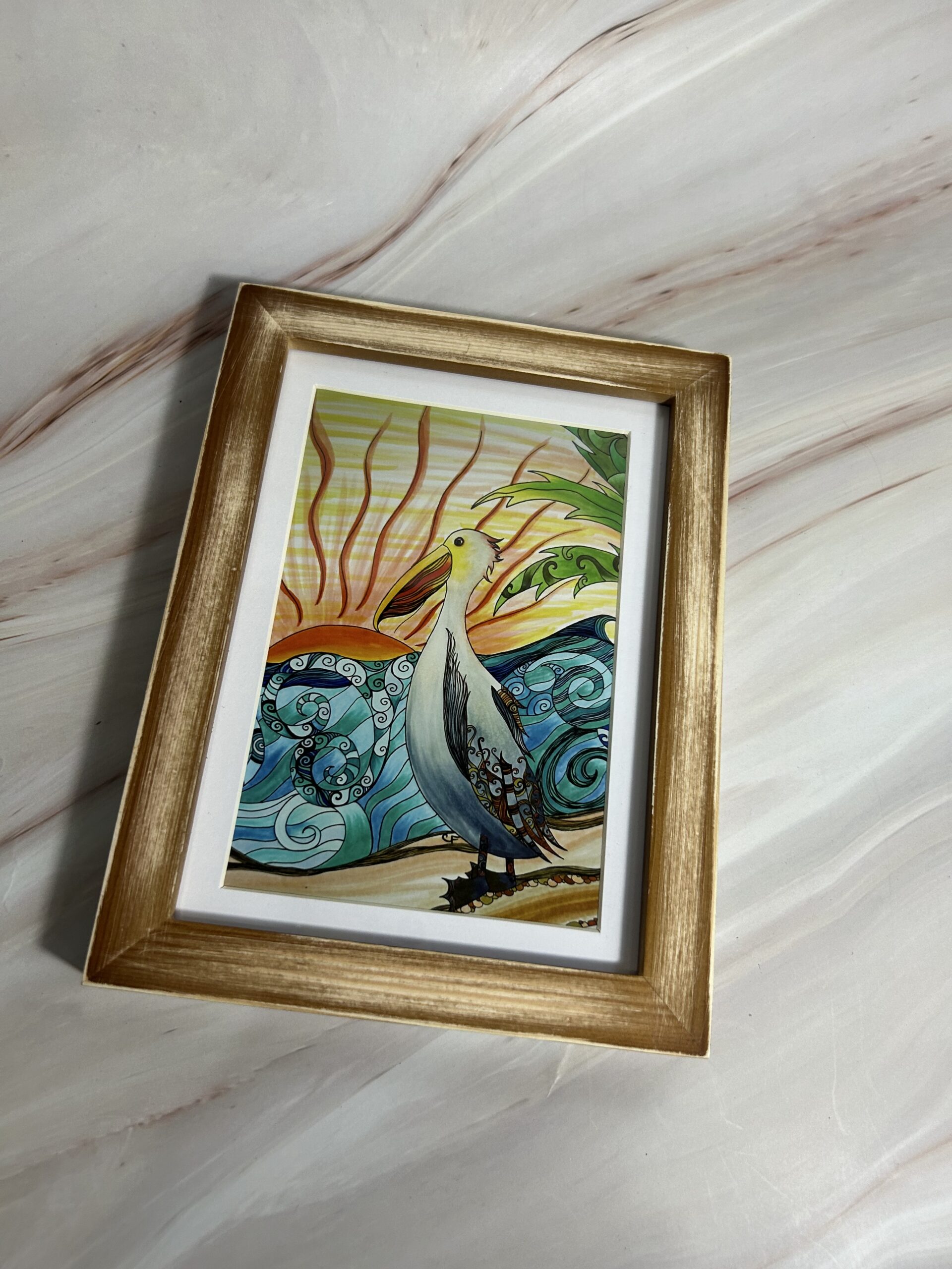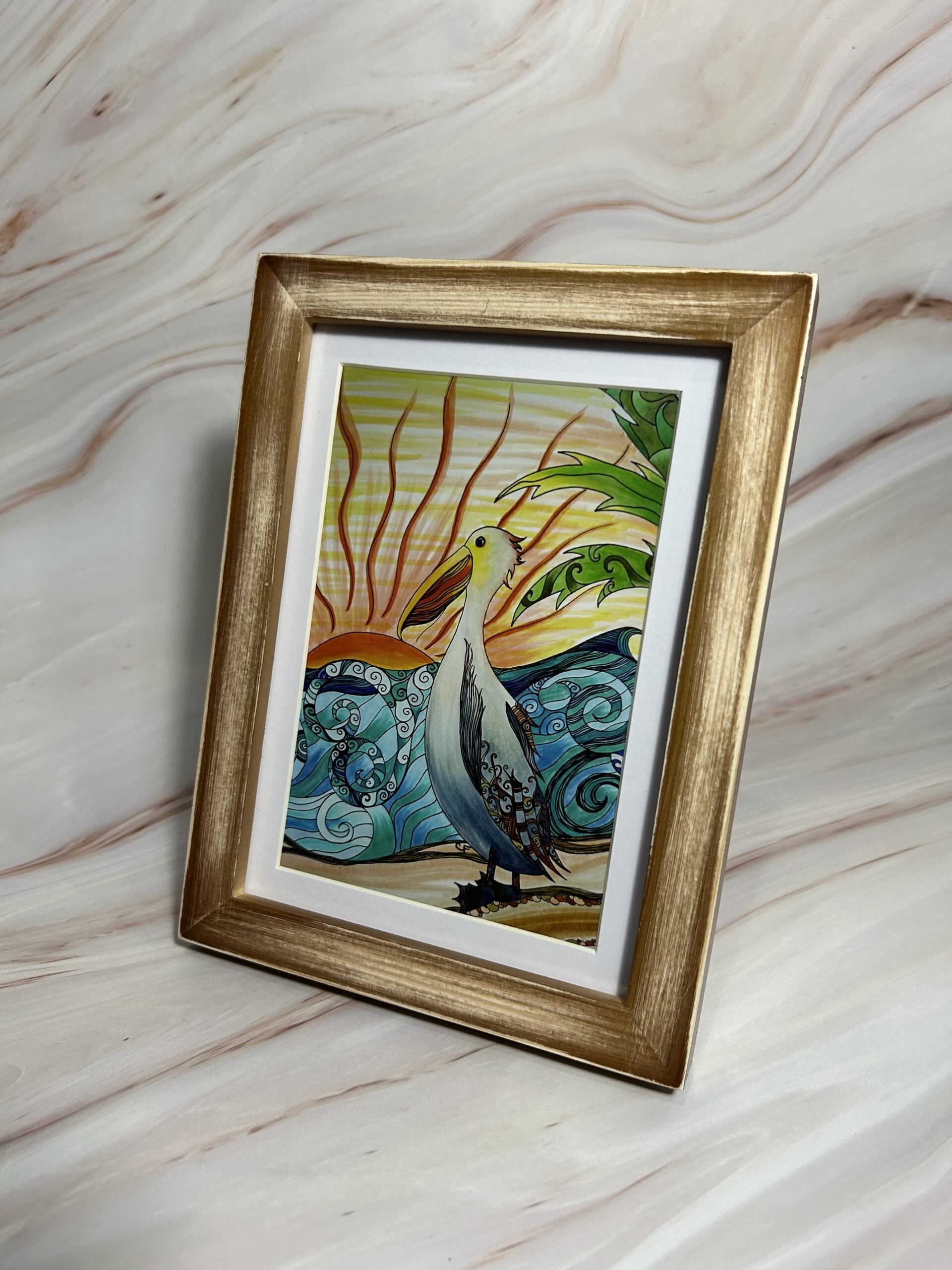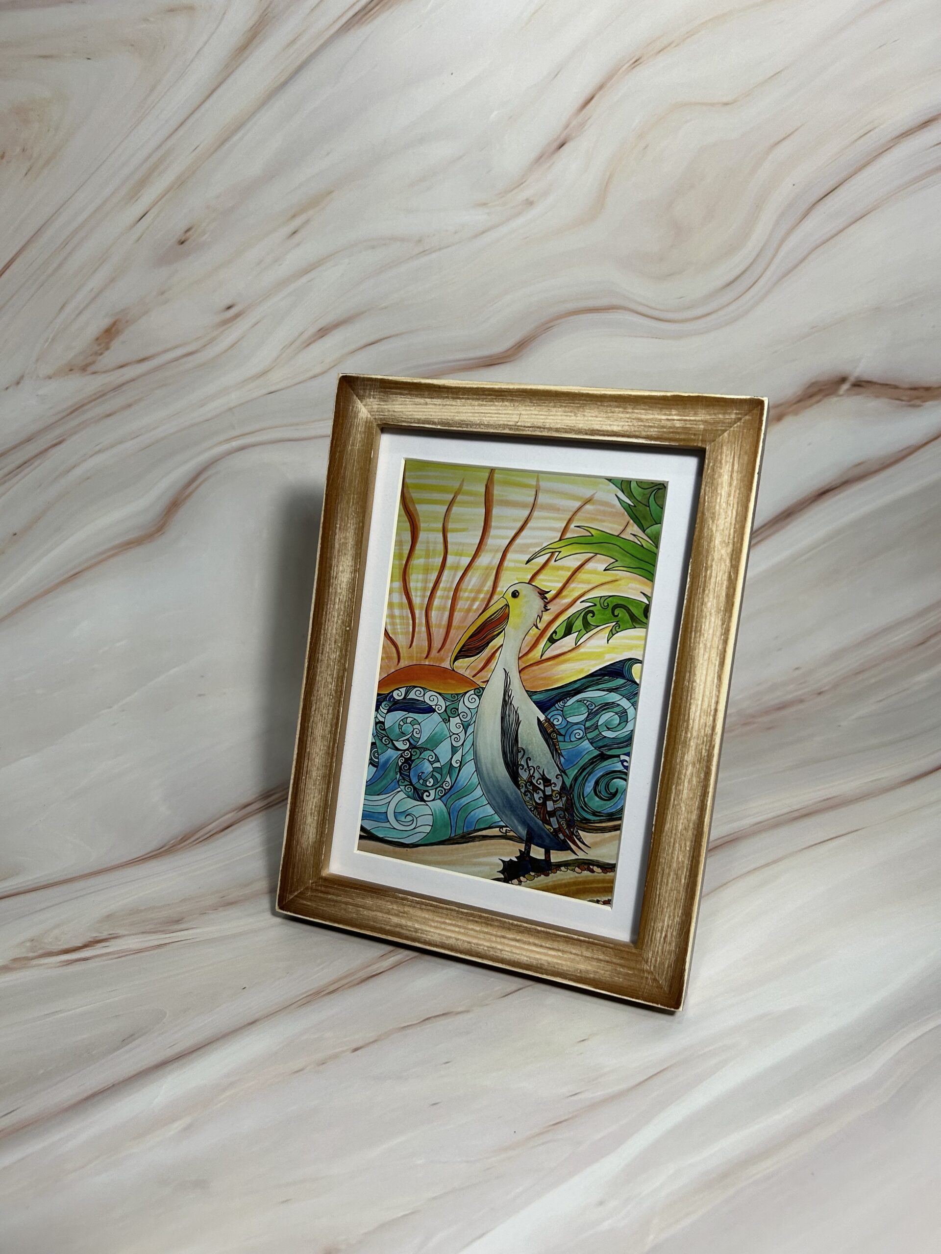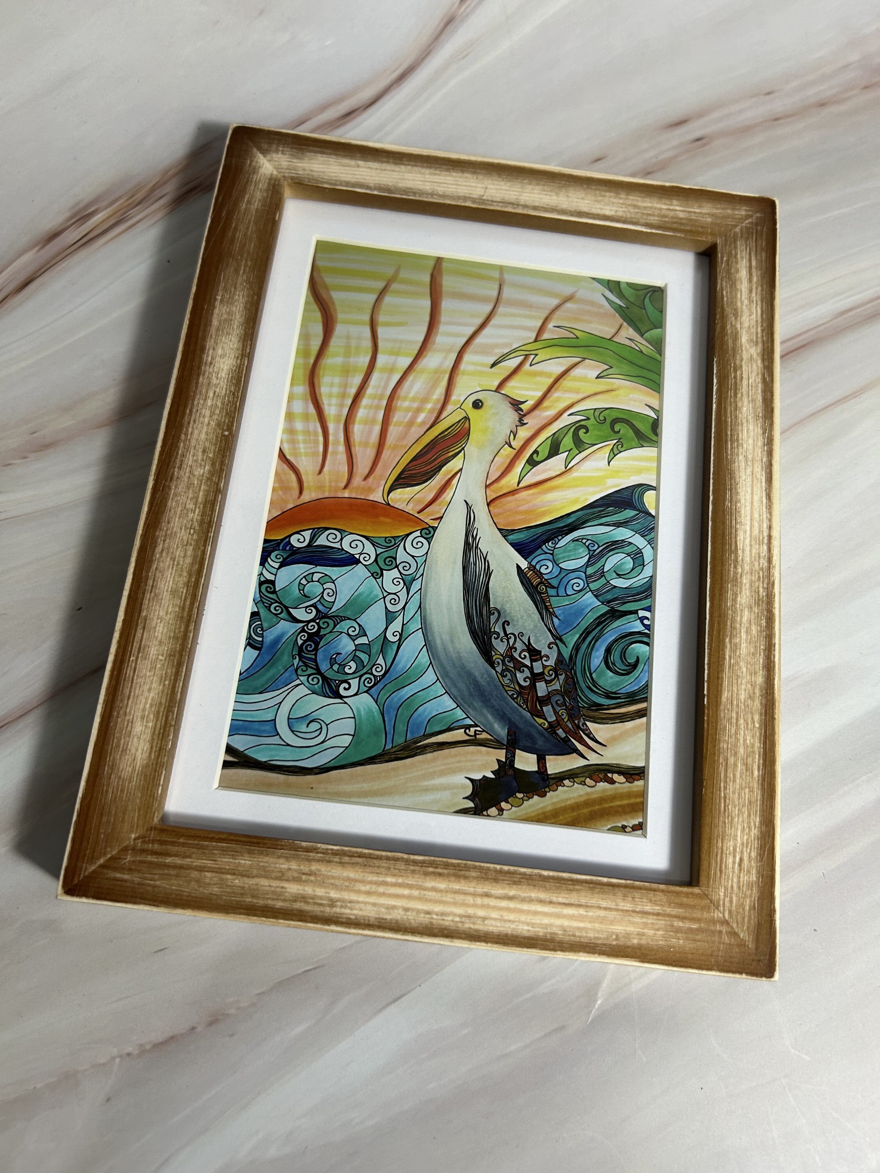 Pelican at sunset art print with distressed wood frame and plexiglass. 5×7