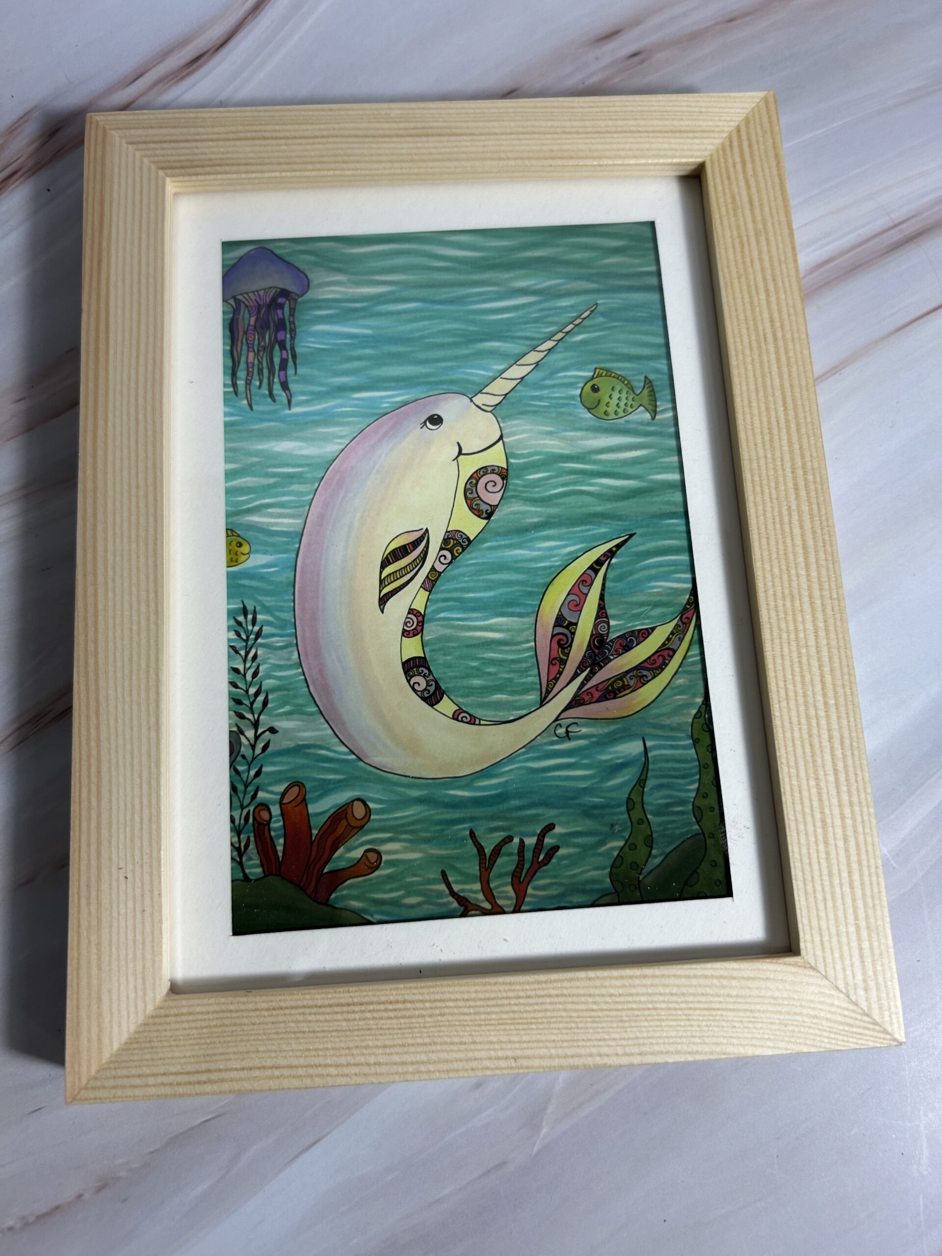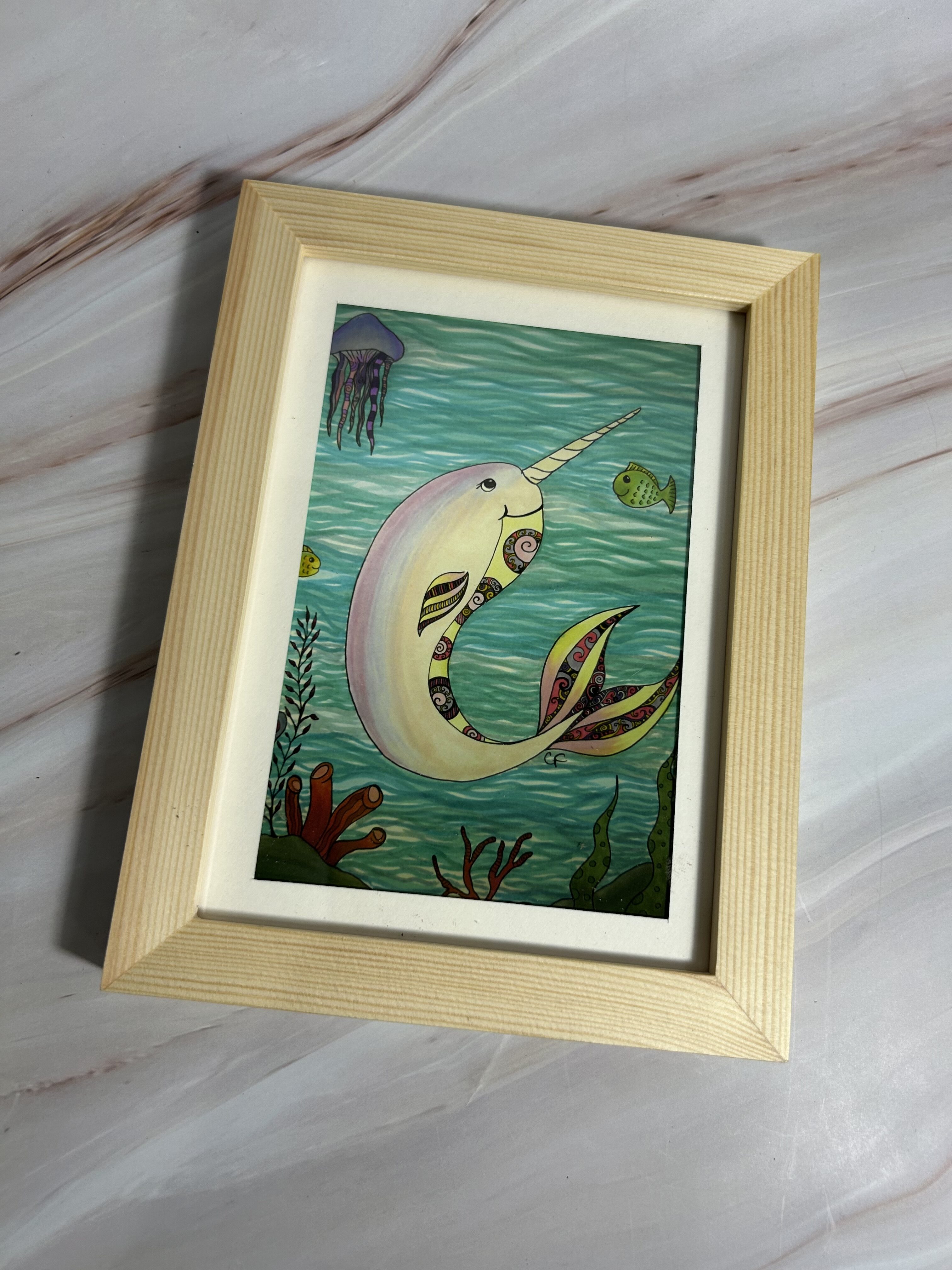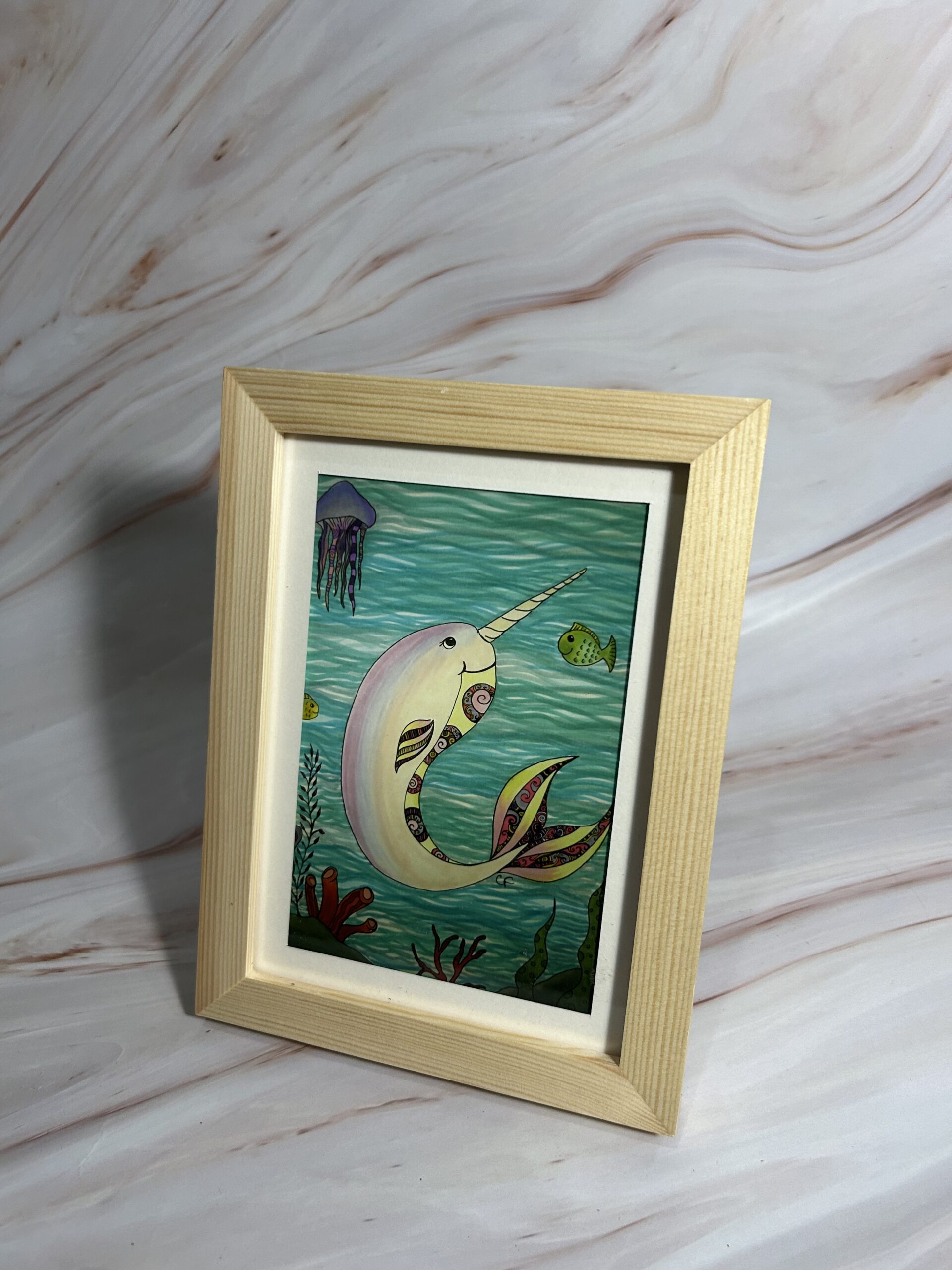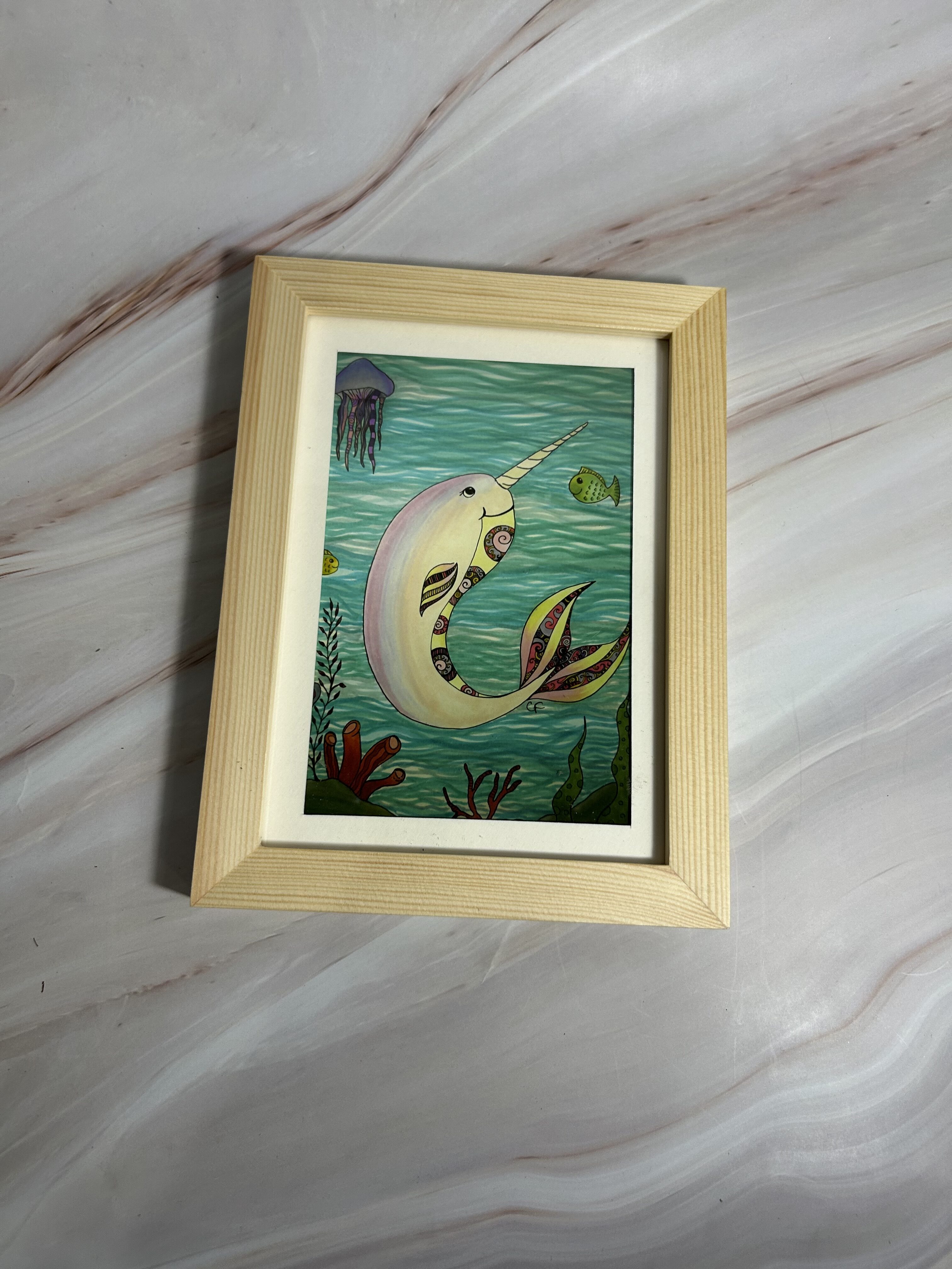 5×7 art print with Narwhal and fish