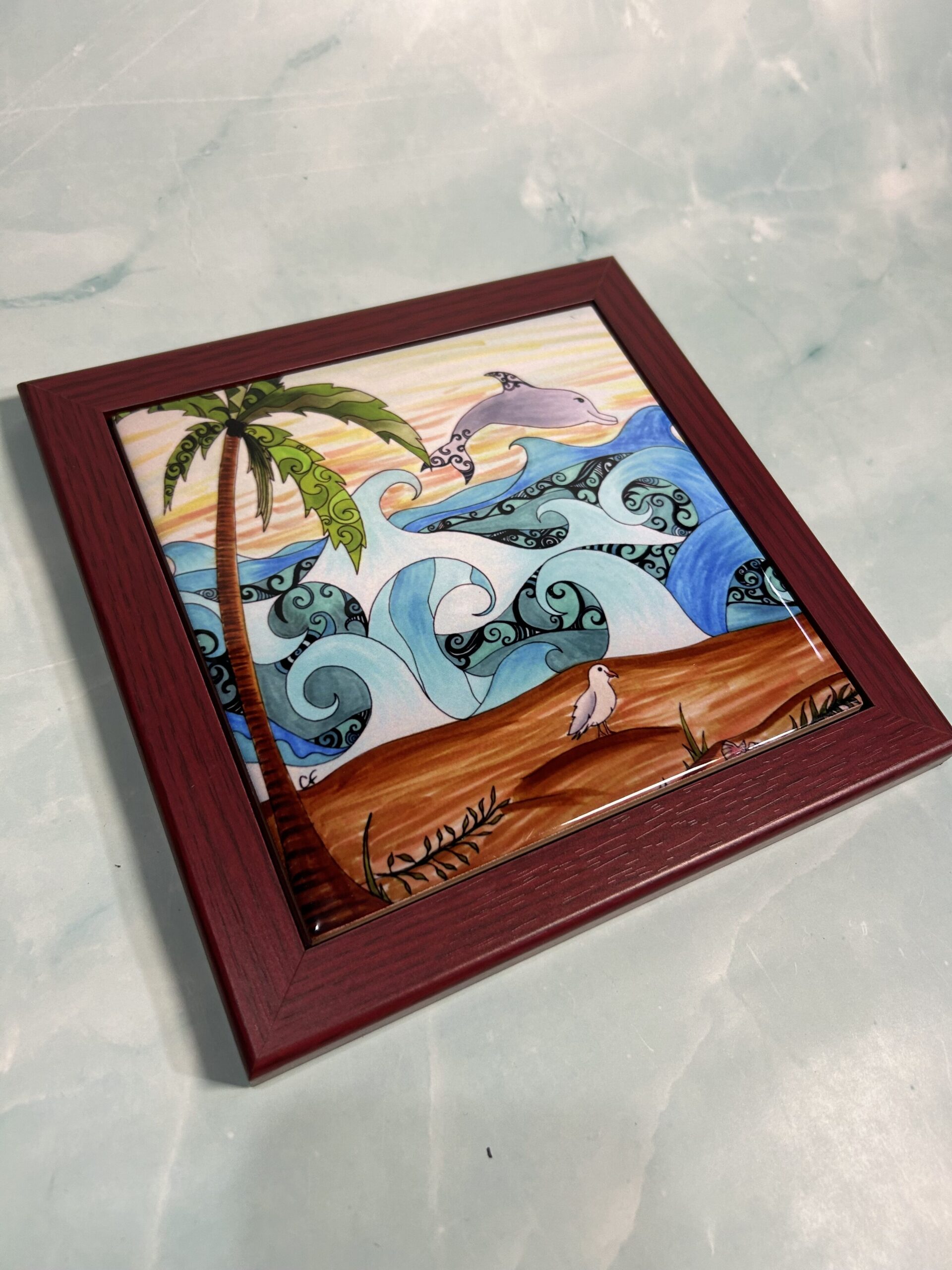 6×6 tile with Dolphin, beach print, wood frame