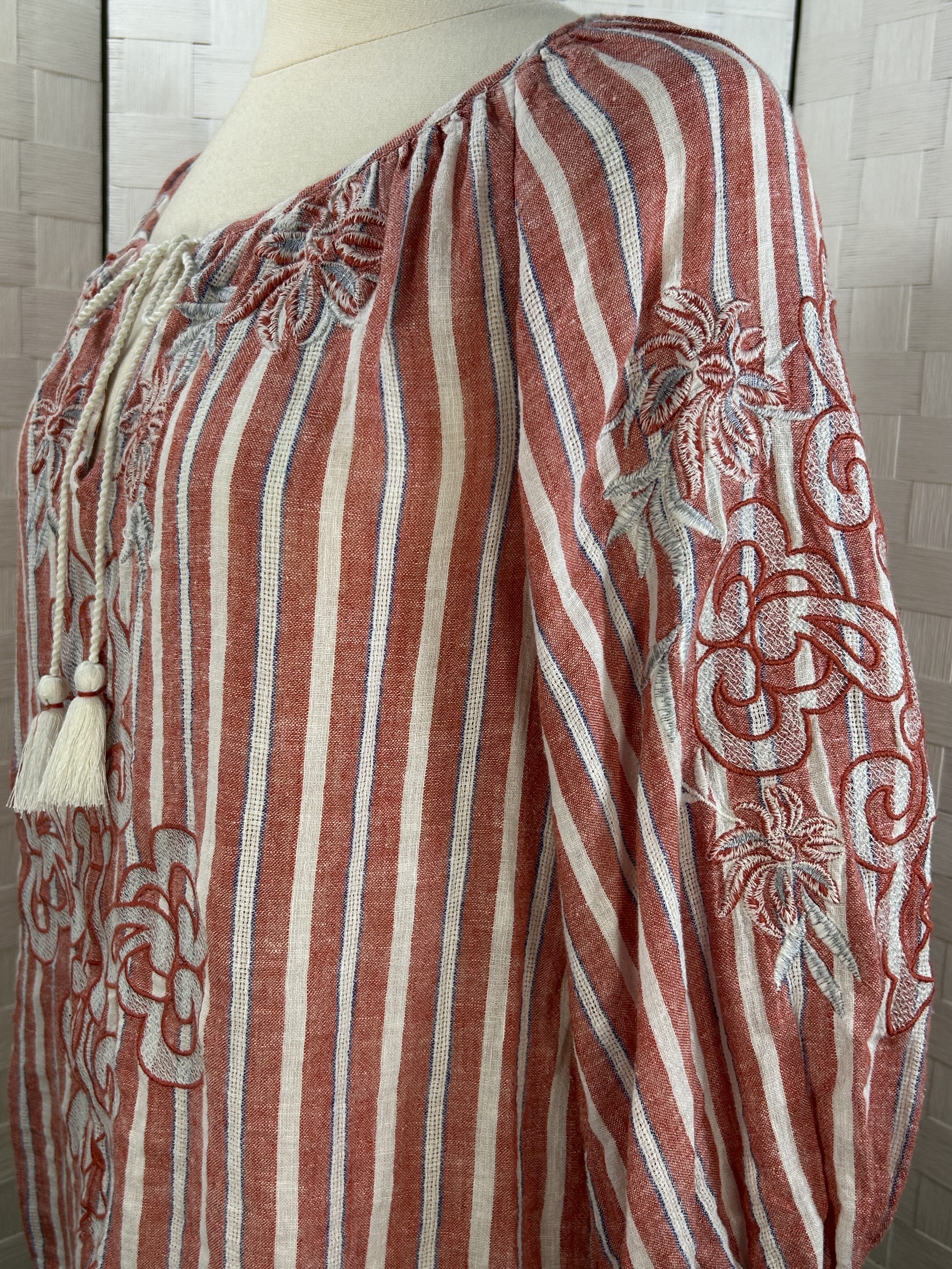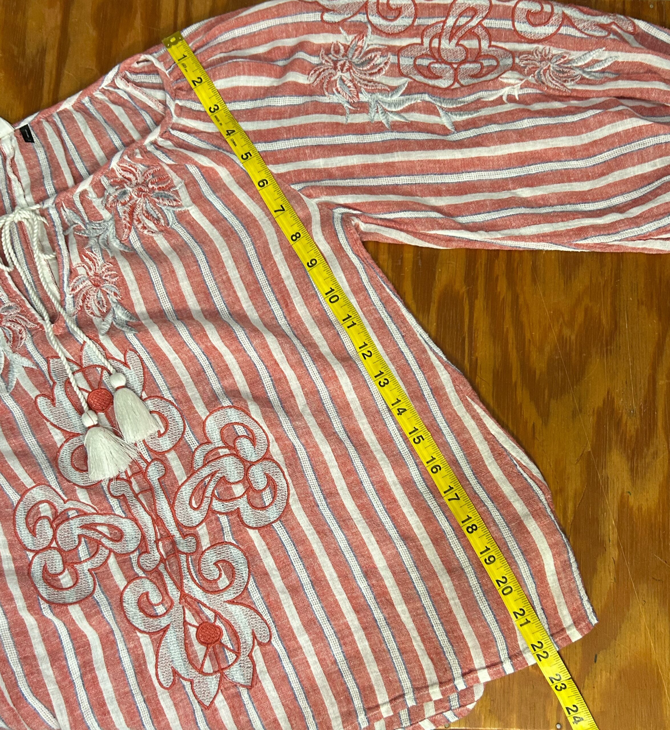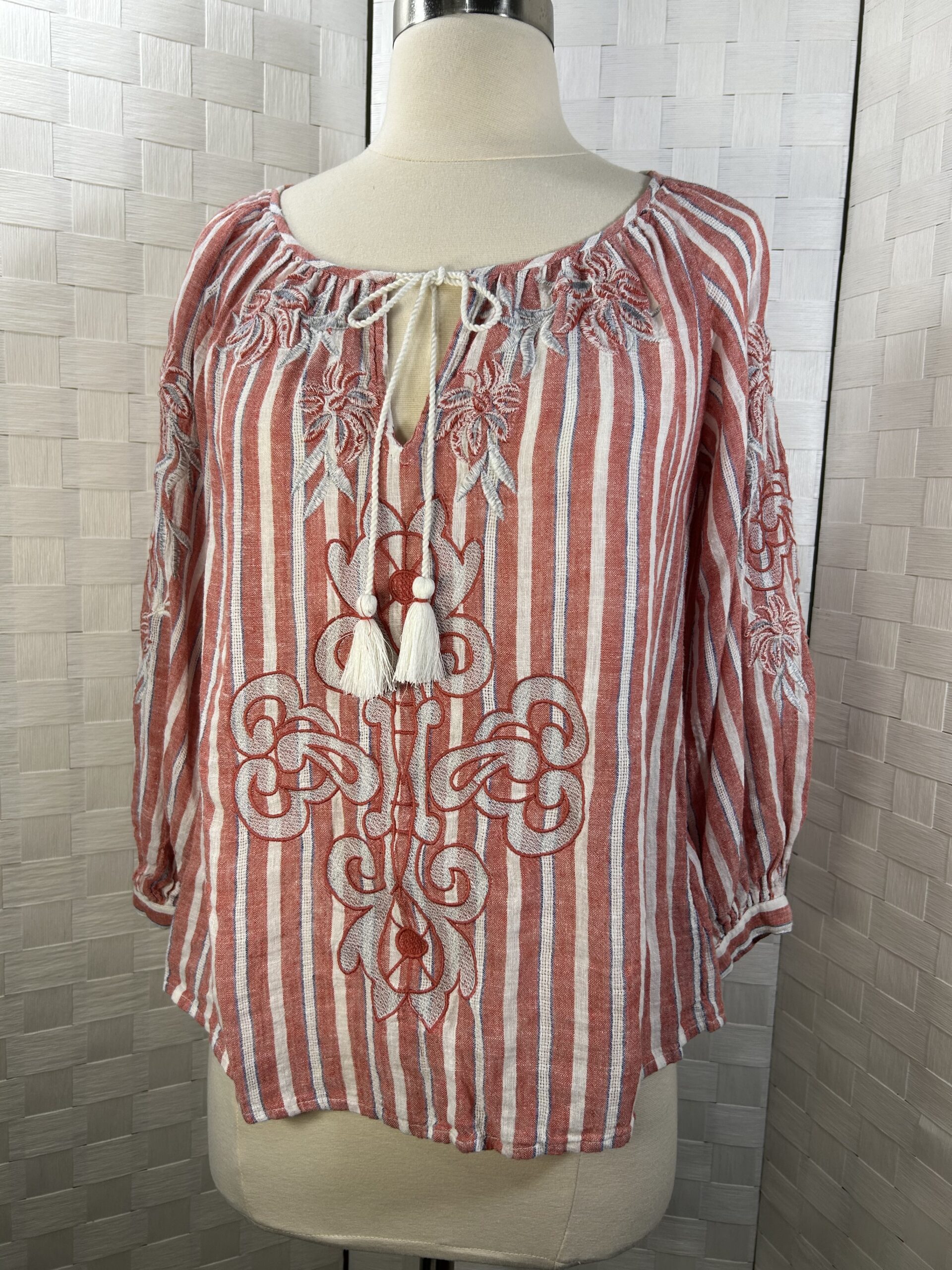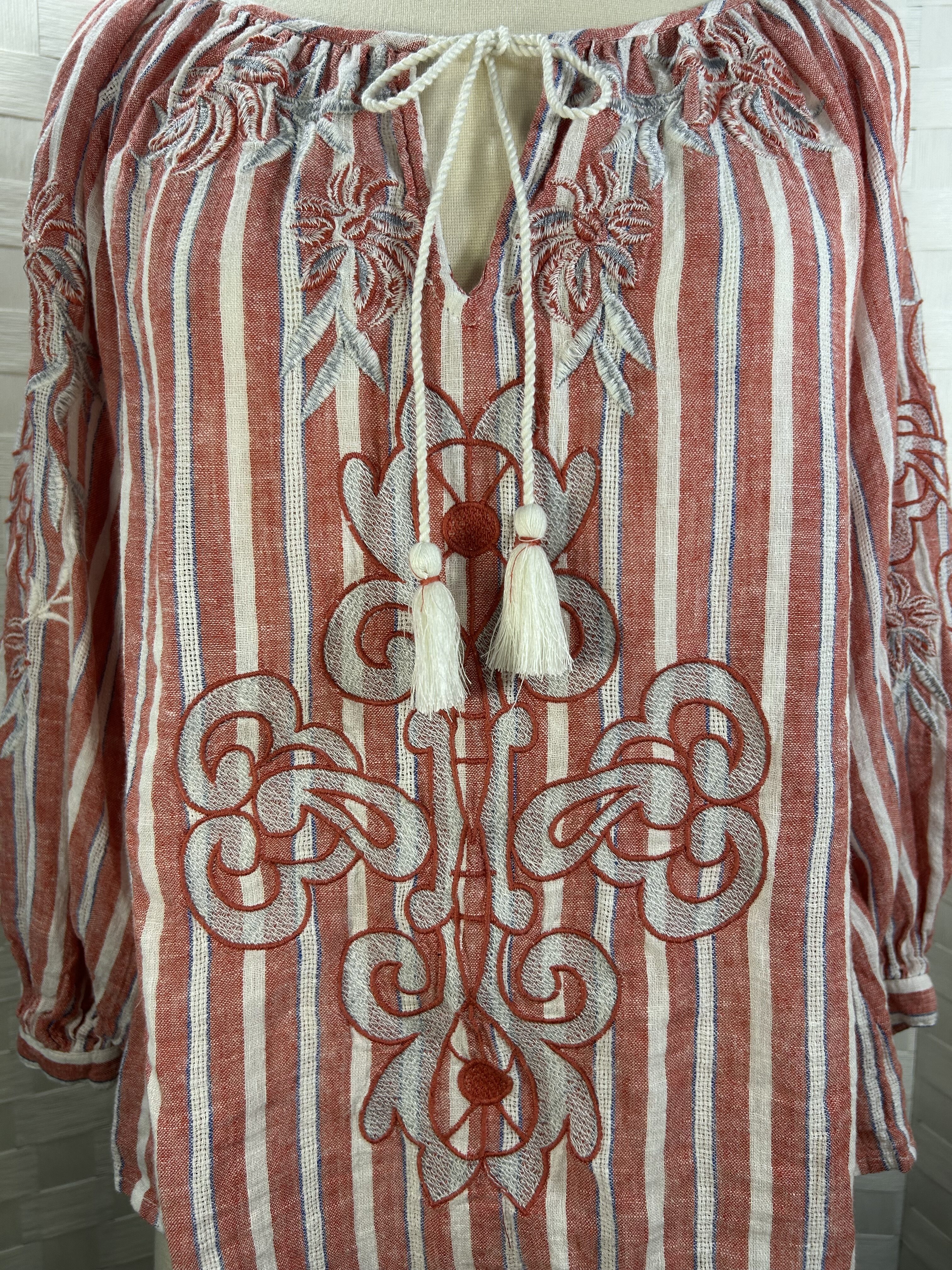 long sleeve blouse with red stripes and white tassels that tie at the neckline. Elastic at sleeve cuffs.