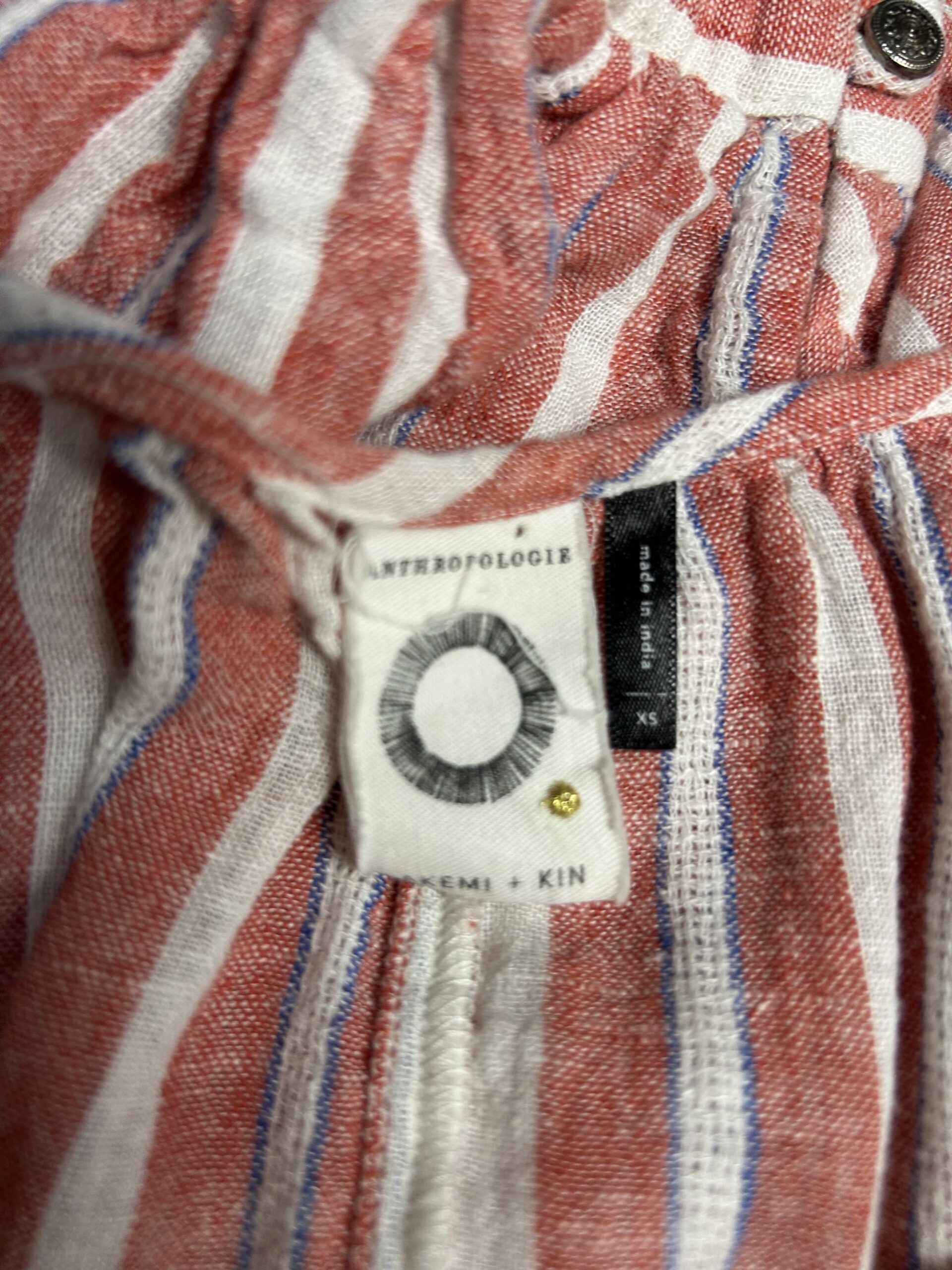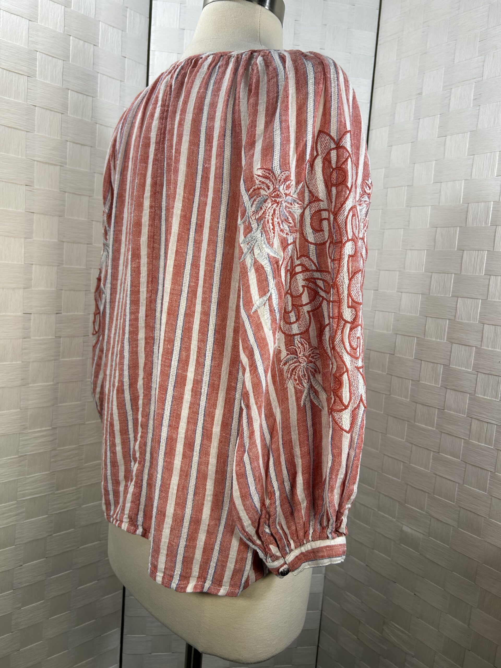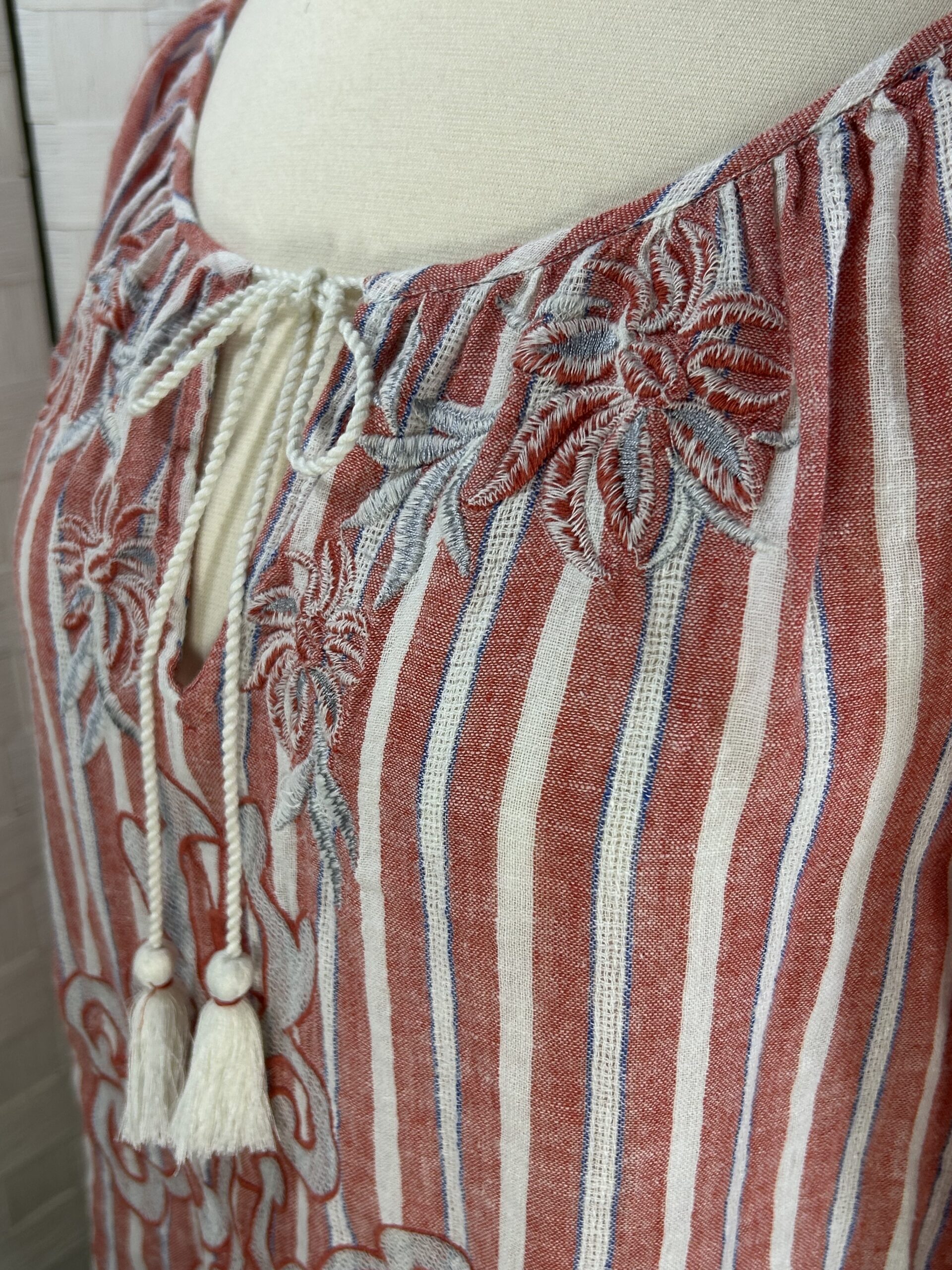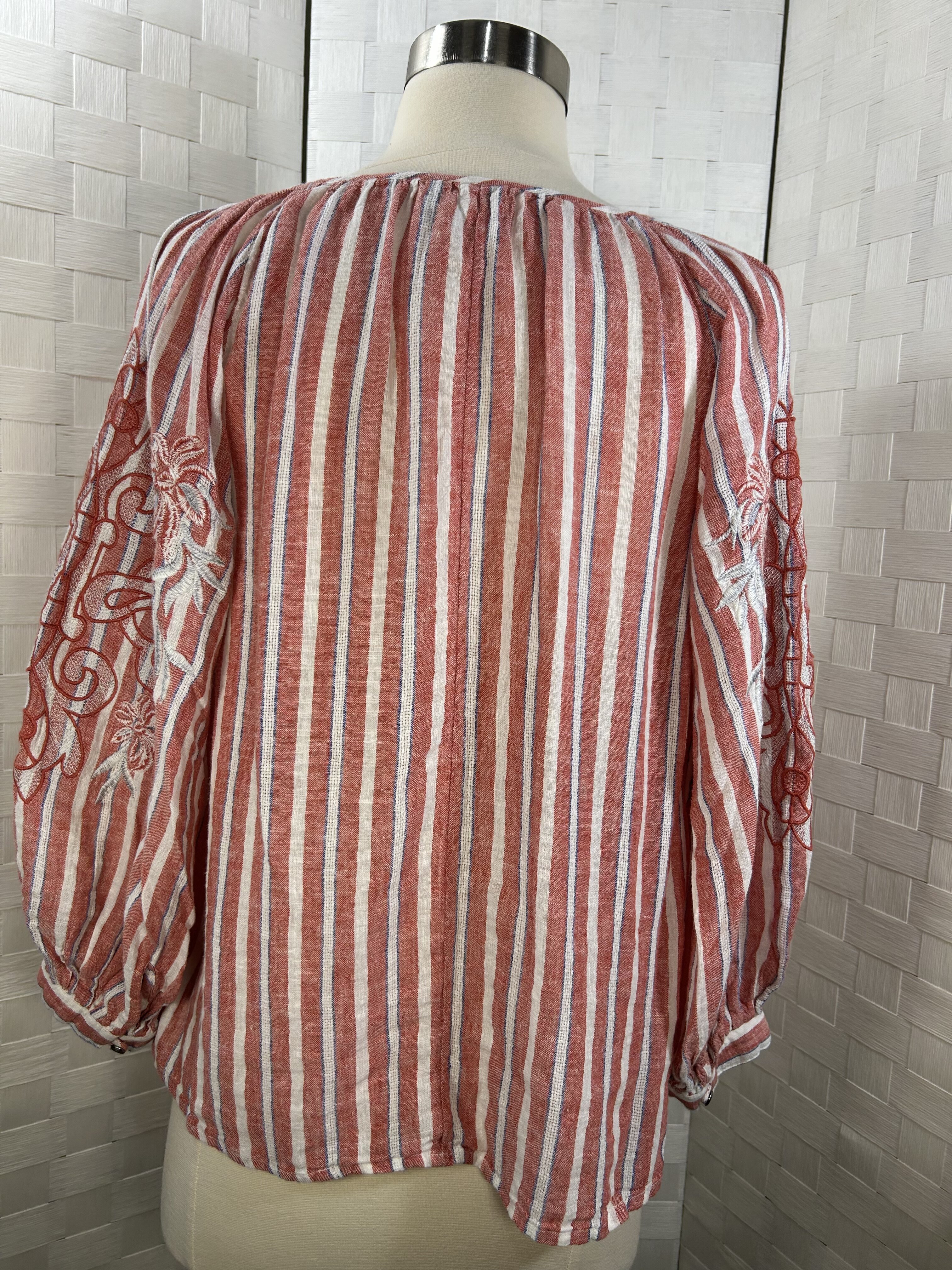 long sleeve blouse with red stripes and white tassels that tie at the neckline. Elastic at sleeve cuffs.