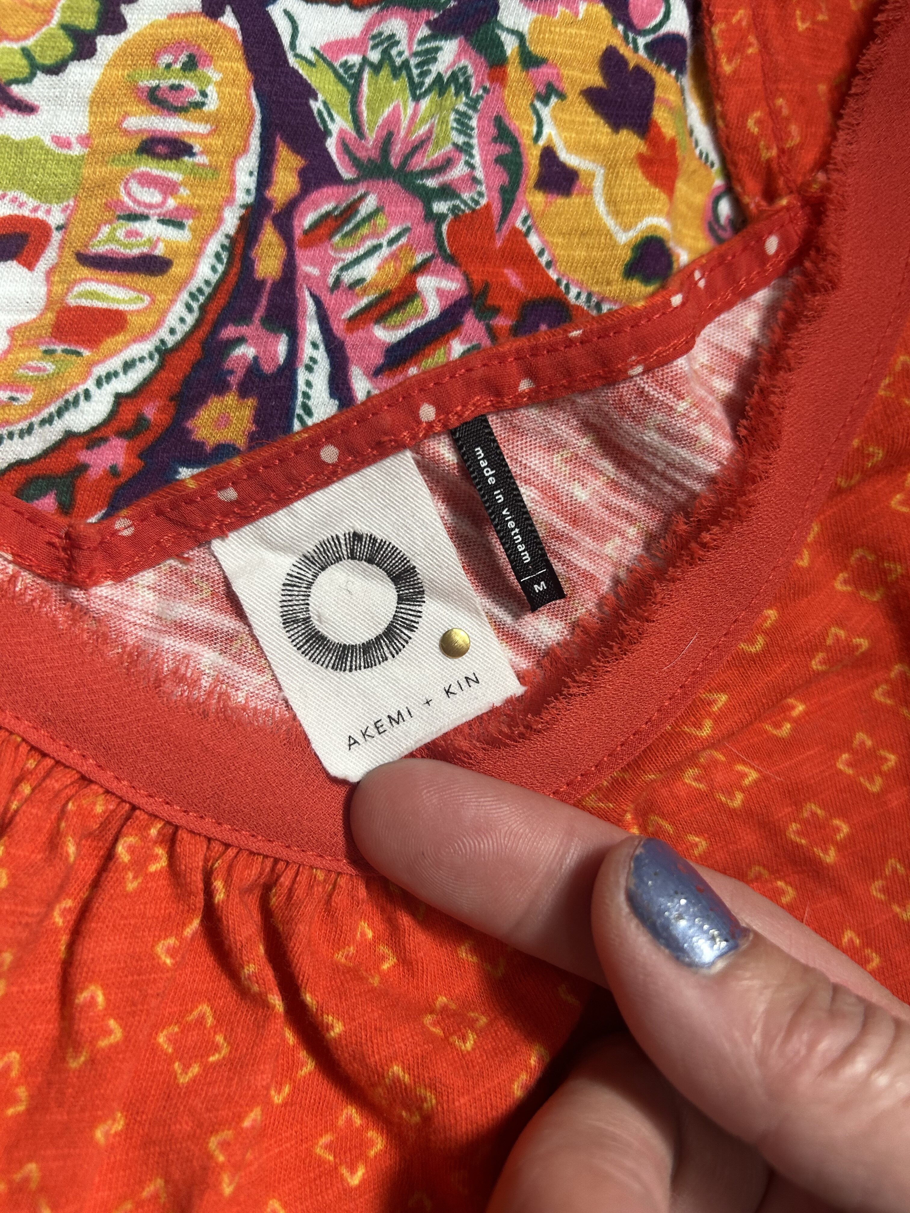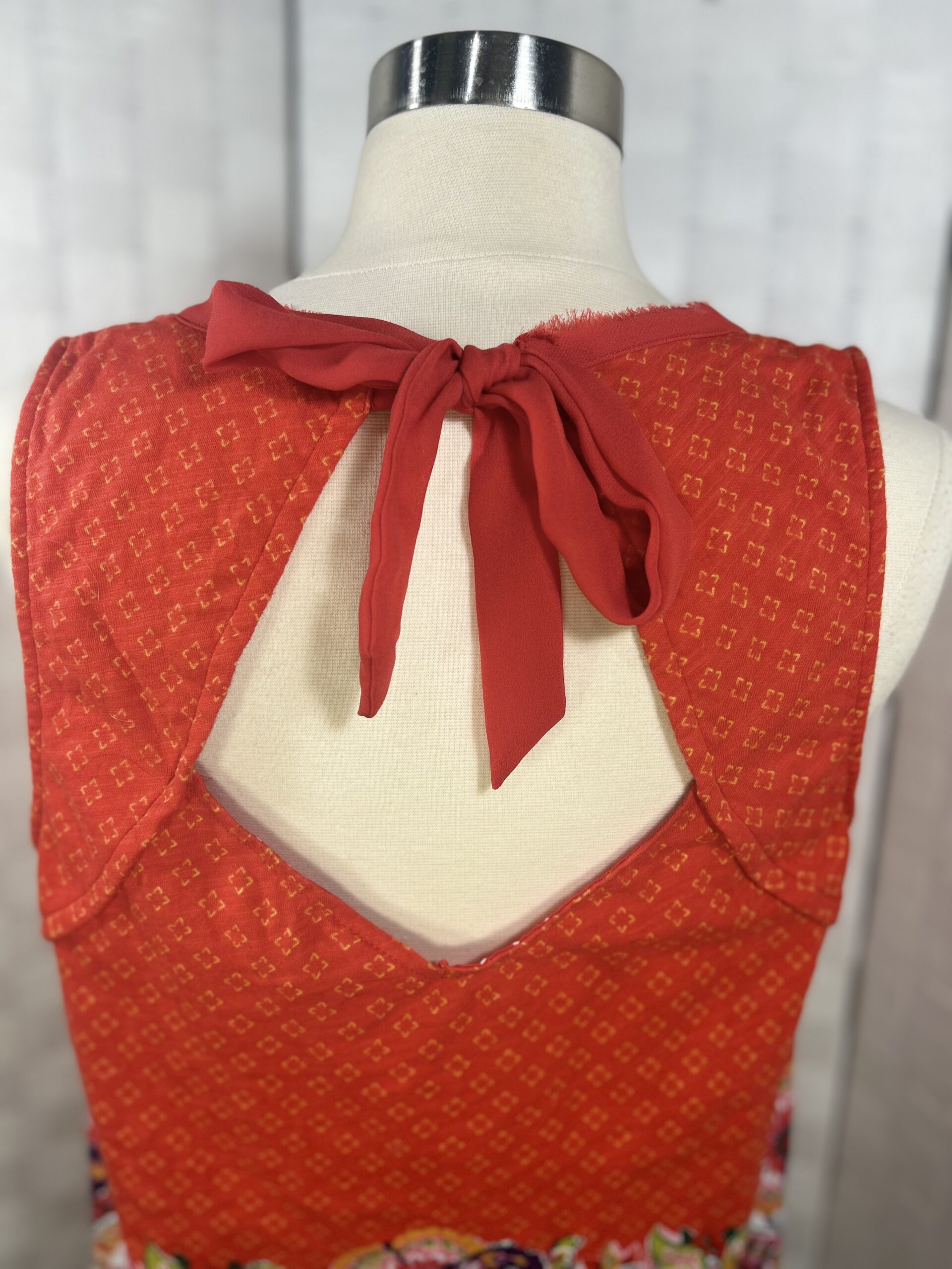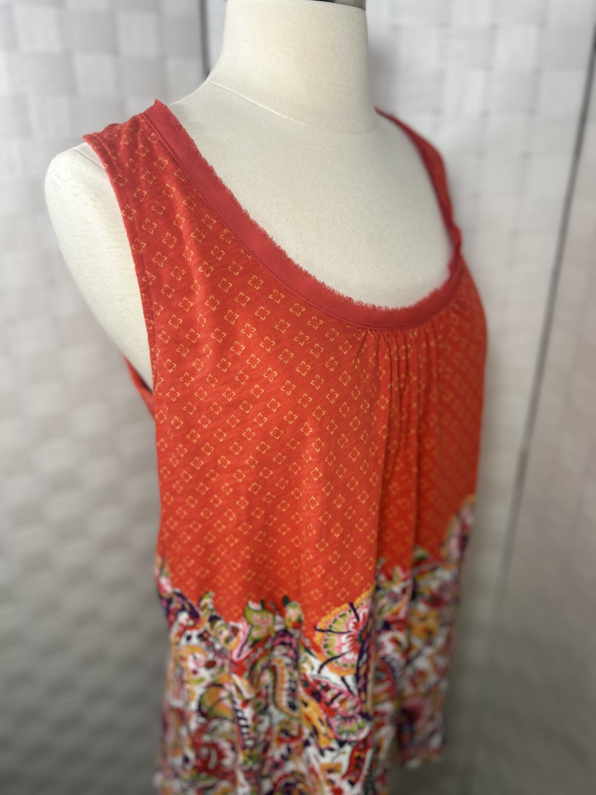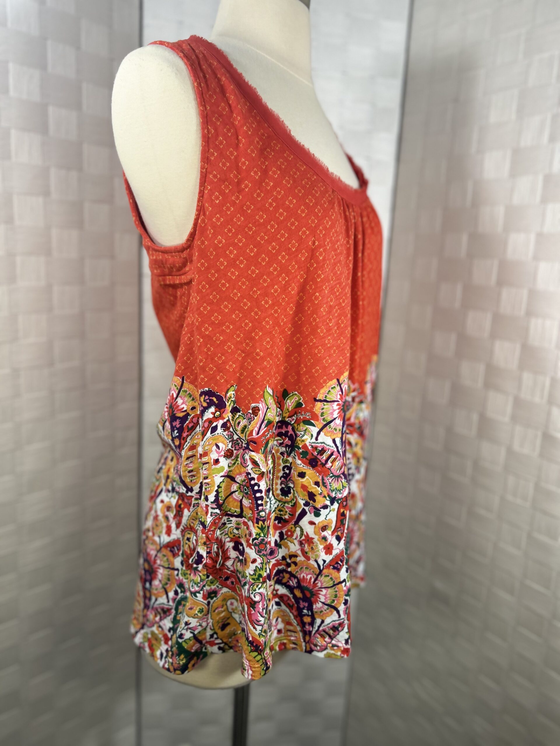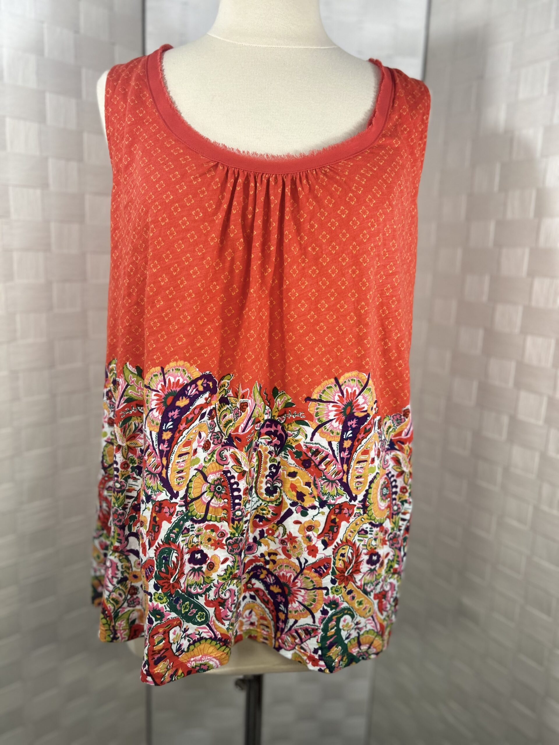 Anthropologie Akemi + Kin Rosae sleeveless top- Bright multi colored top mixed pattern dark red orange with diamond pattern and bright paisley.