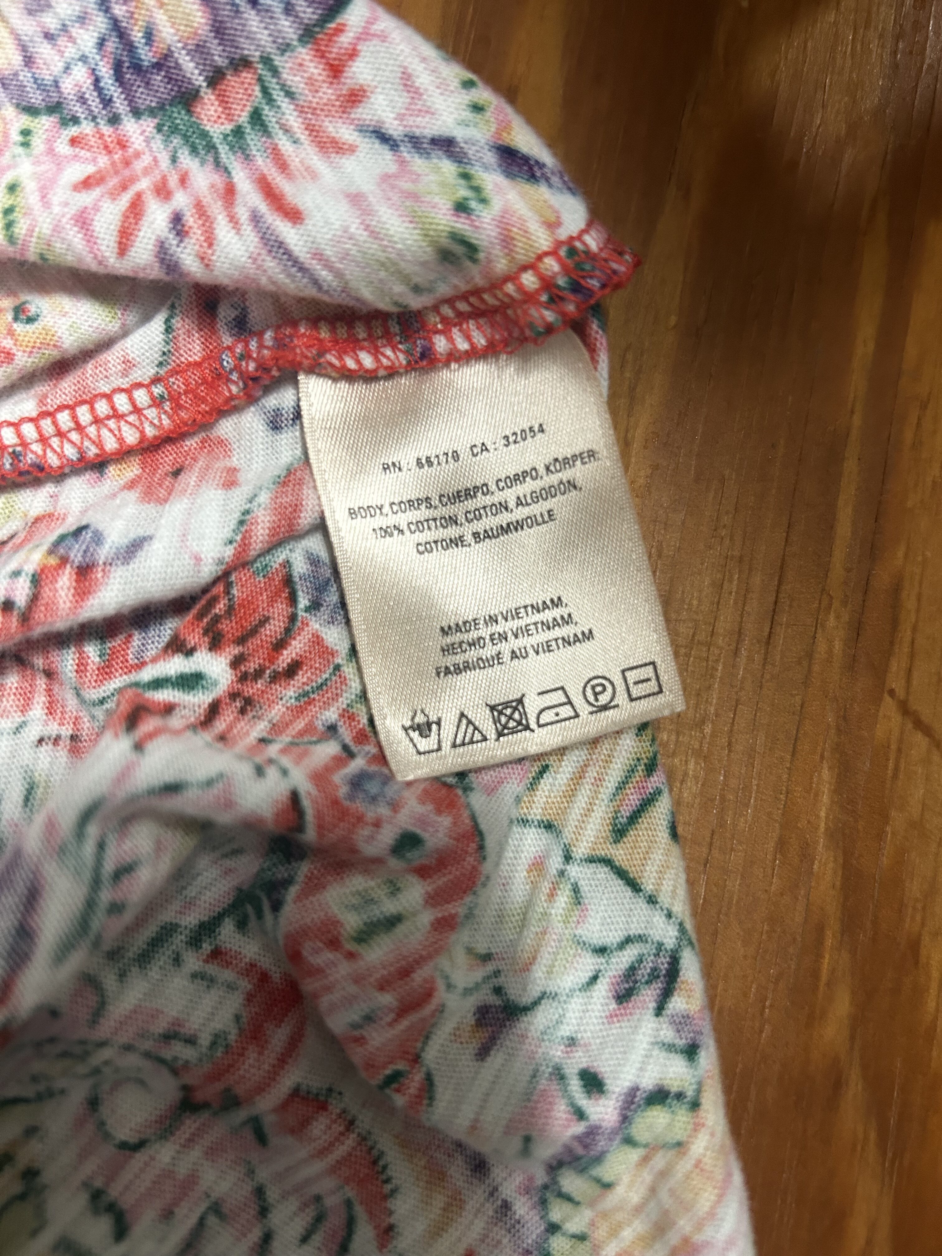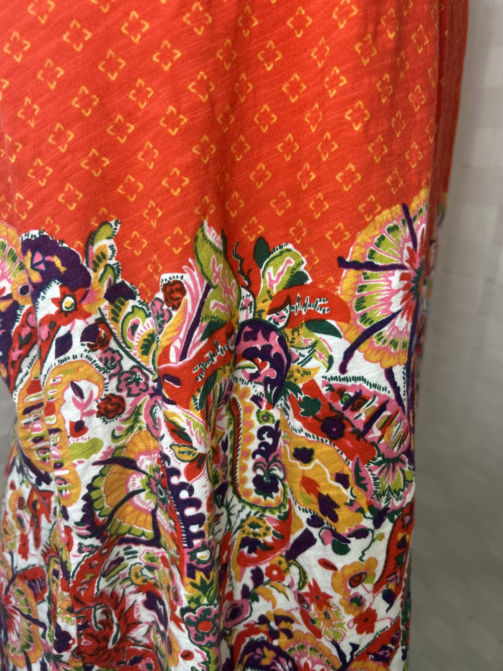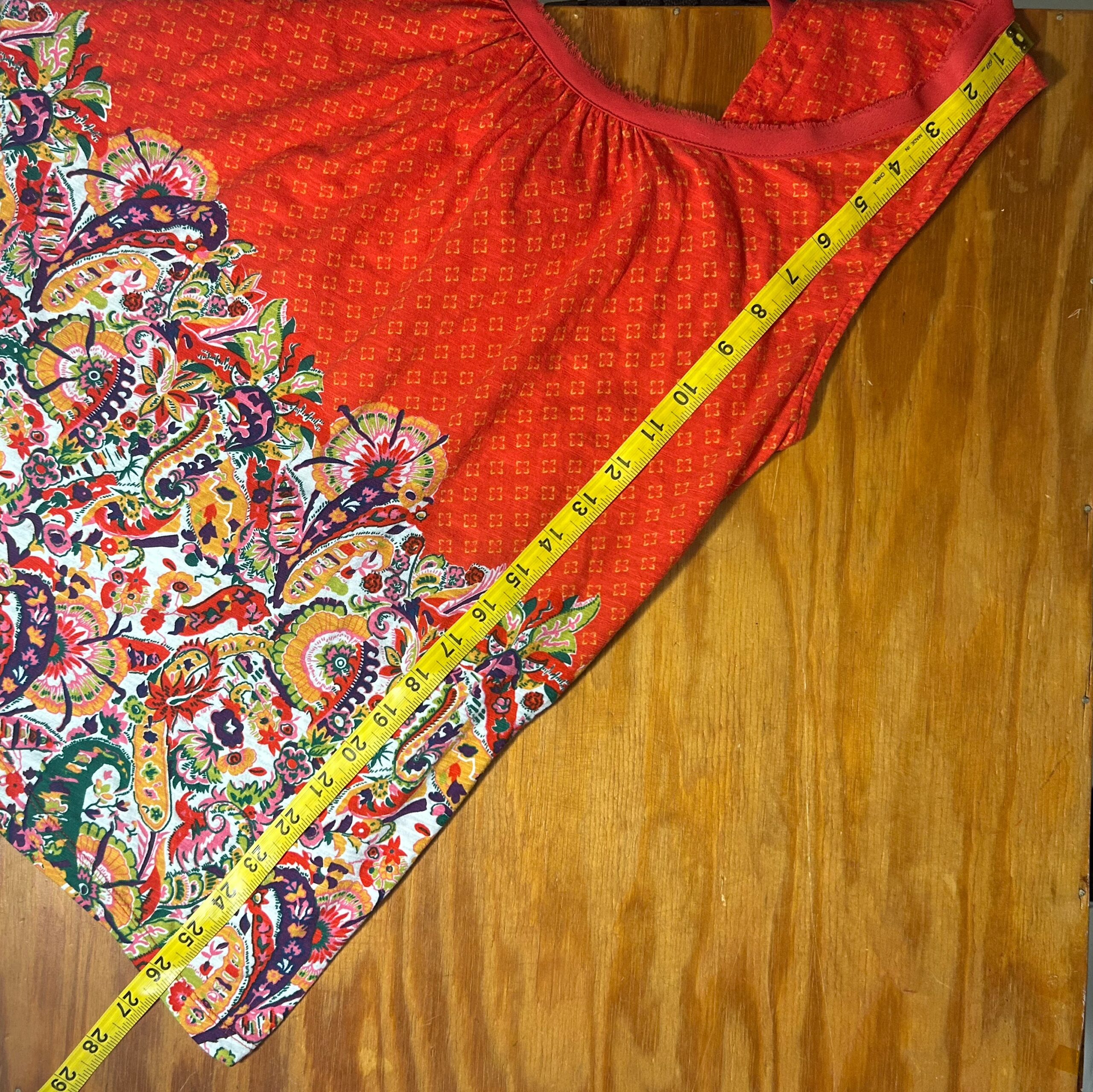 Size Medium (runs a bit large) measures “18 across the bust-line when laid flat and is 26” long from the top of the shoulder to hem. Excellent used condition.