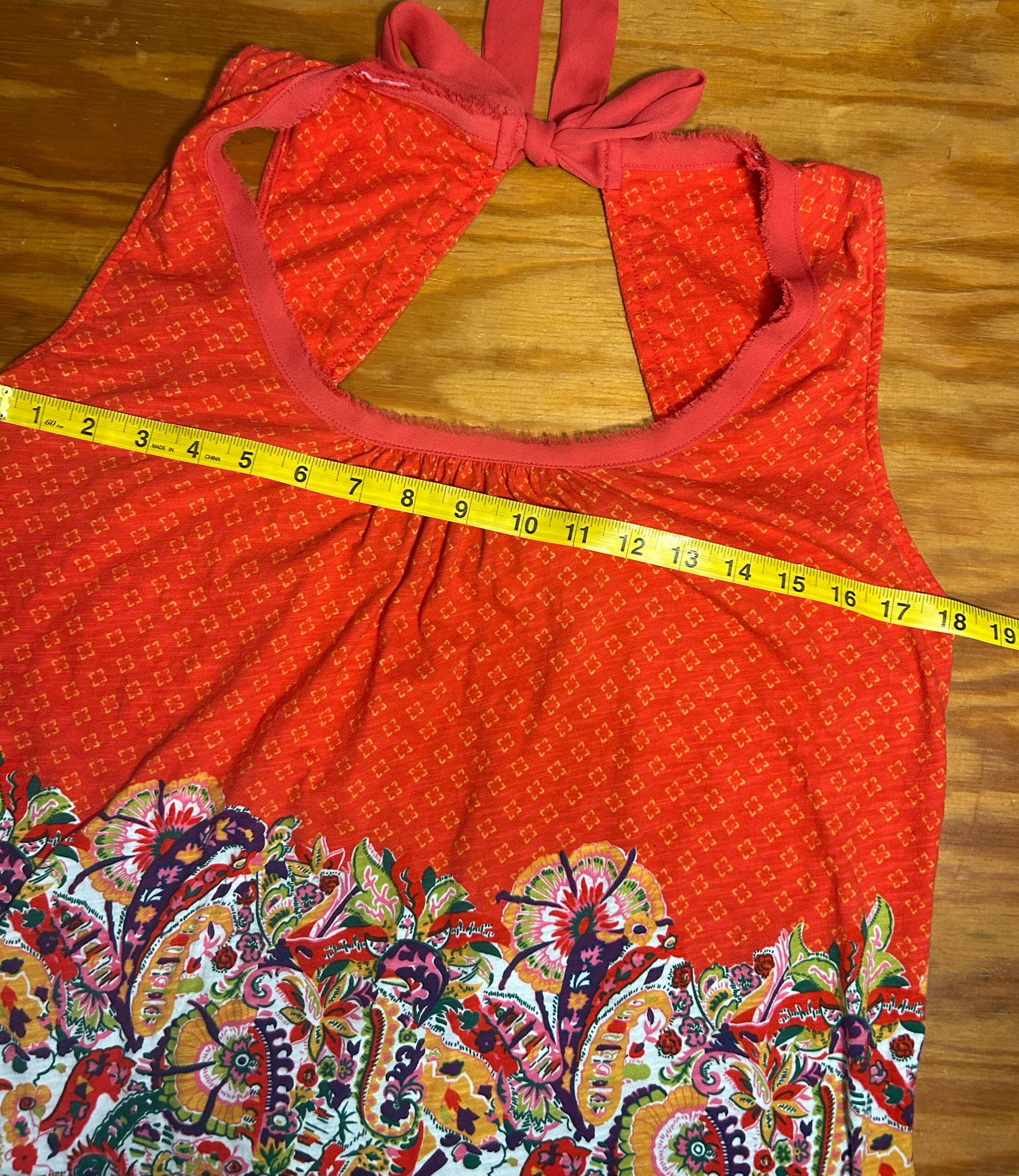 Deep scoop neckline. Ties at back of the neck.