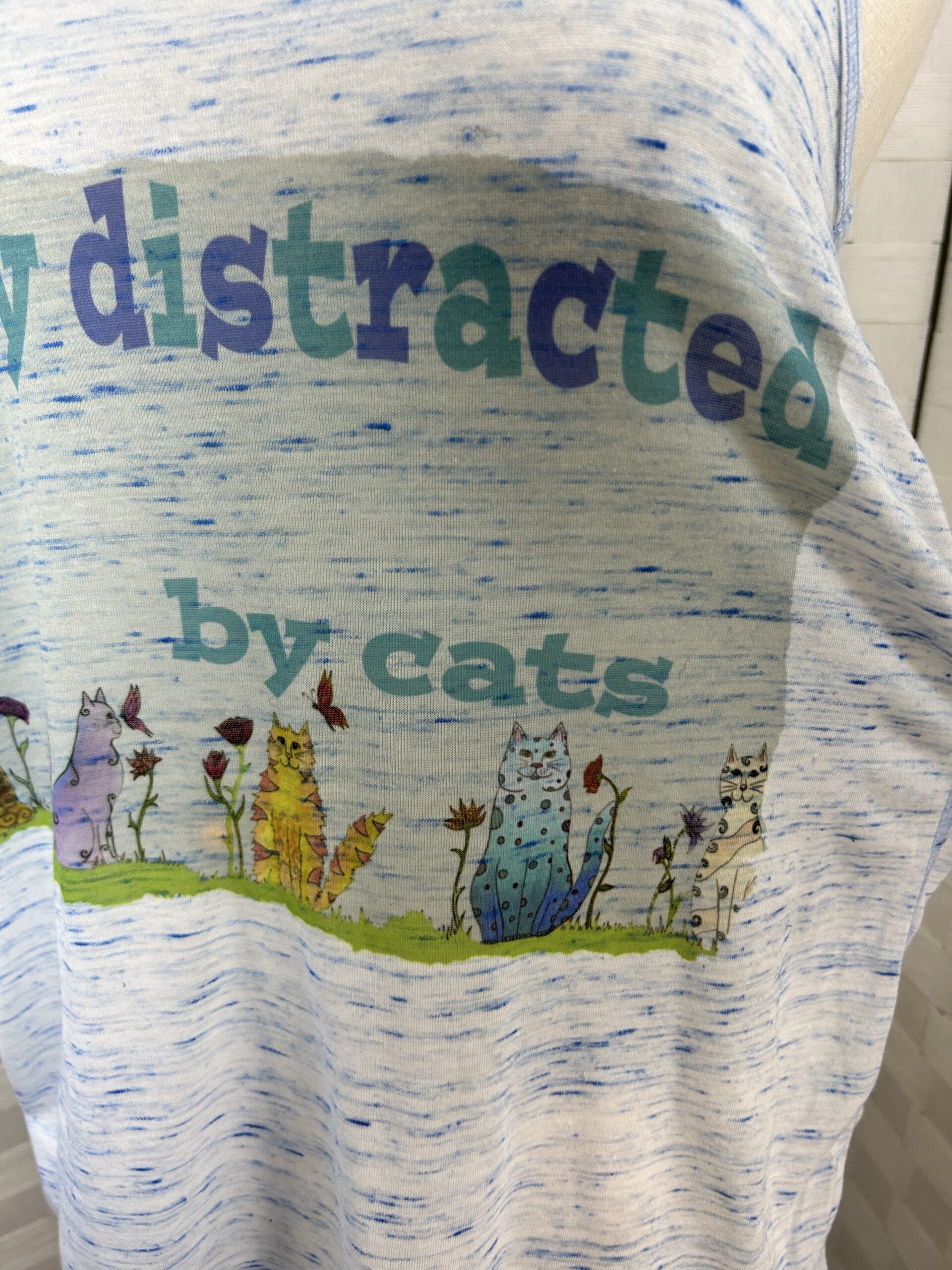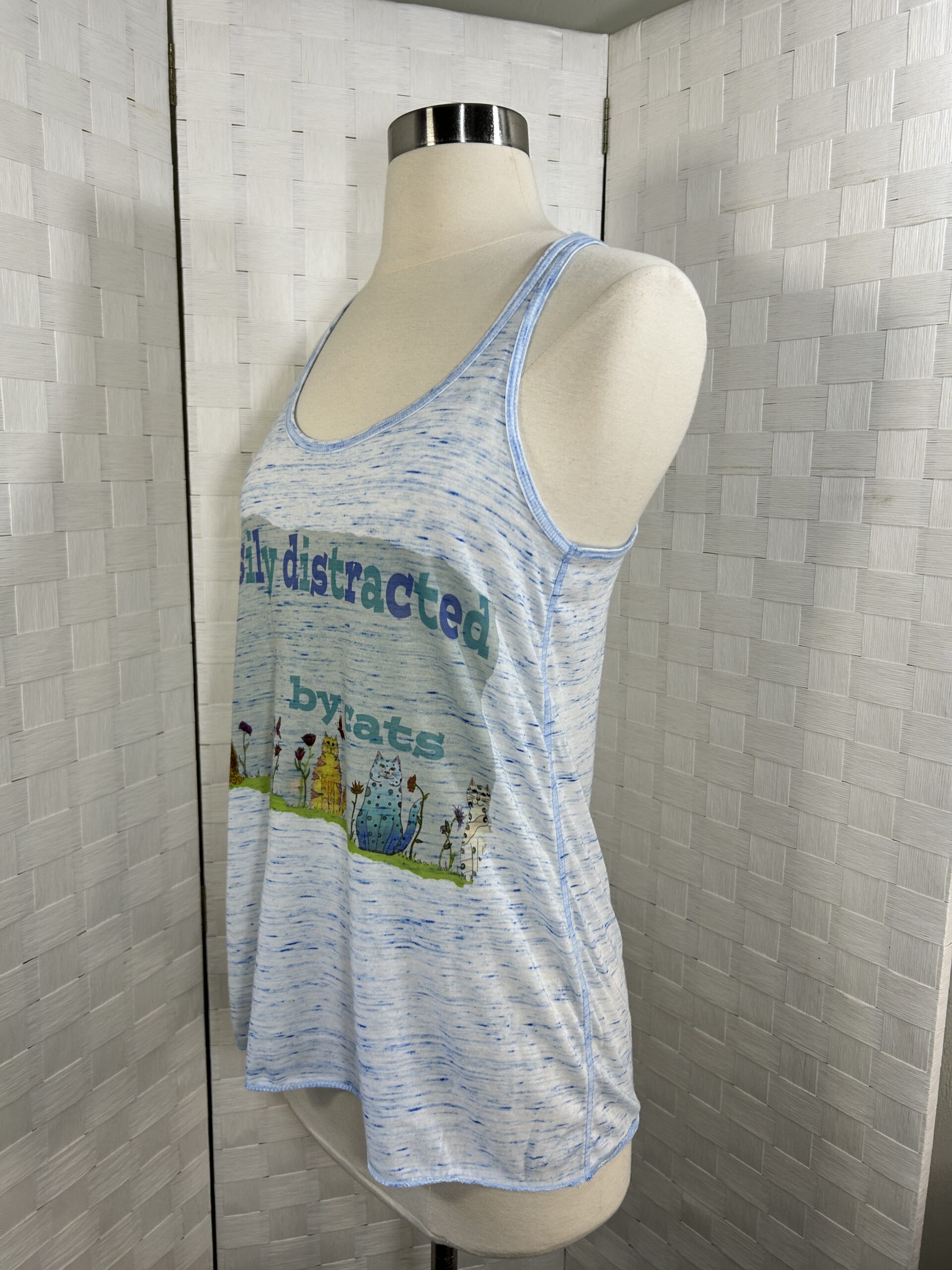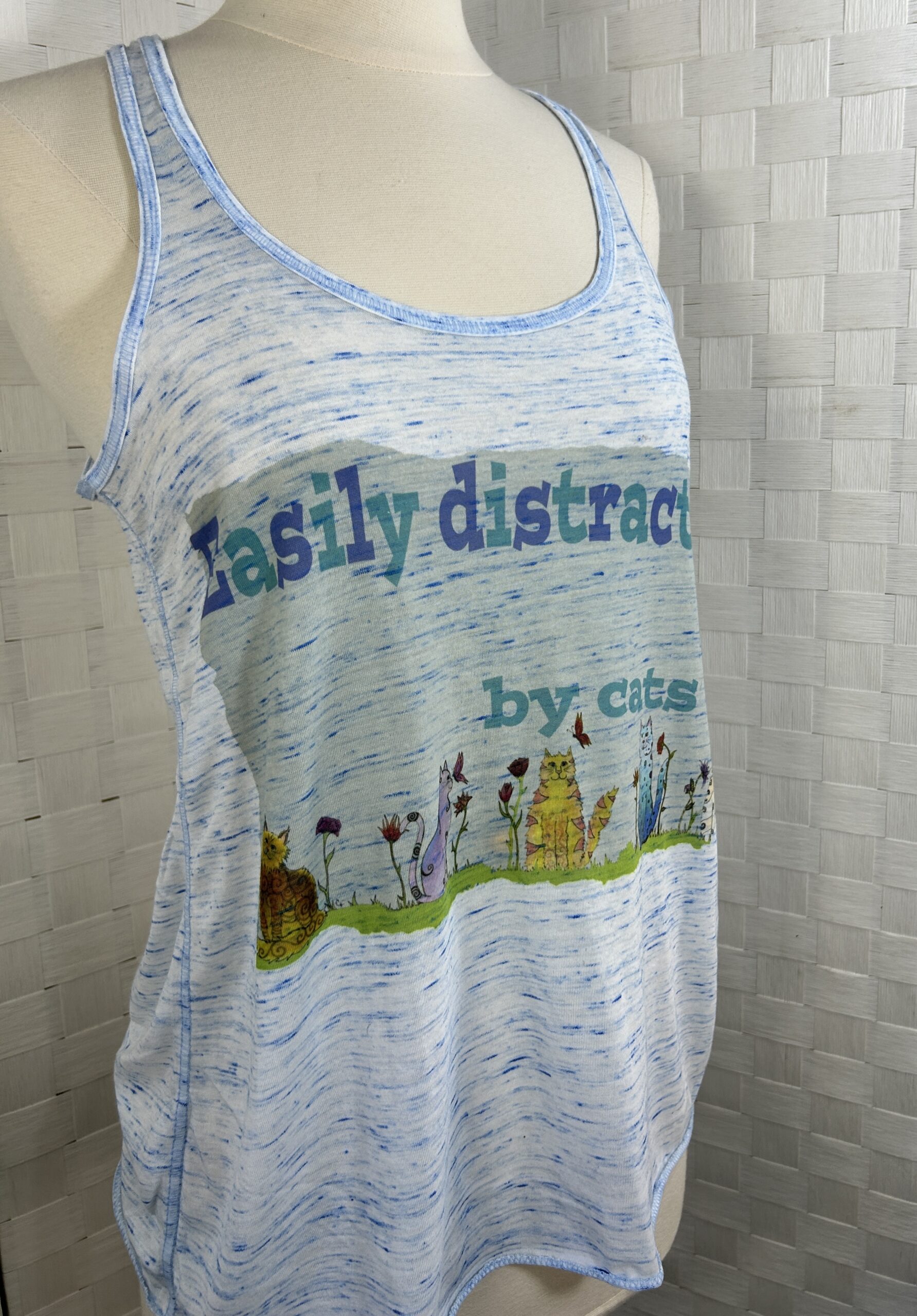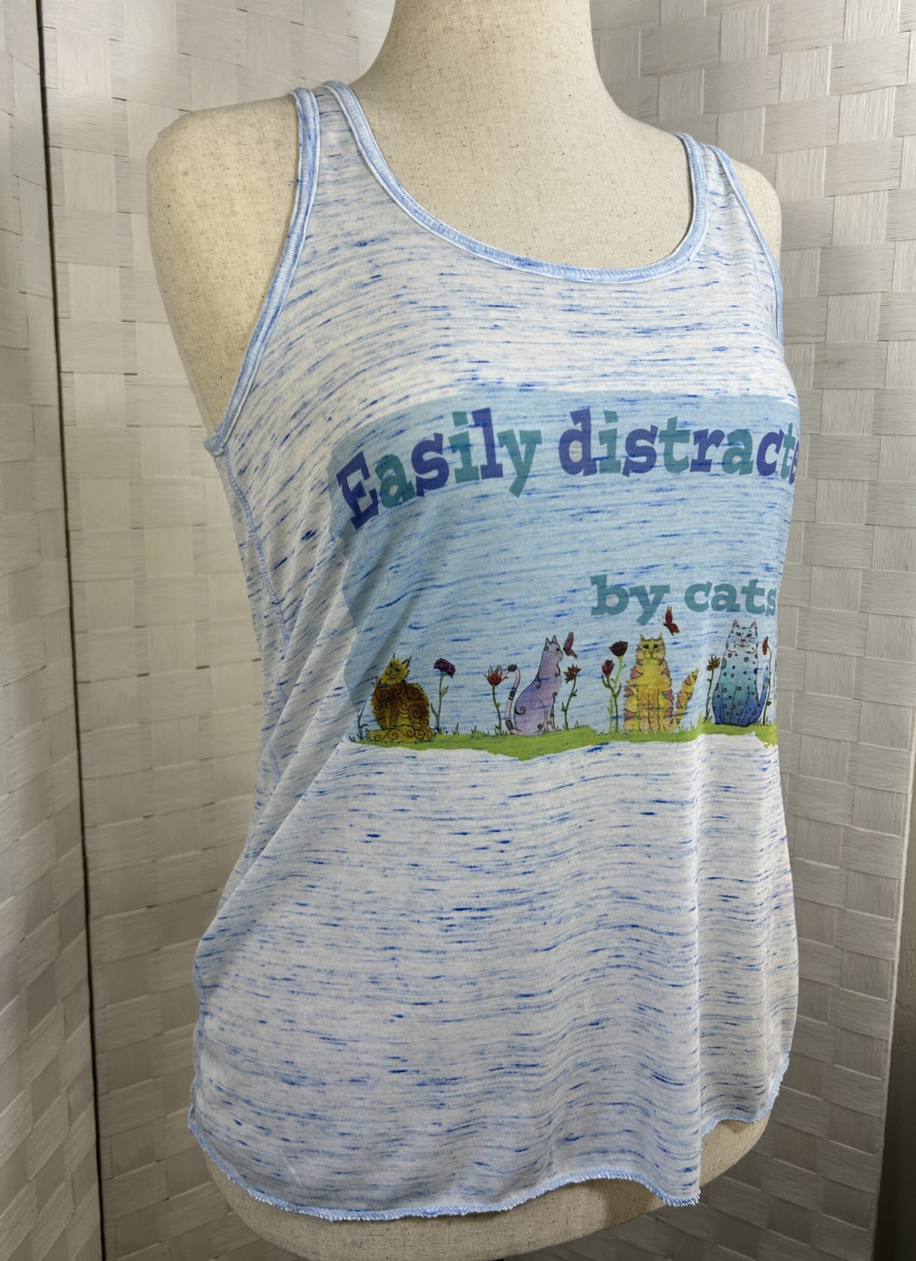 Bella Canvas Flowy racerback tank top- marbled blue and white color with a sublimation print made with my original artwork/design “Easily Distracted by Cats”