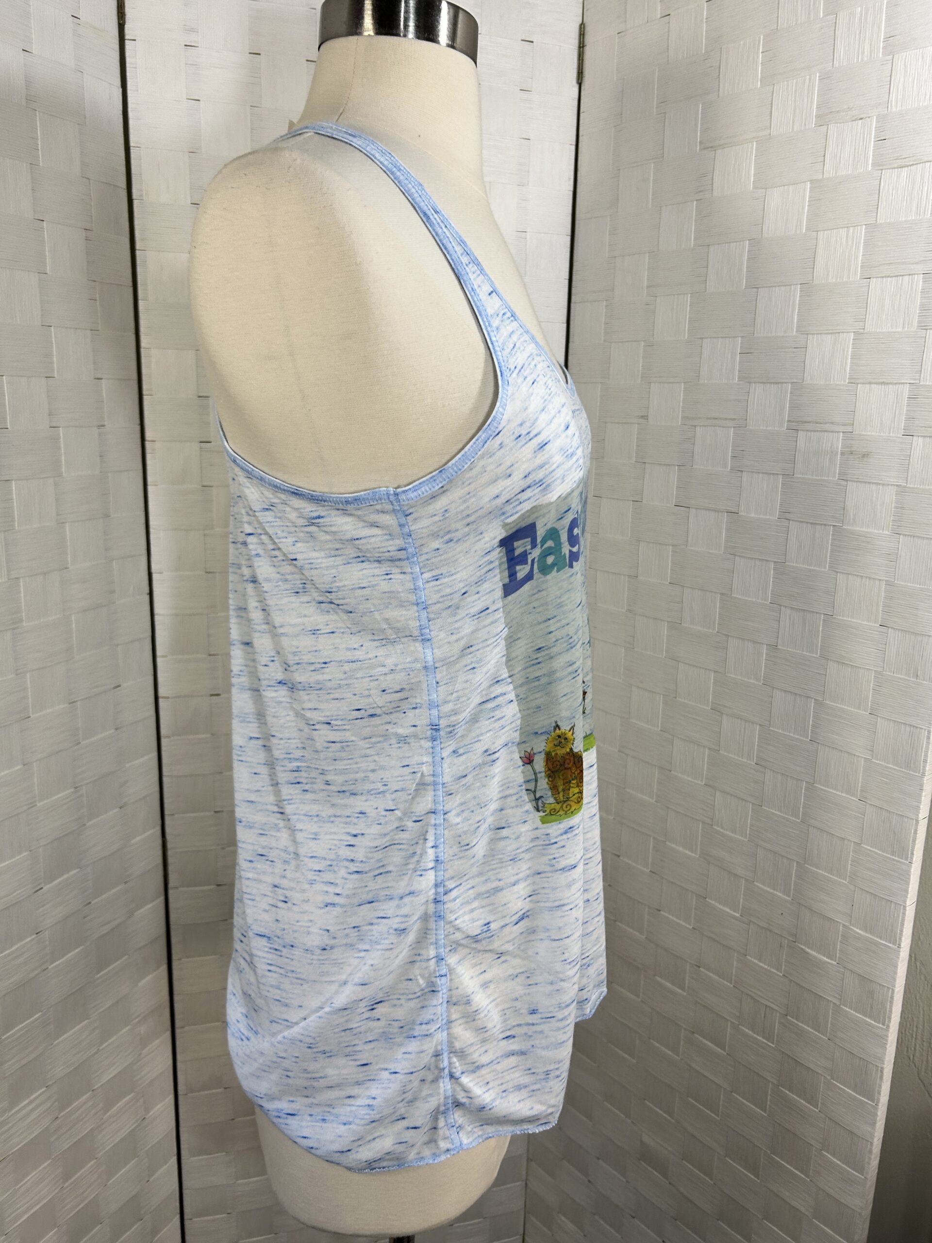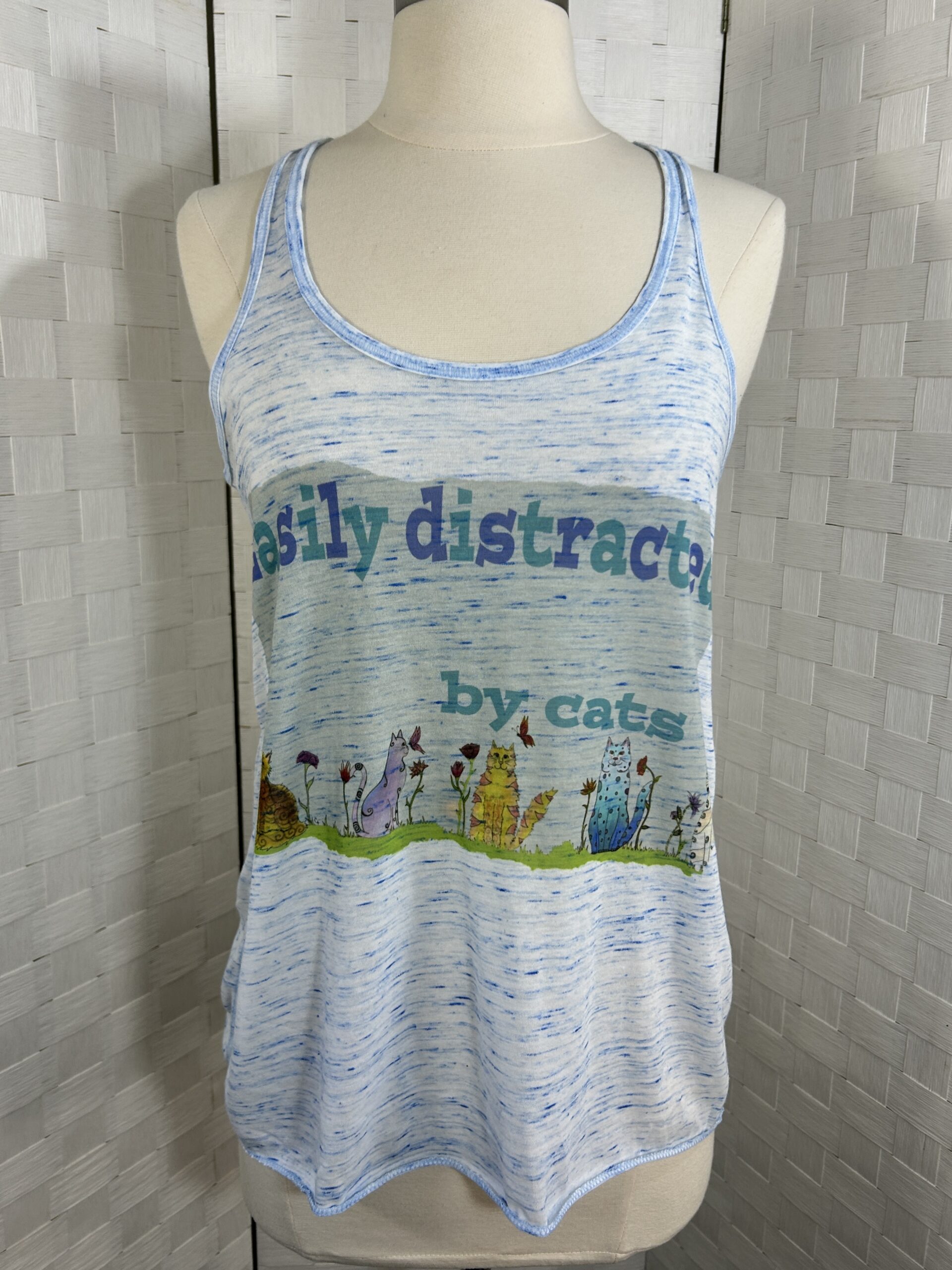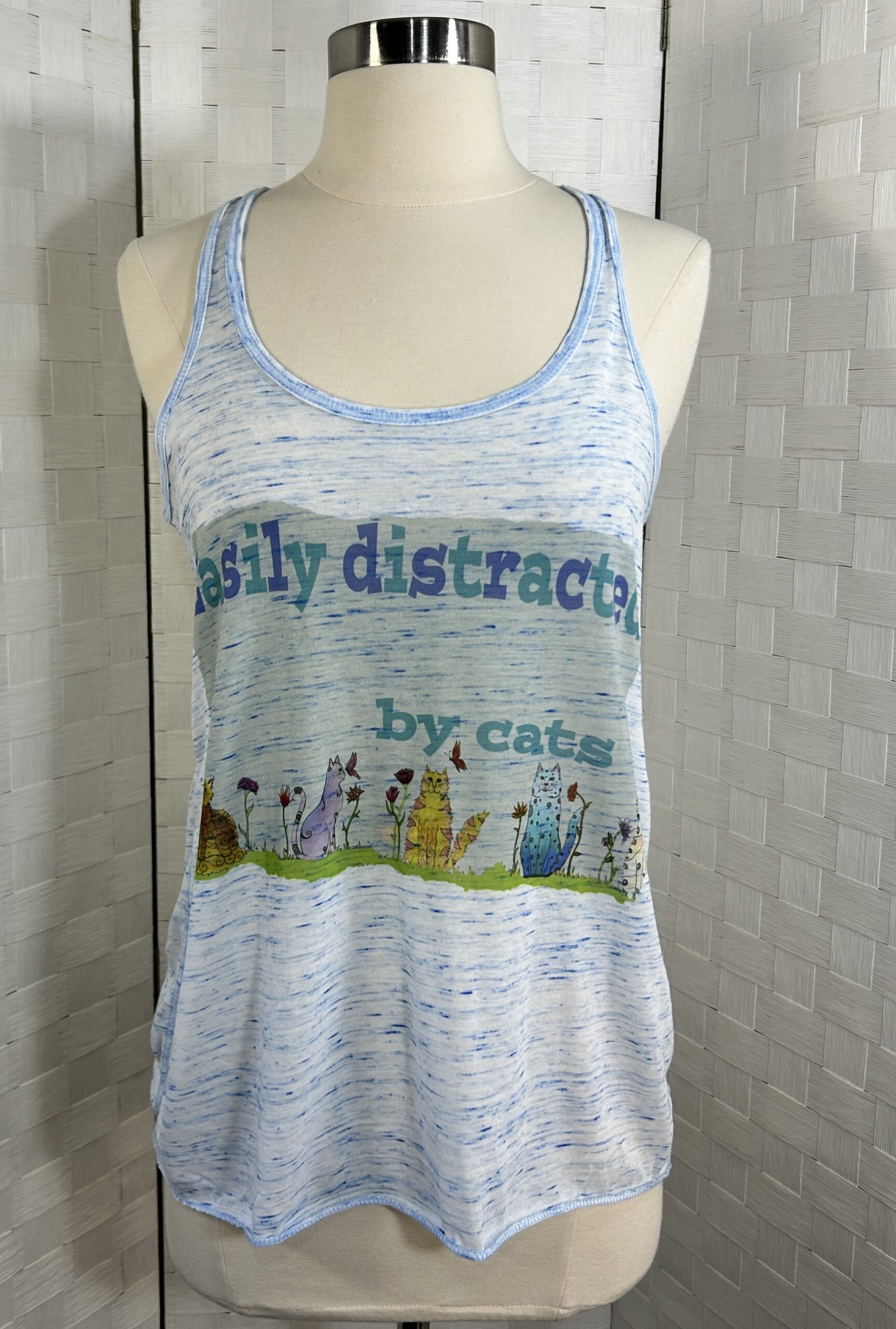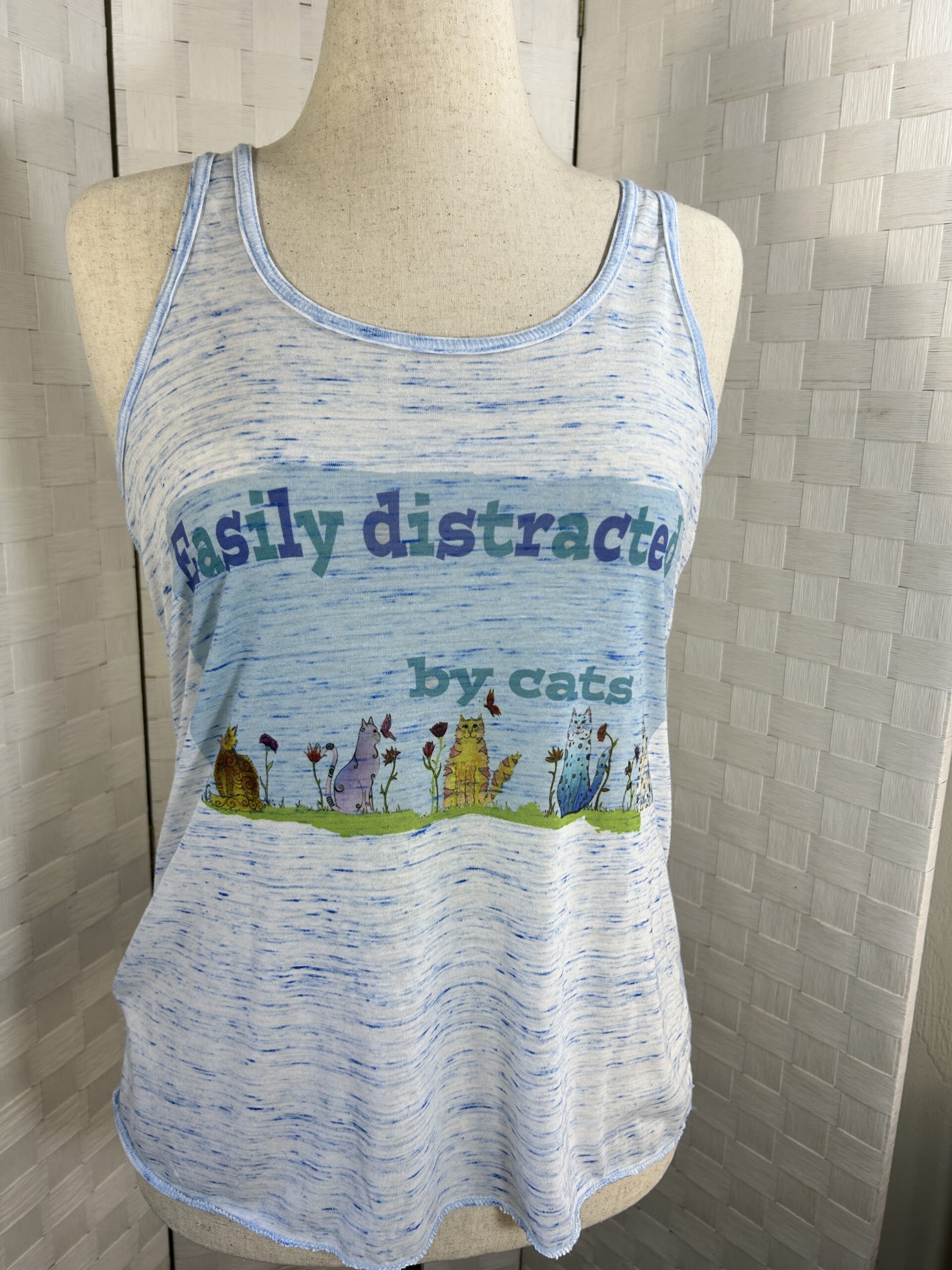 Bella Canvas Flowy racerback tank top- marbled blue and white color with a sublimation print made with my original artwork/design “Easily Distracted by Cats”