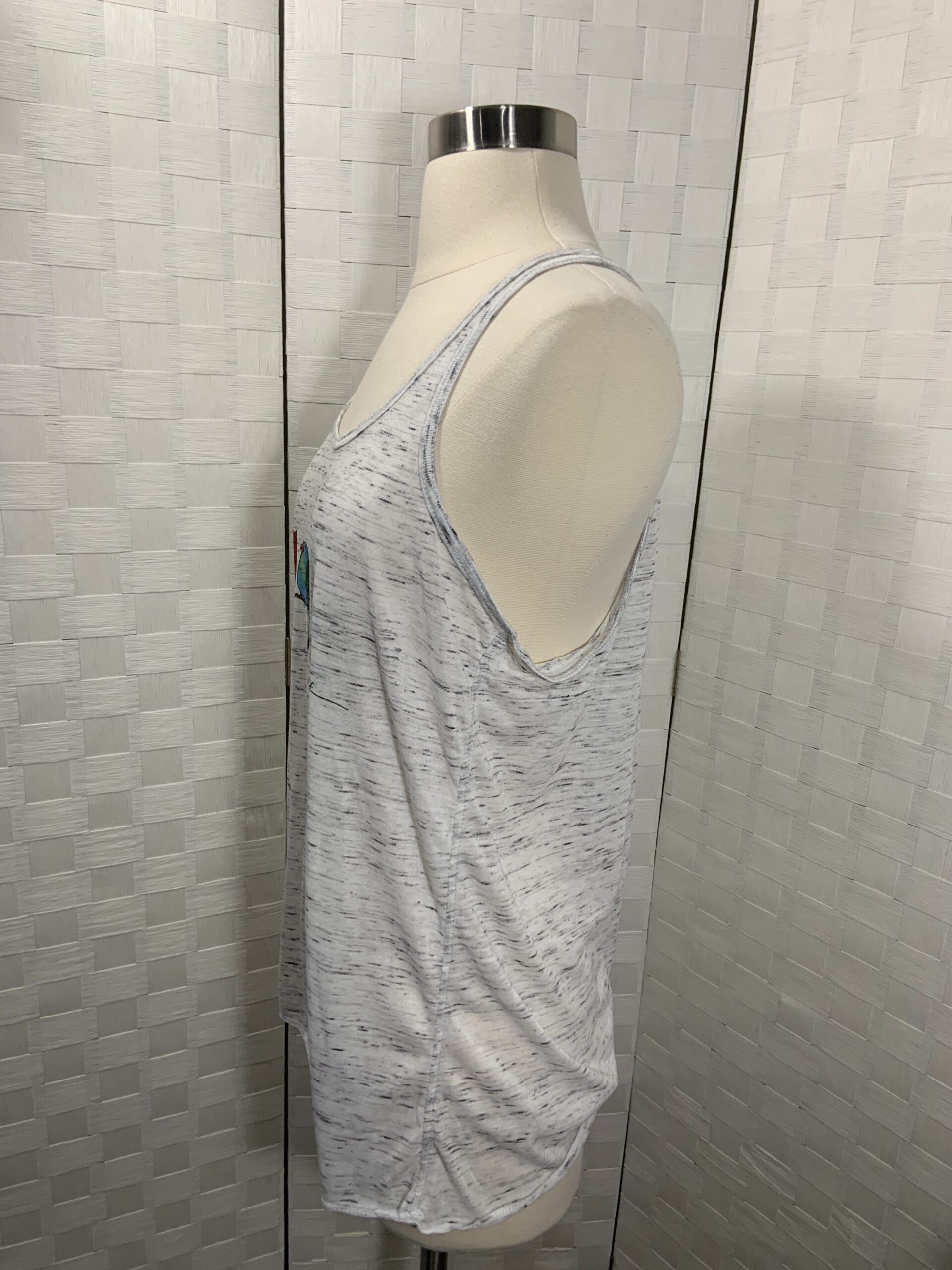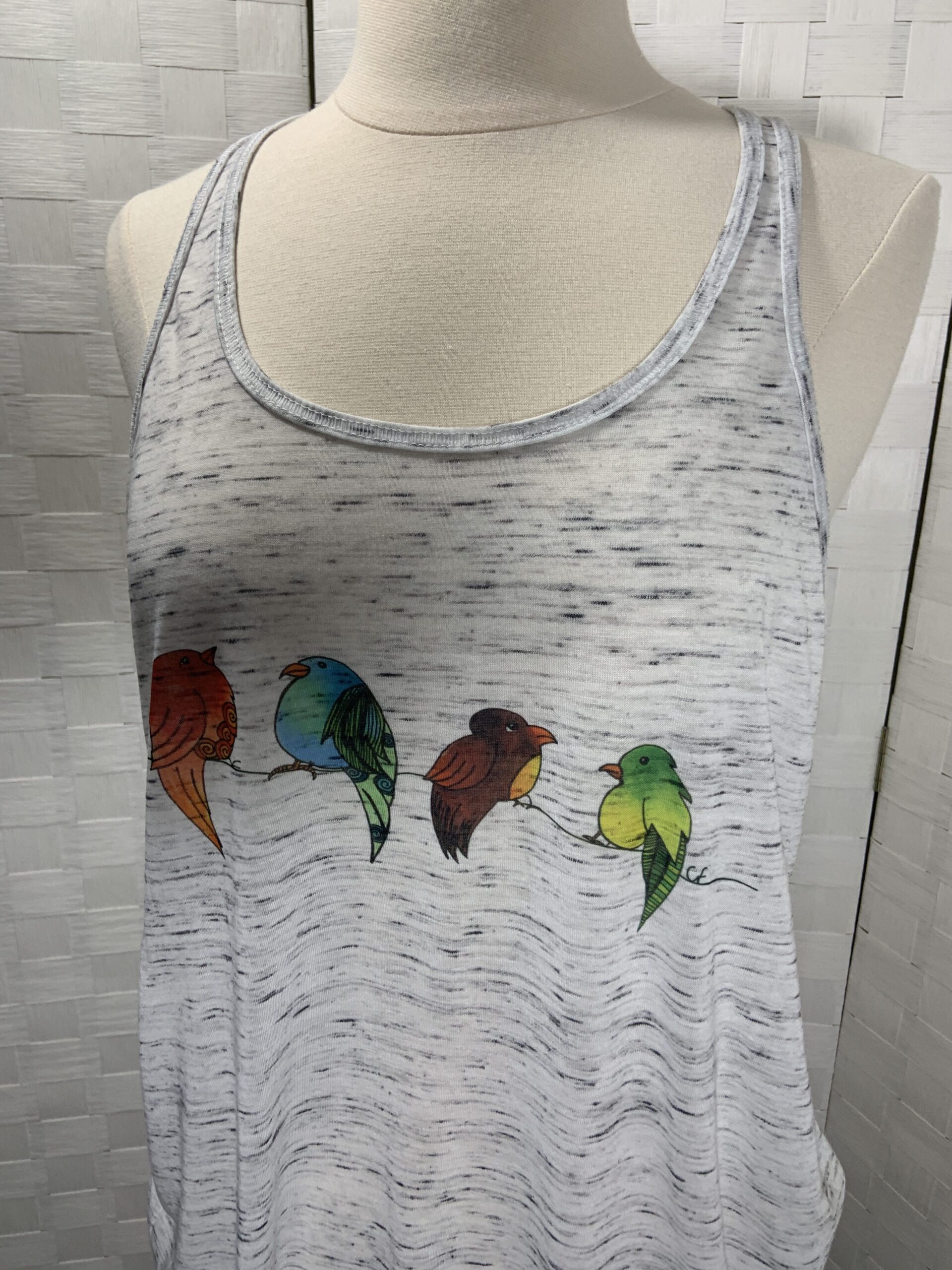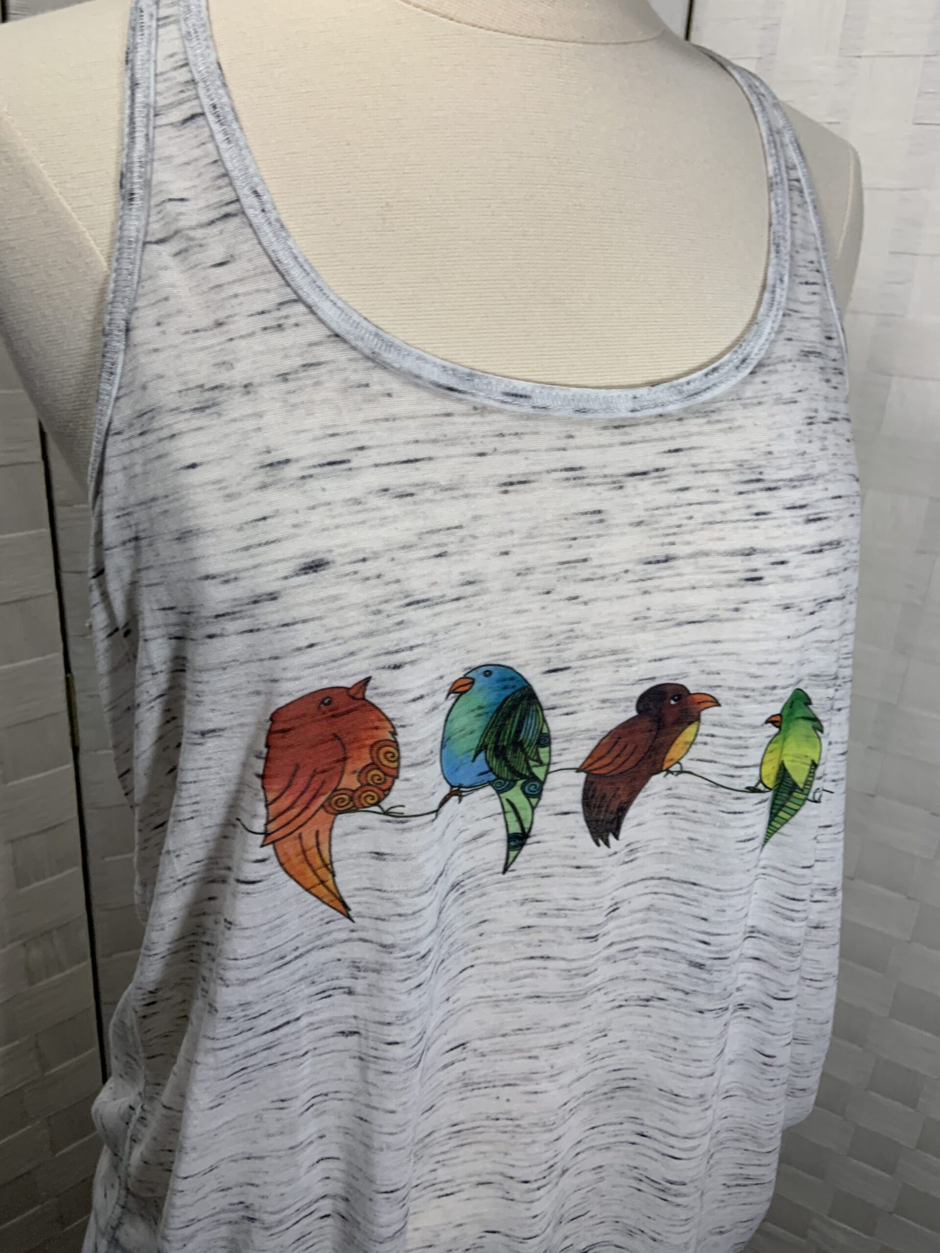 Bird print tank top. White/Gray Bella Canvas flowy style racer back