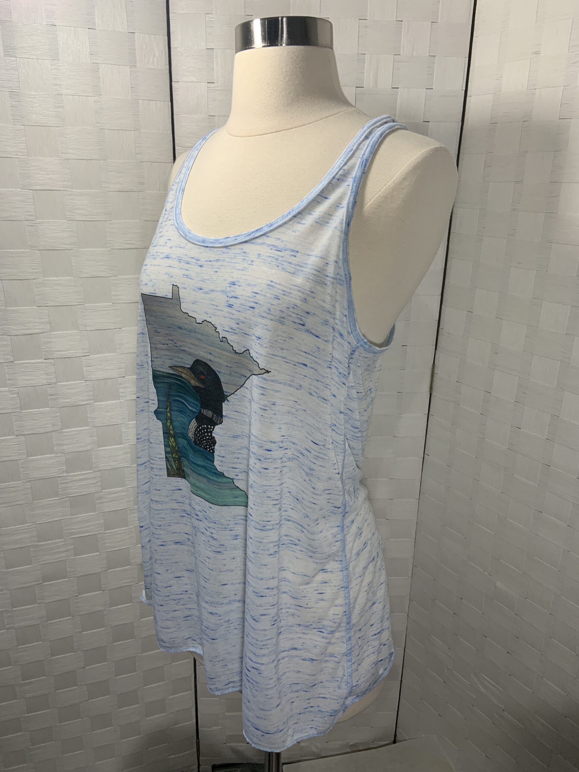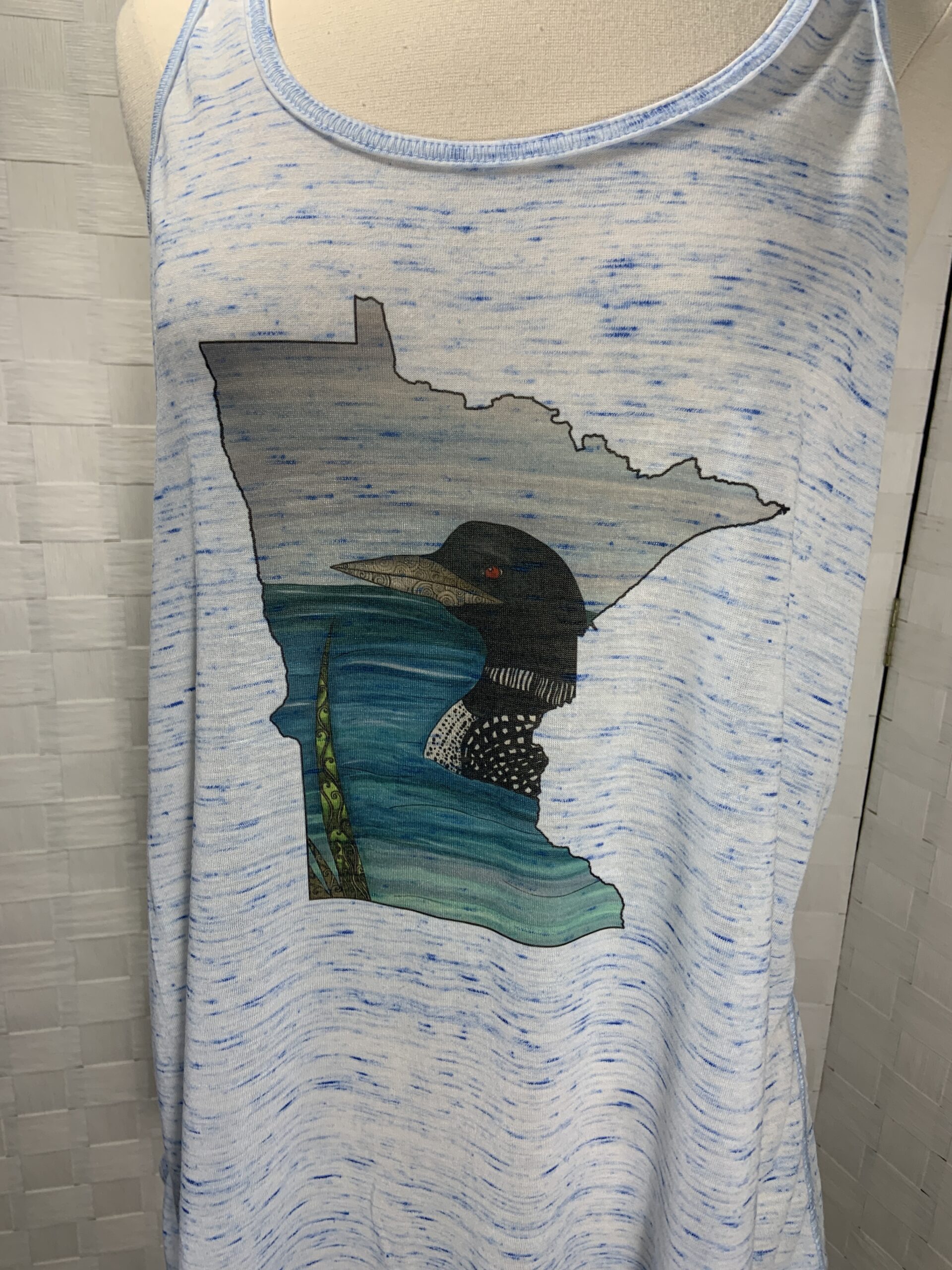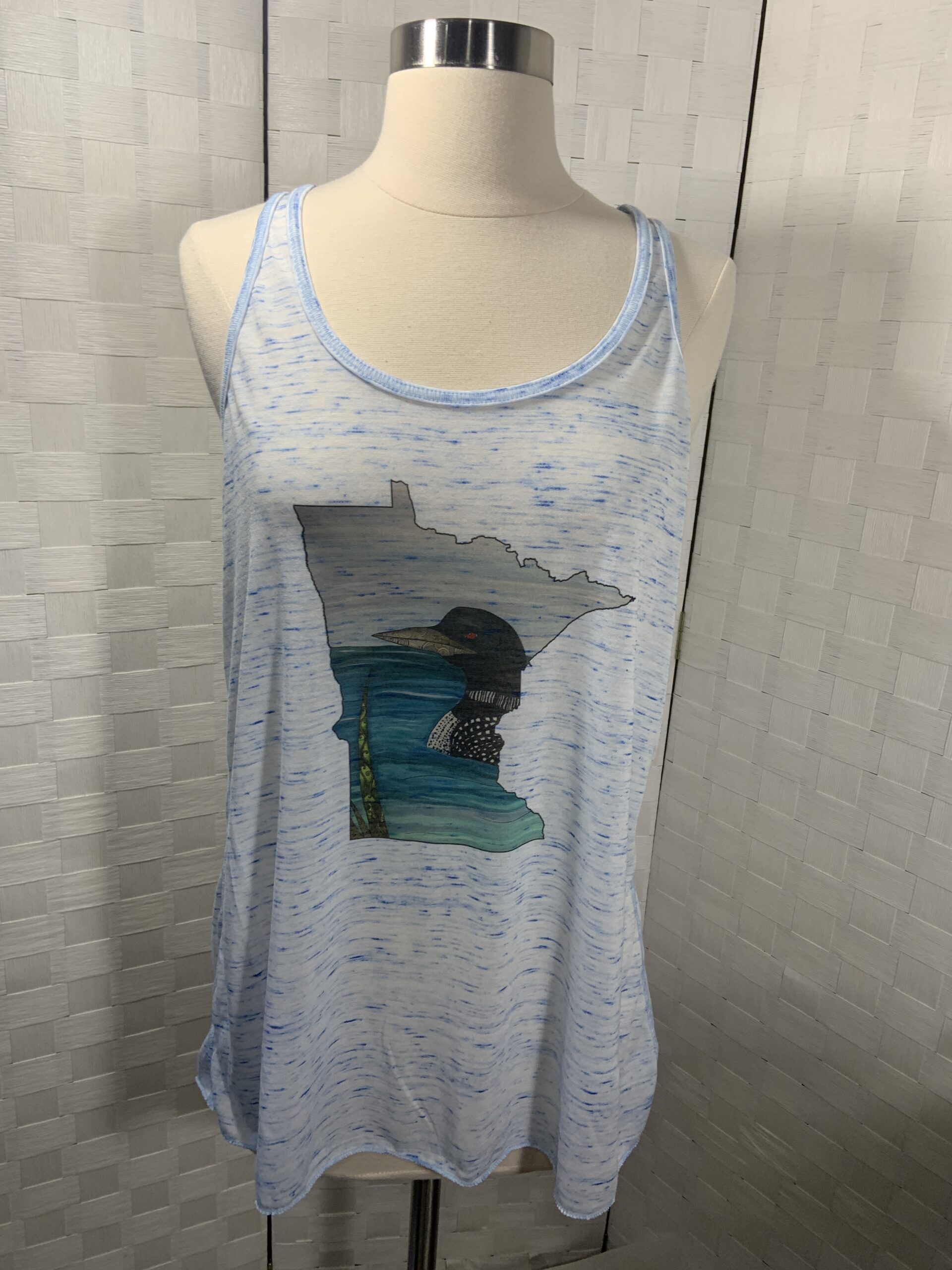 Minnesota Loon print tank top. White/Blue Bella Canvas flowy style racer back