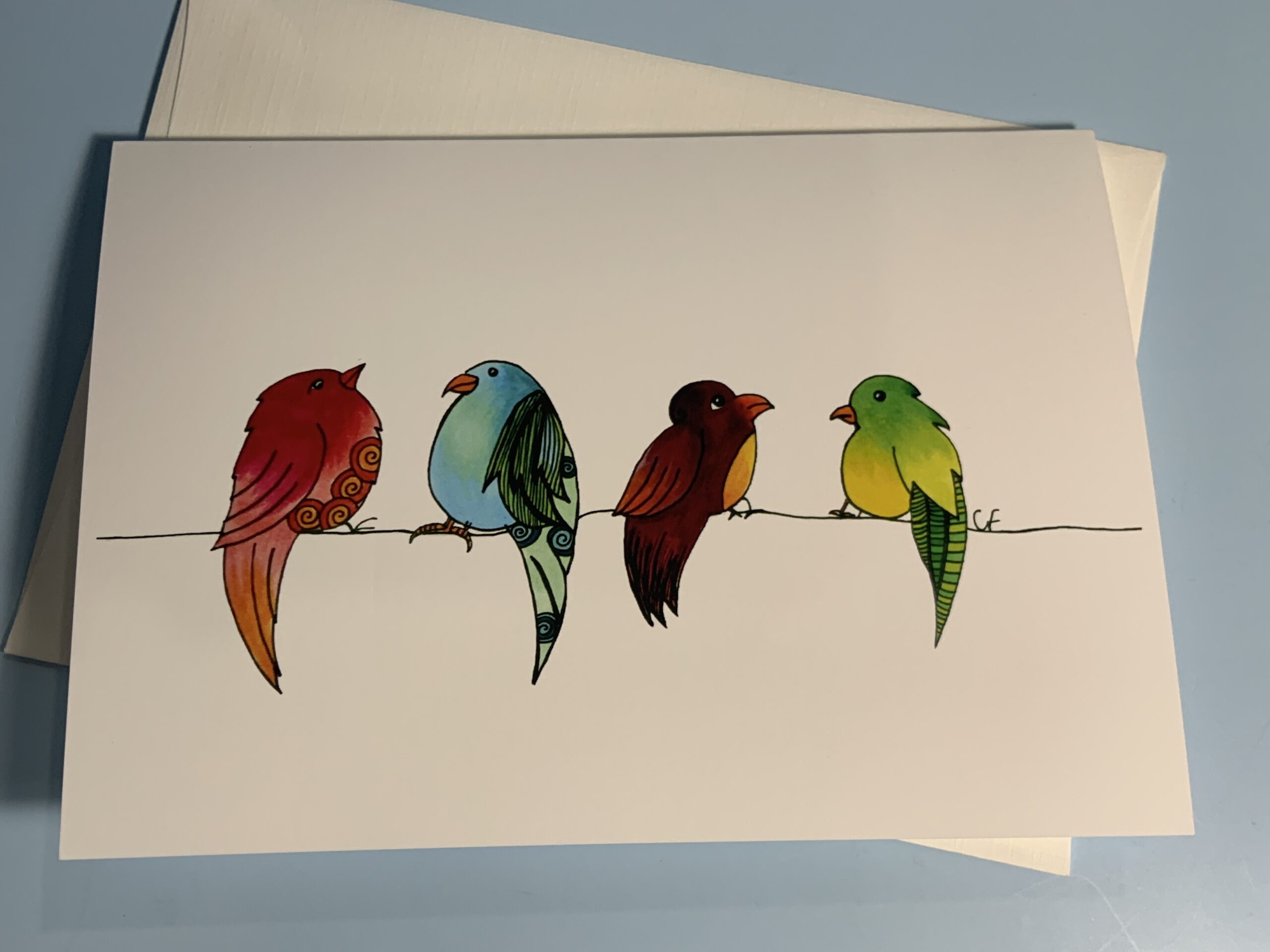“Birds on a wire” Greeting card with colorful birds 5″x7″