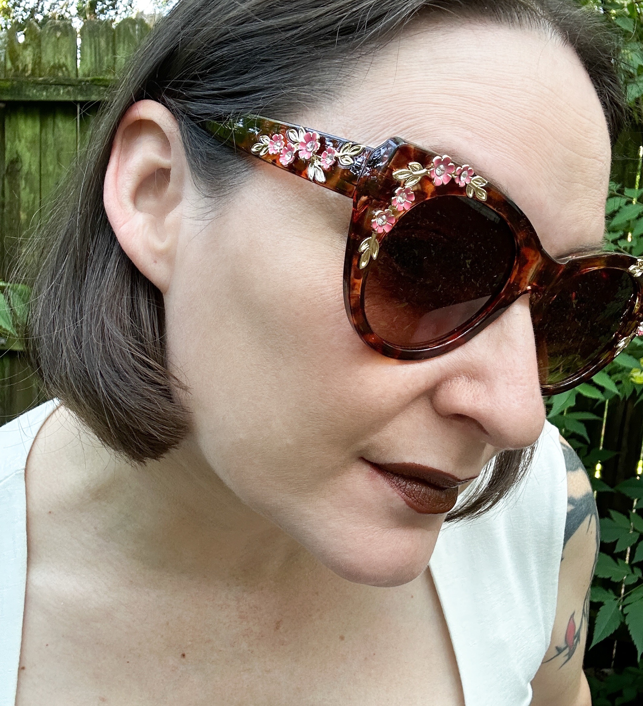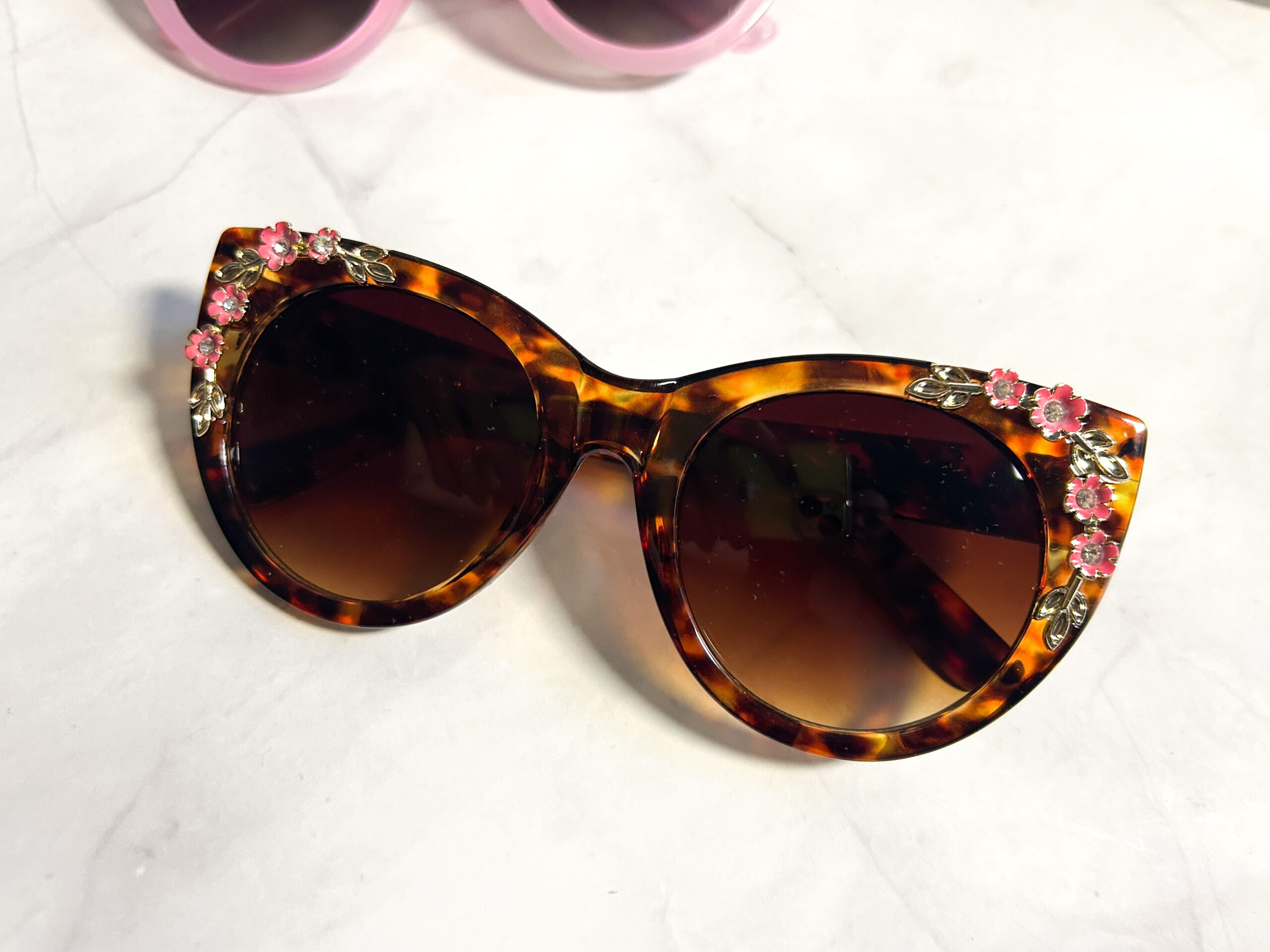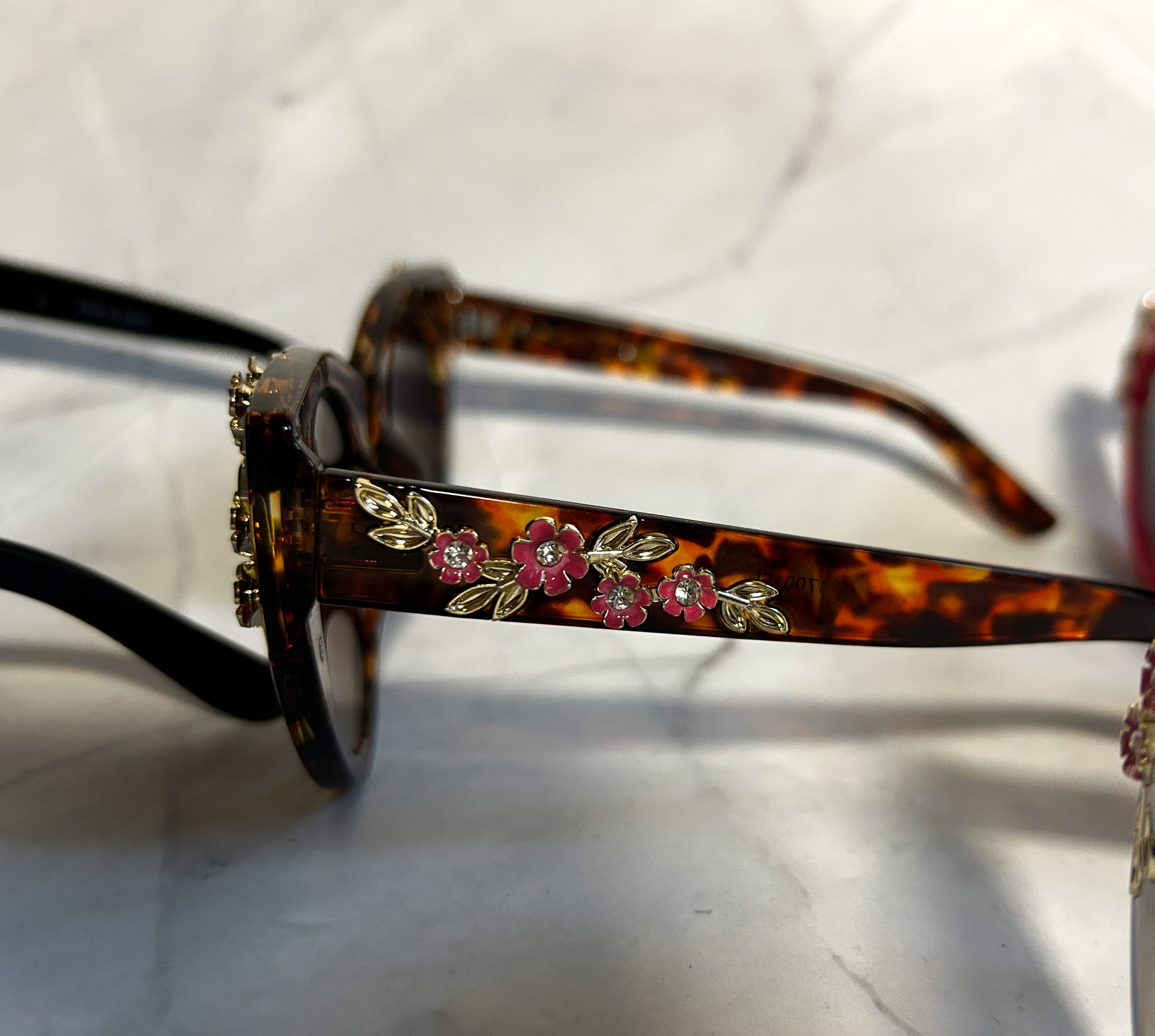 Brown tortoise shell with pink and gold floral embellishments on the sides and arms ad some elegance and a touch of playfulness.