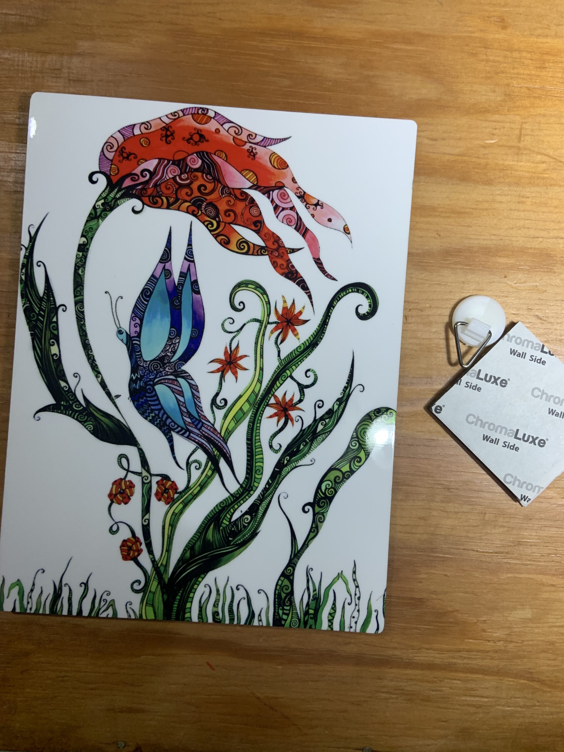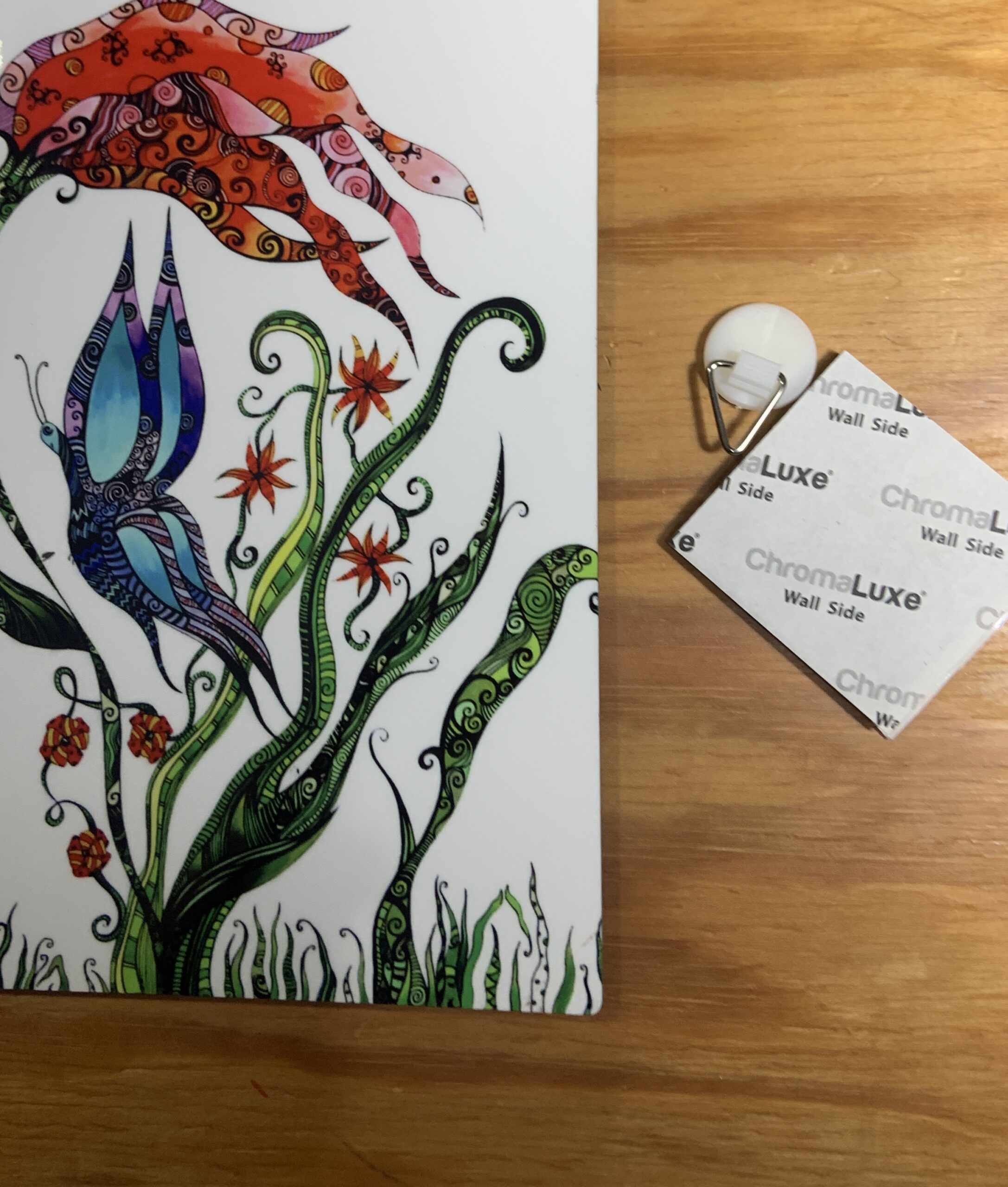 Art print 6×8 hard panel, with reposition-able pad or hanger. Butterfly and flowers