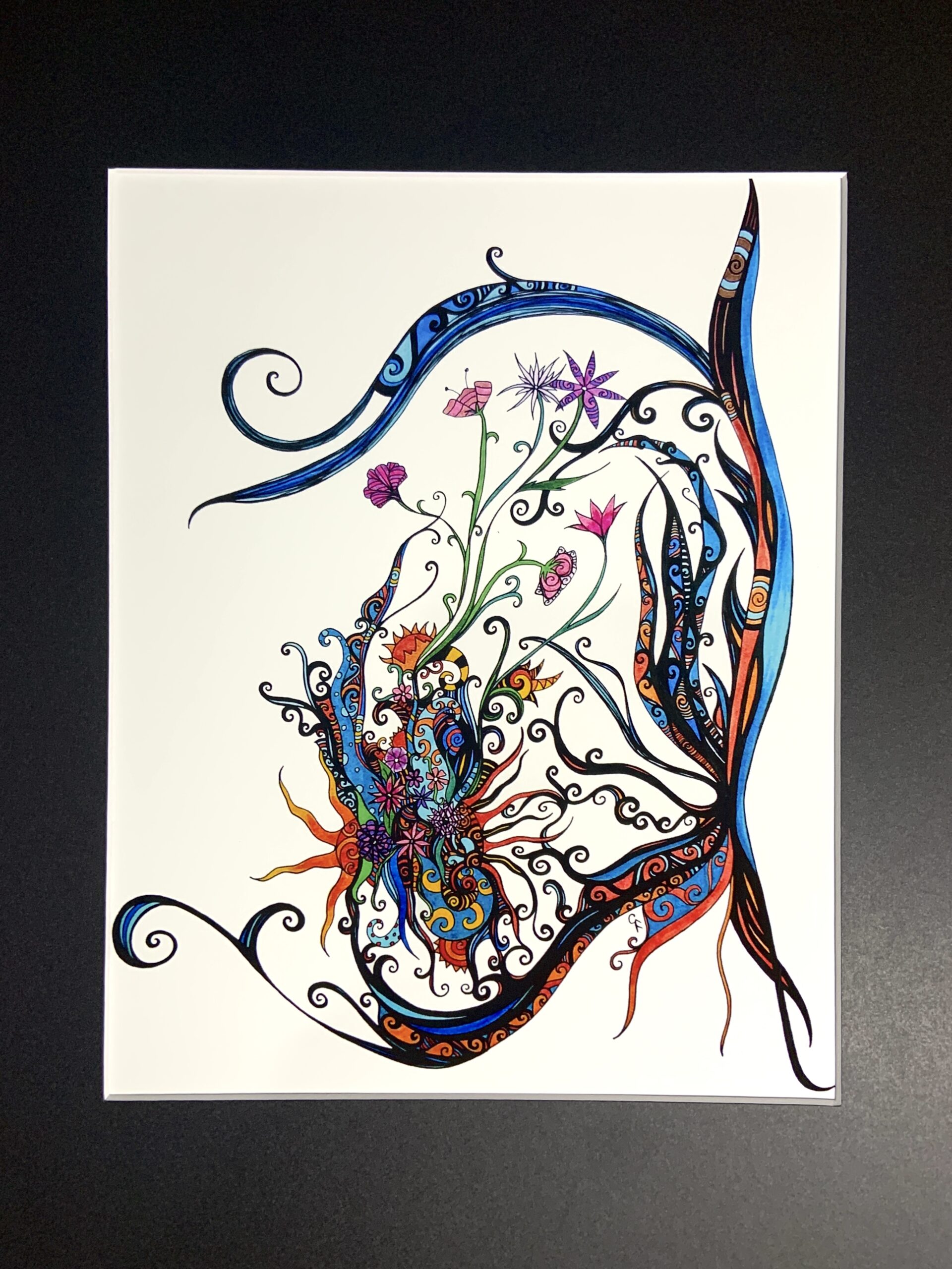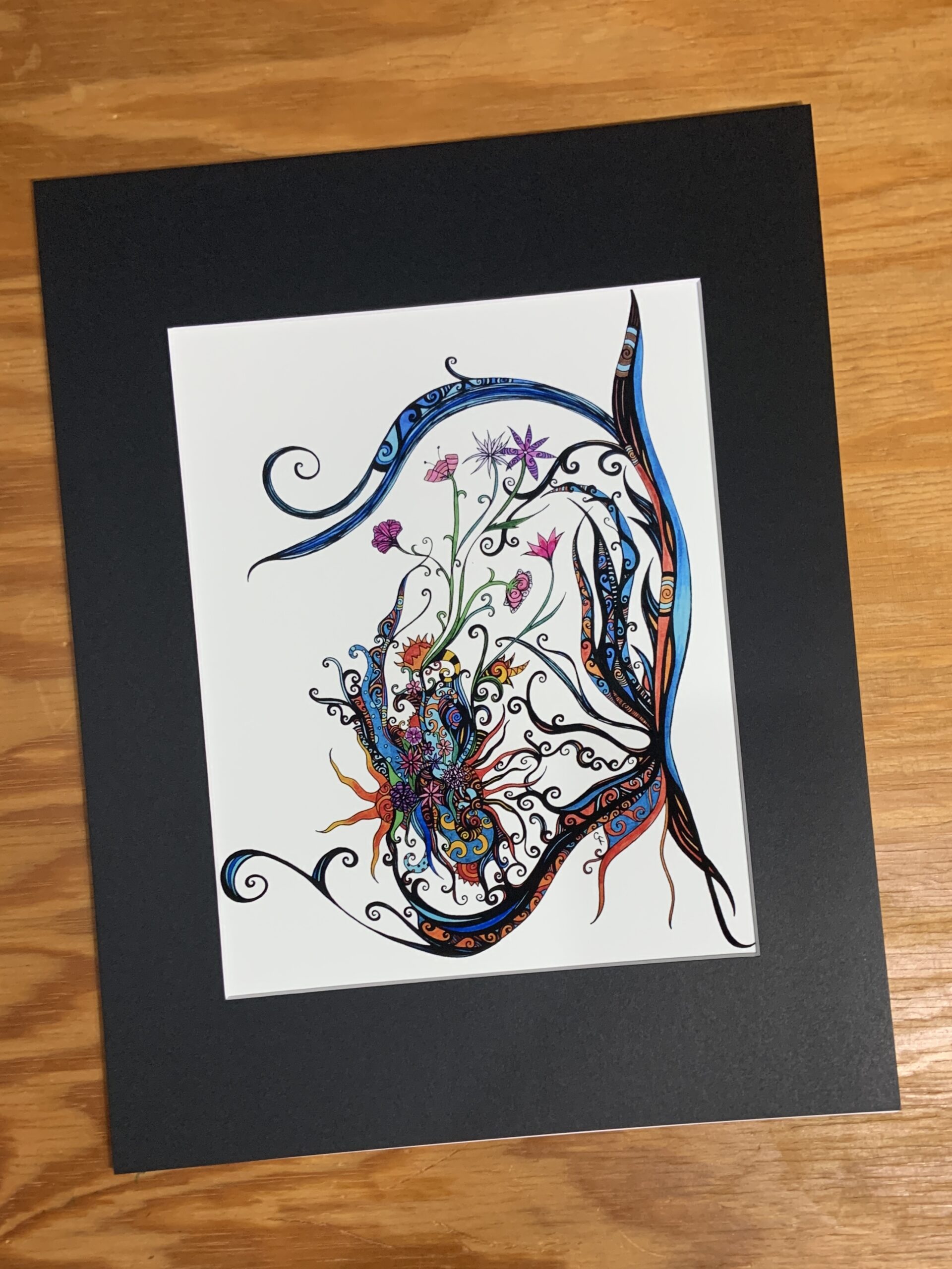 Colorful abstract art print. Intricate details flowers and swirls with black matting.