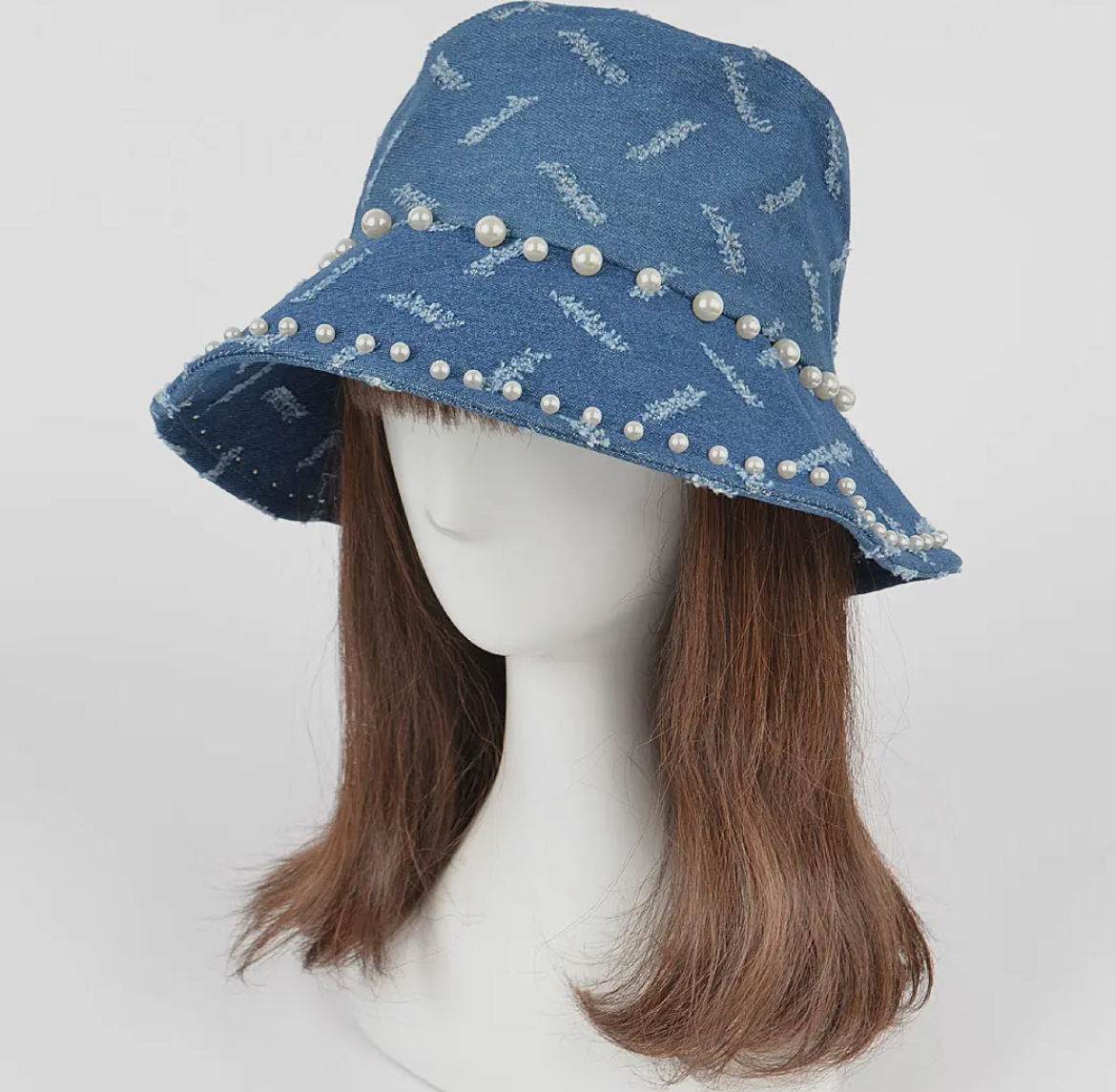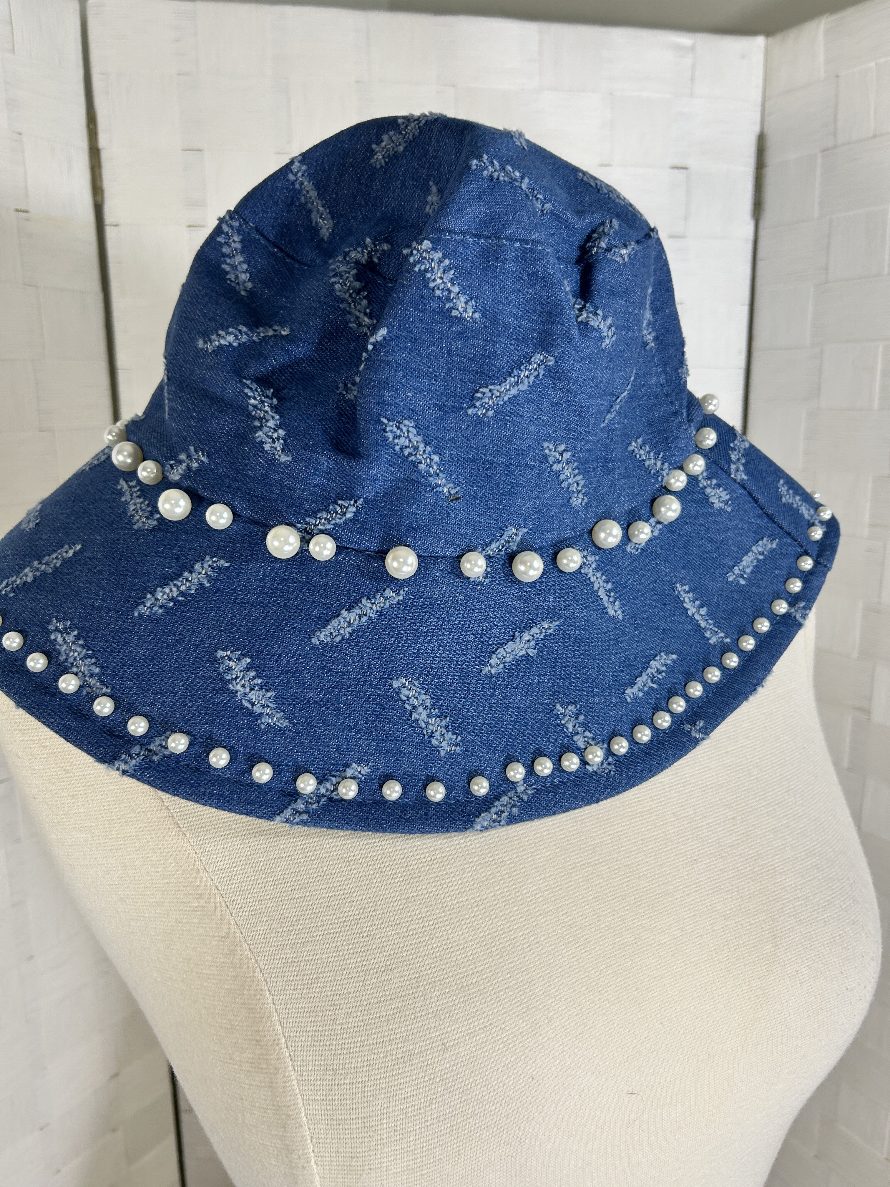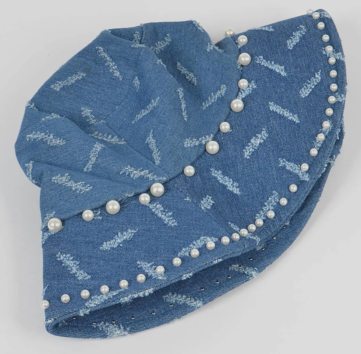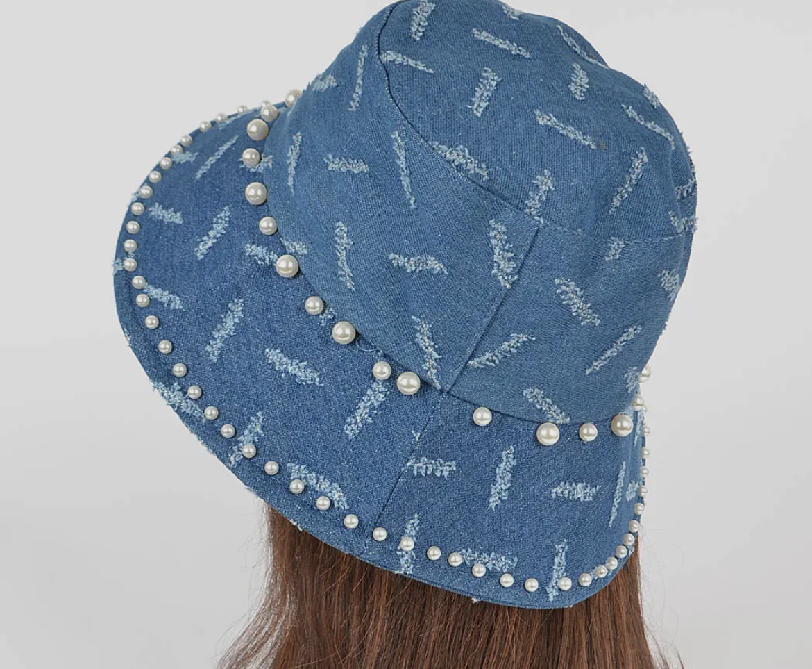 Denim bucket hat with faux pearl embellishments- One size