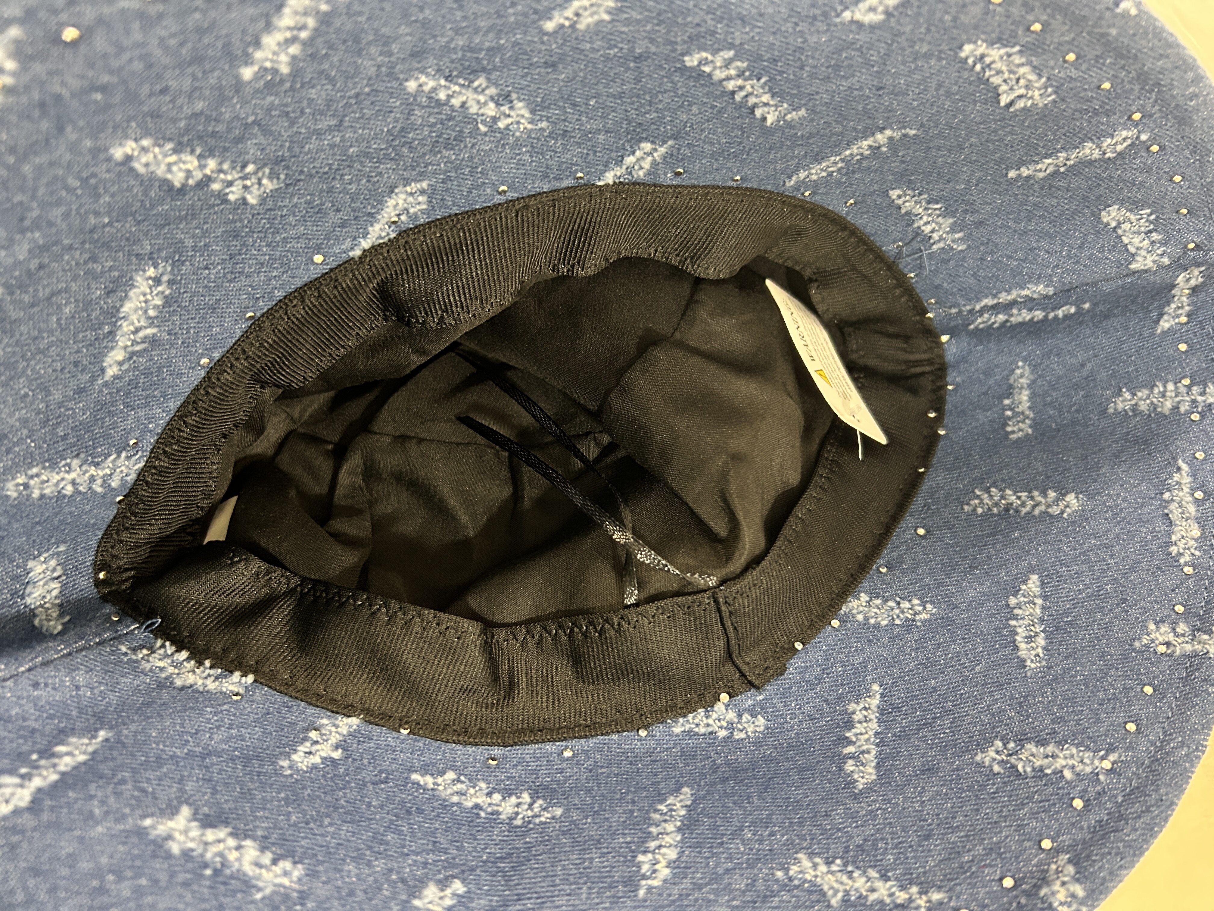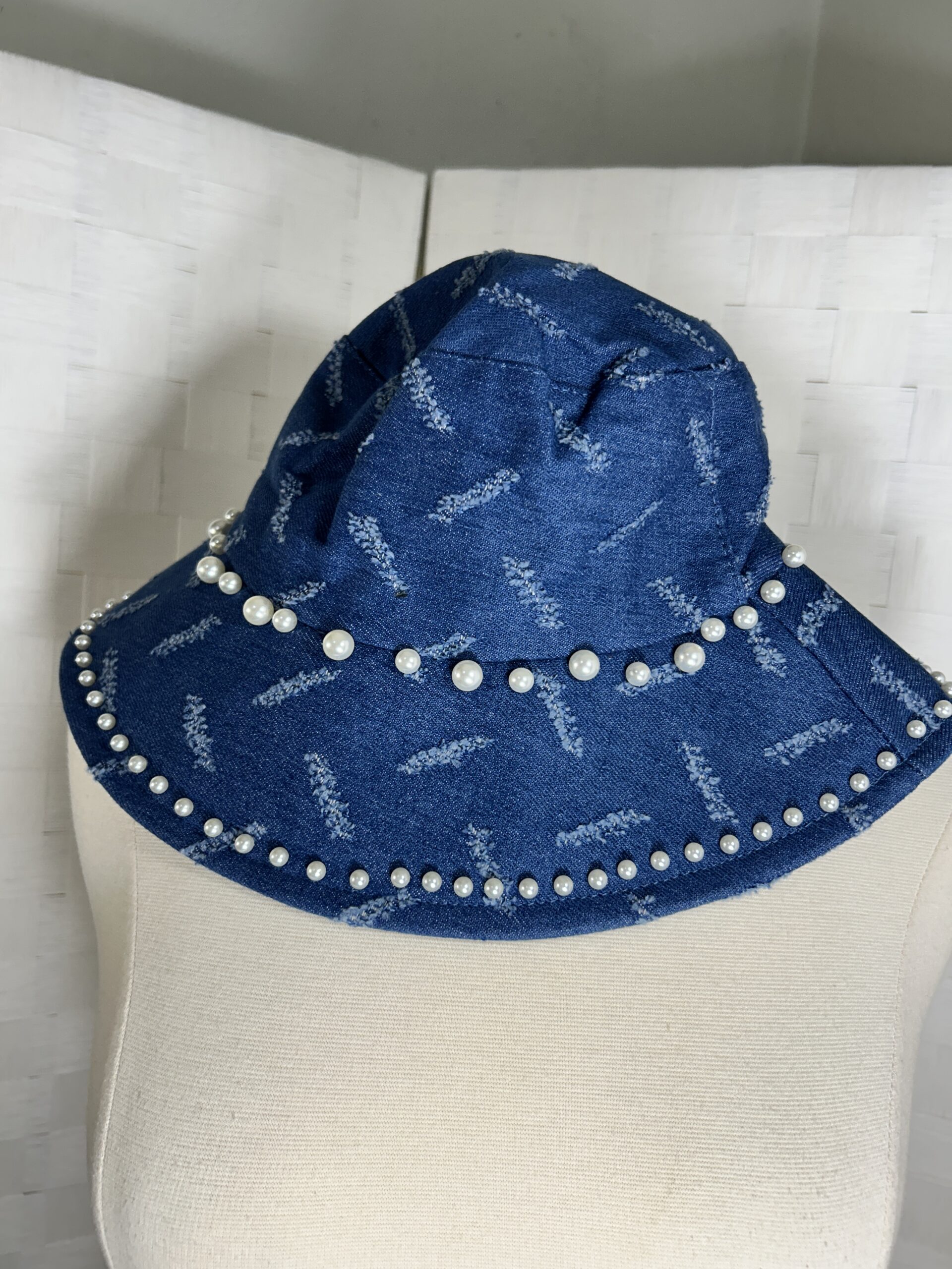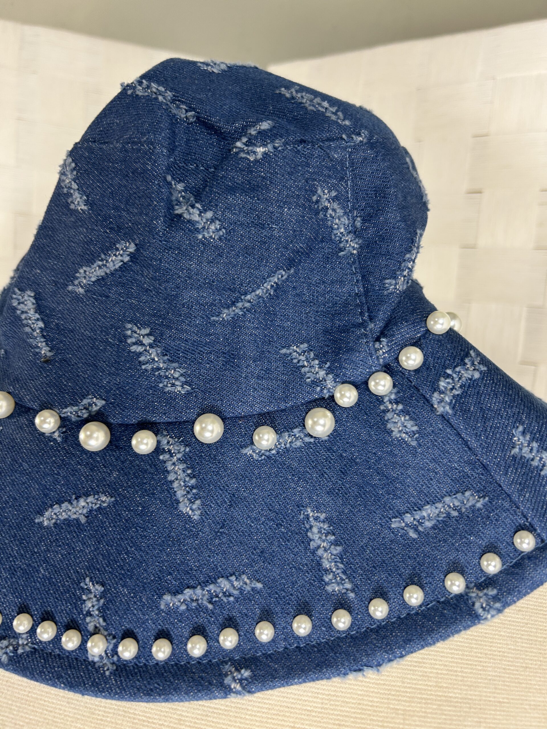 Denim bucket hat with faux pearl embellishments- One size