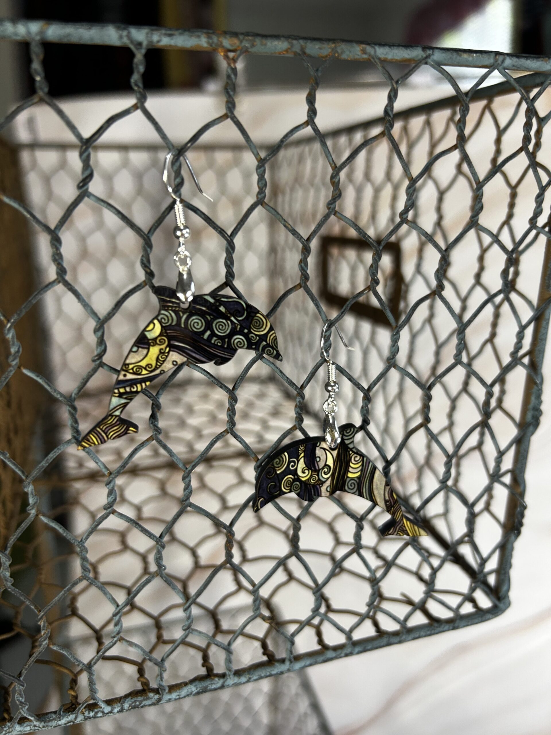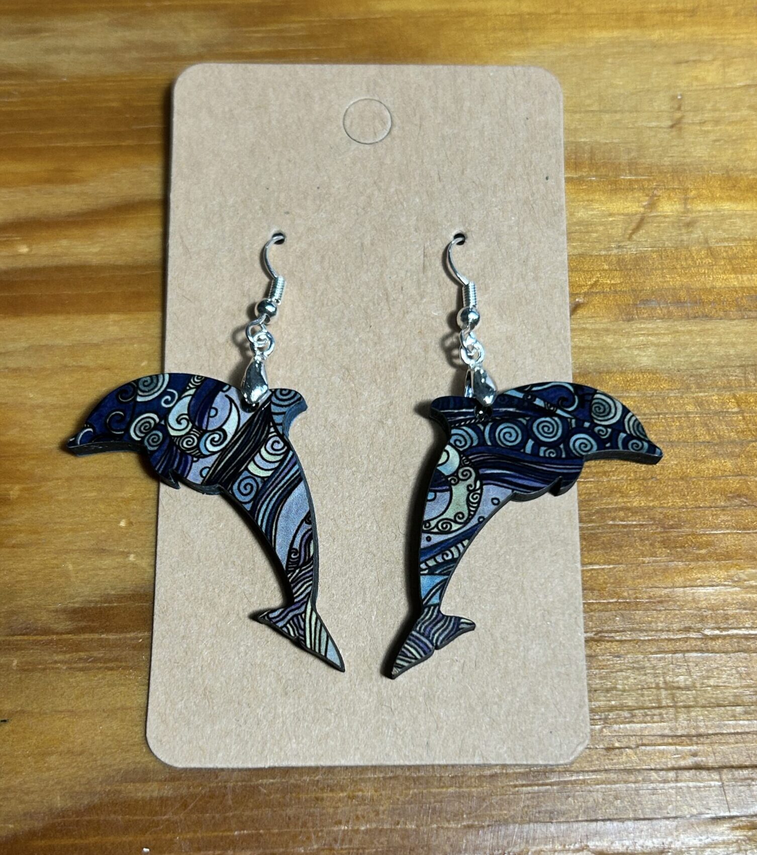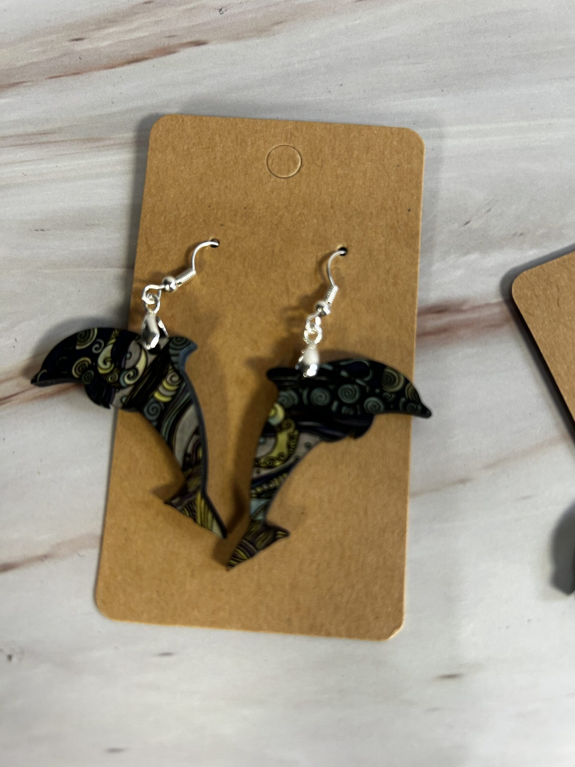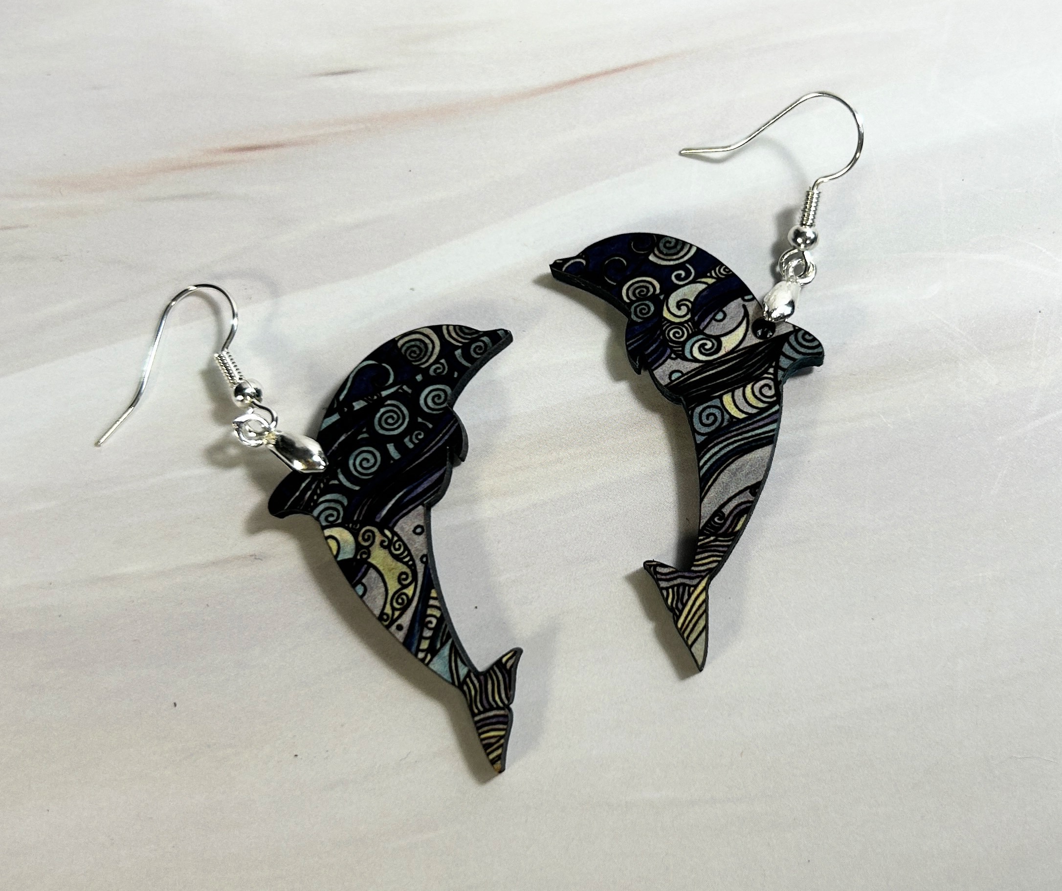 Dolphin dangle earrings dark blue swirls