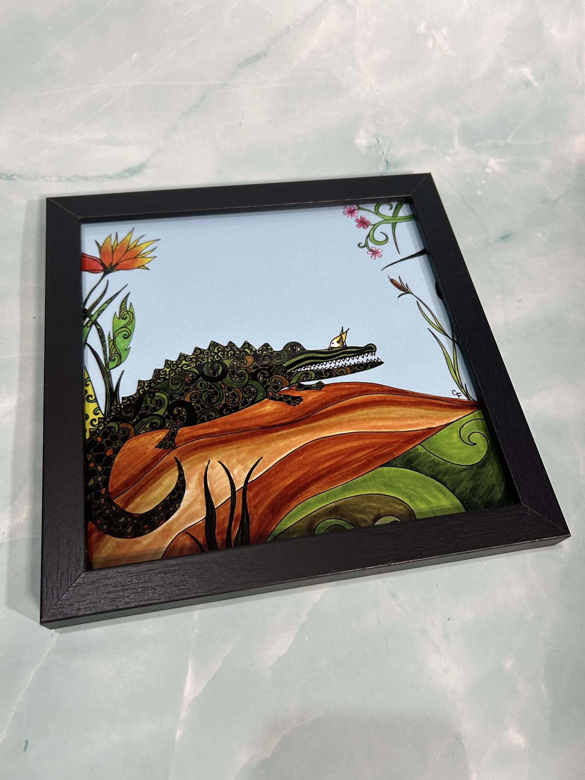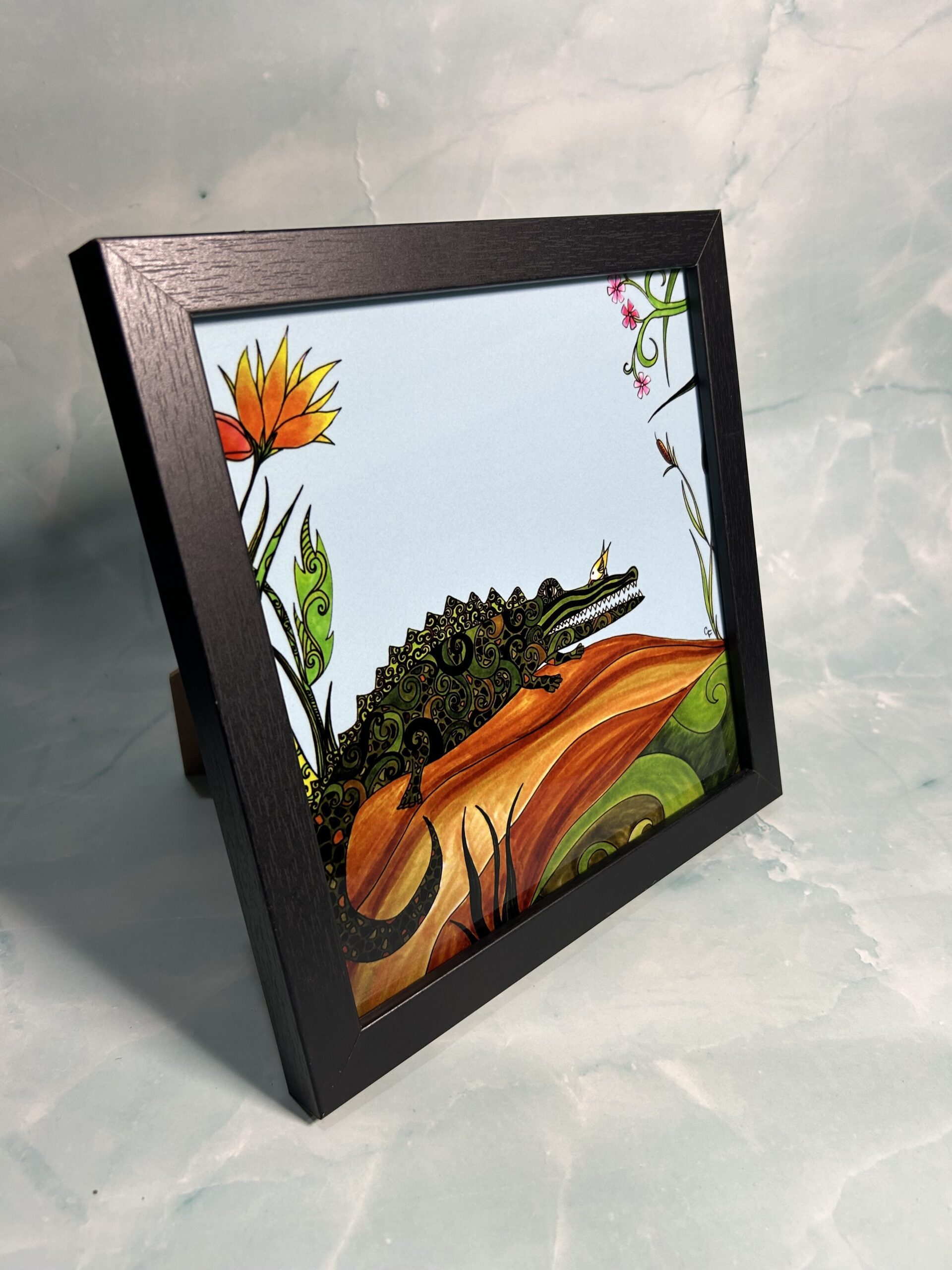 Chromaluxe metal art print, Alligator and bird 8″ x 8″ square with black wood frame.