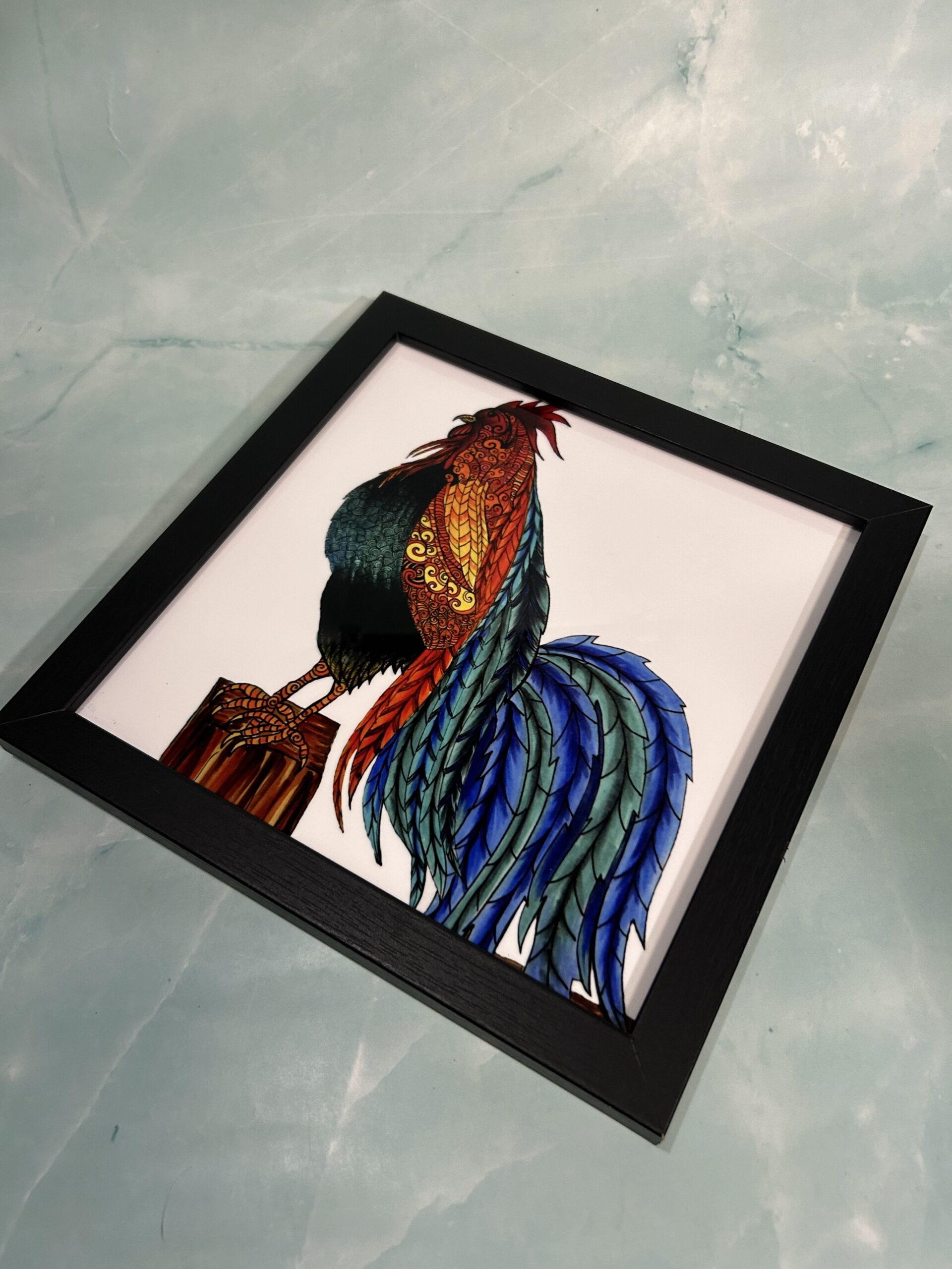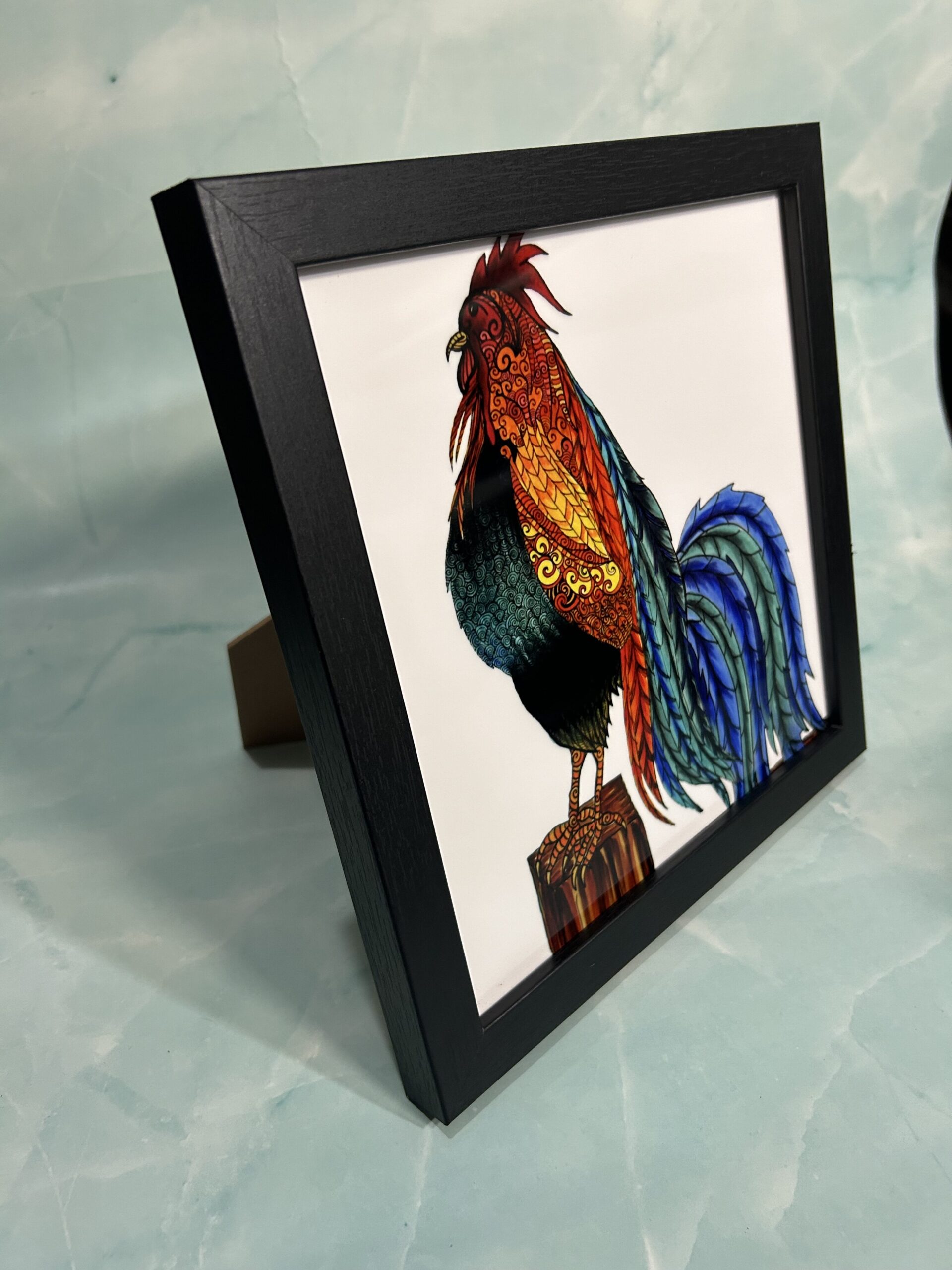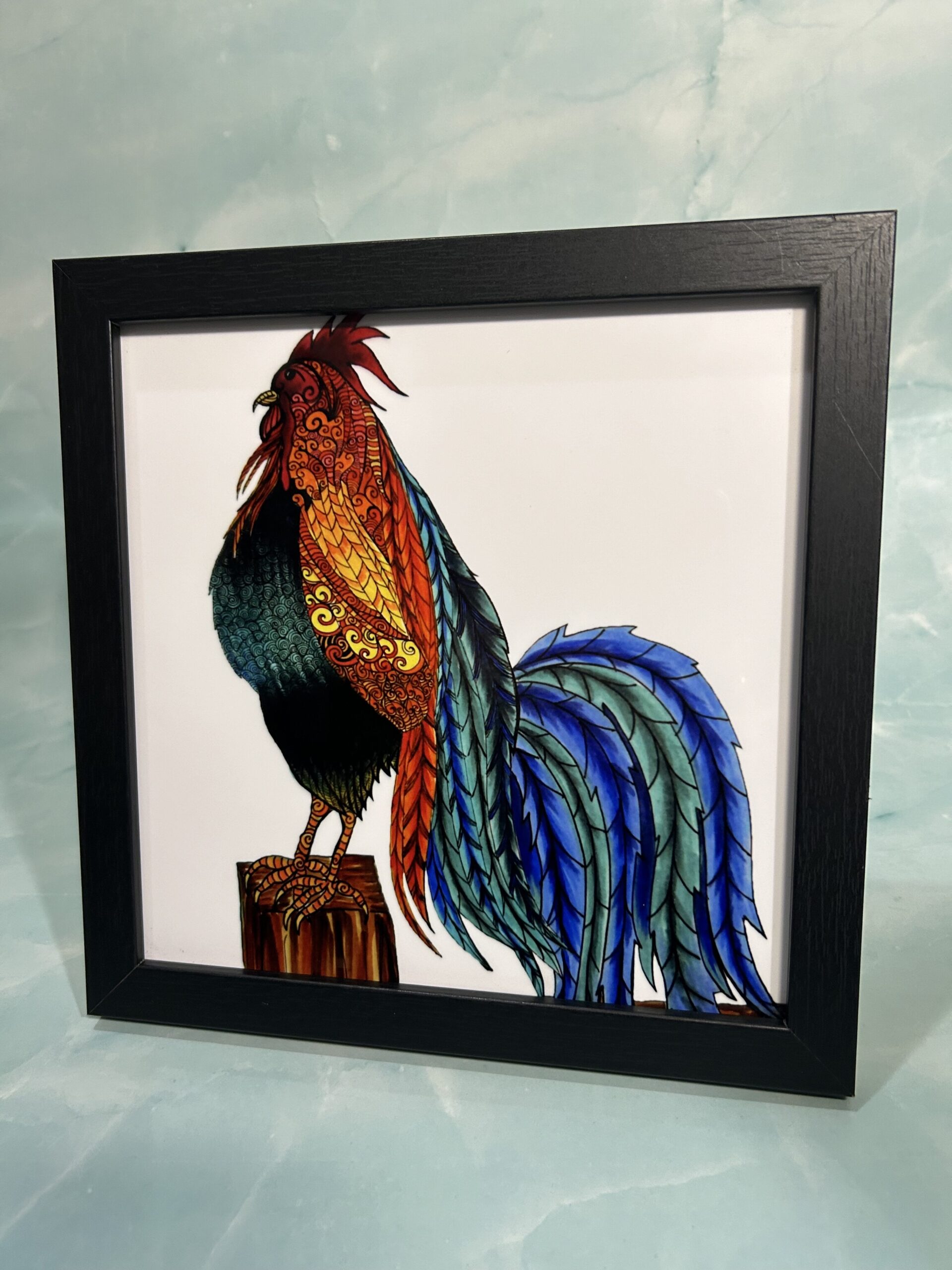 Chromaluxe metal art print, Rooster 8″ x 8″ square with black wood frame.