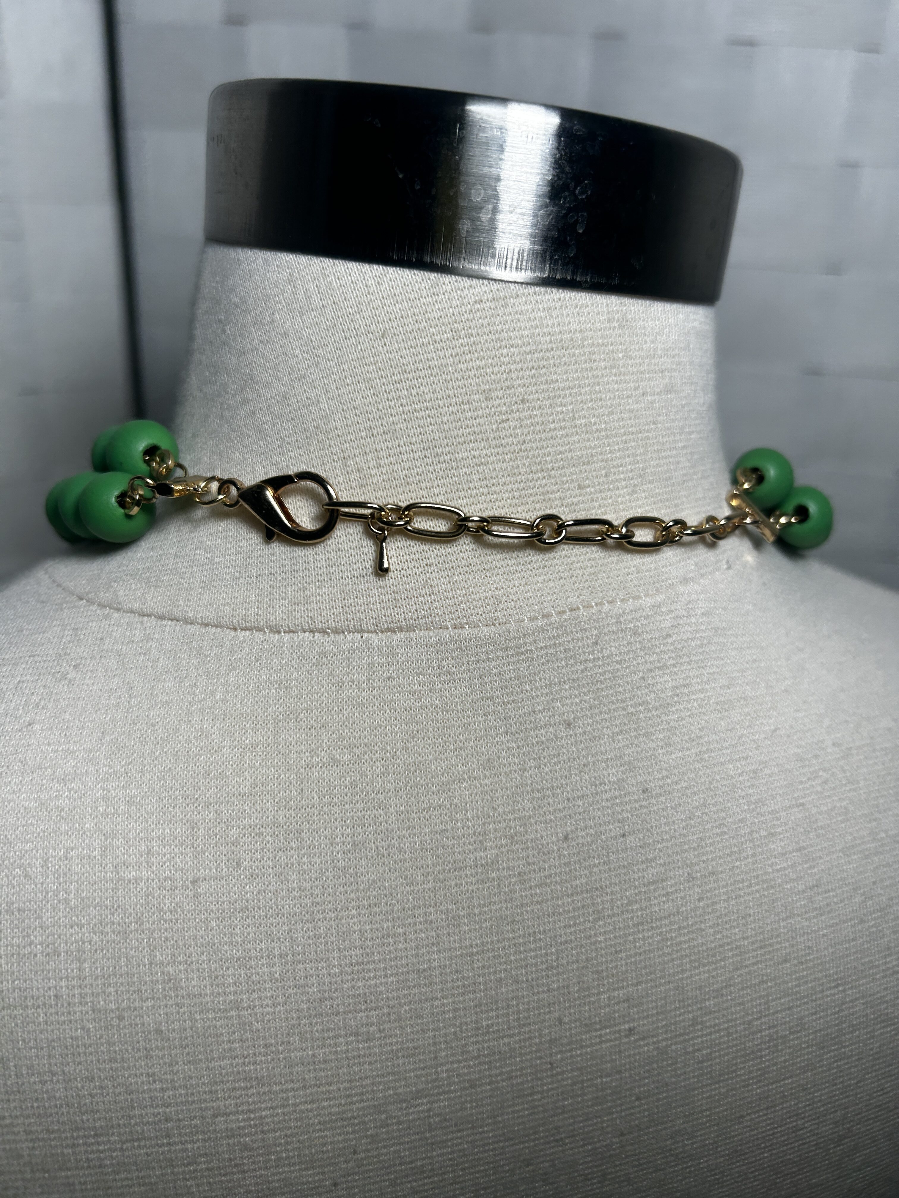 Bright green with gold accent beadss and gold tone hardware- Lobster clasp with adjustable length links.