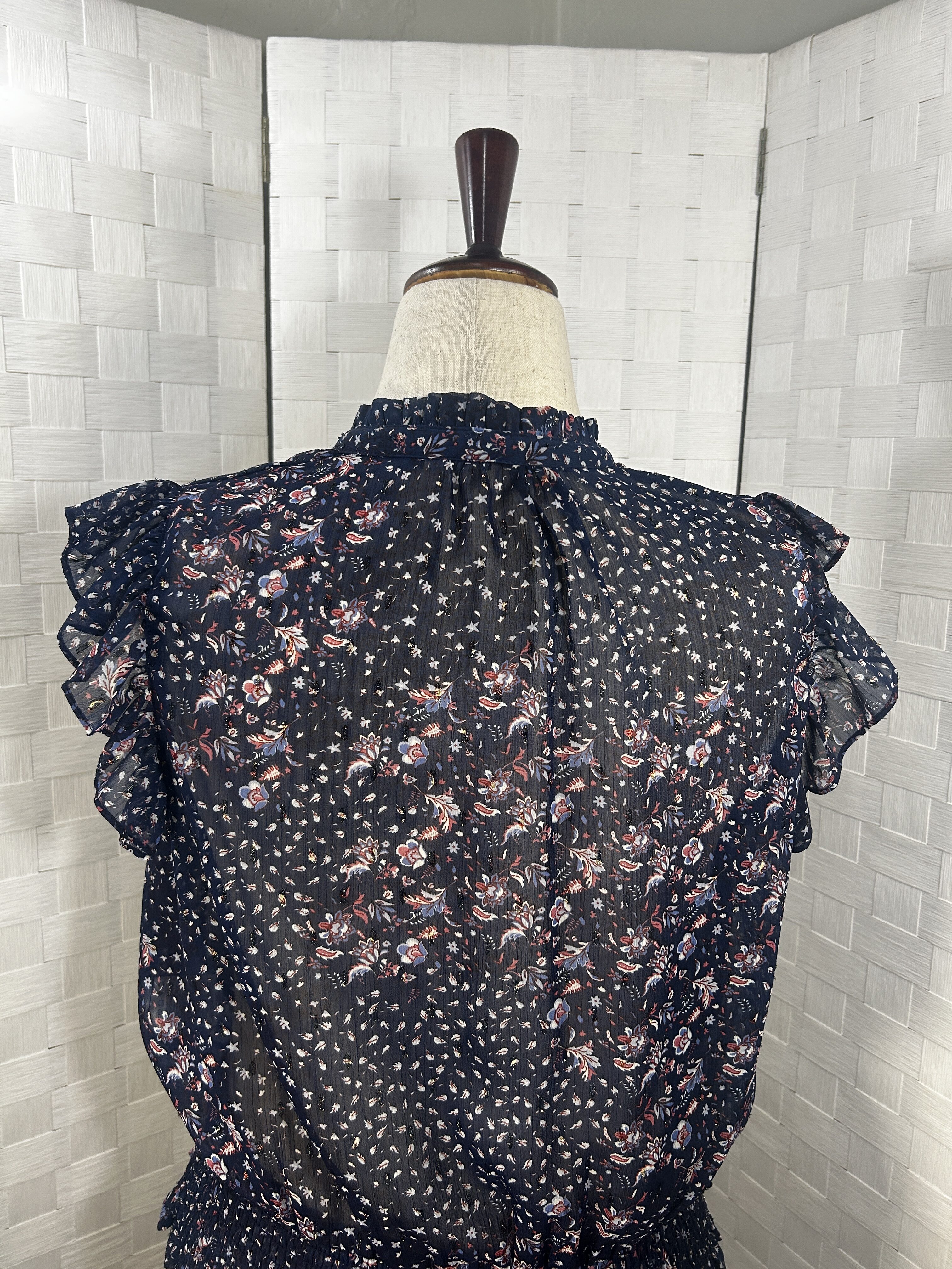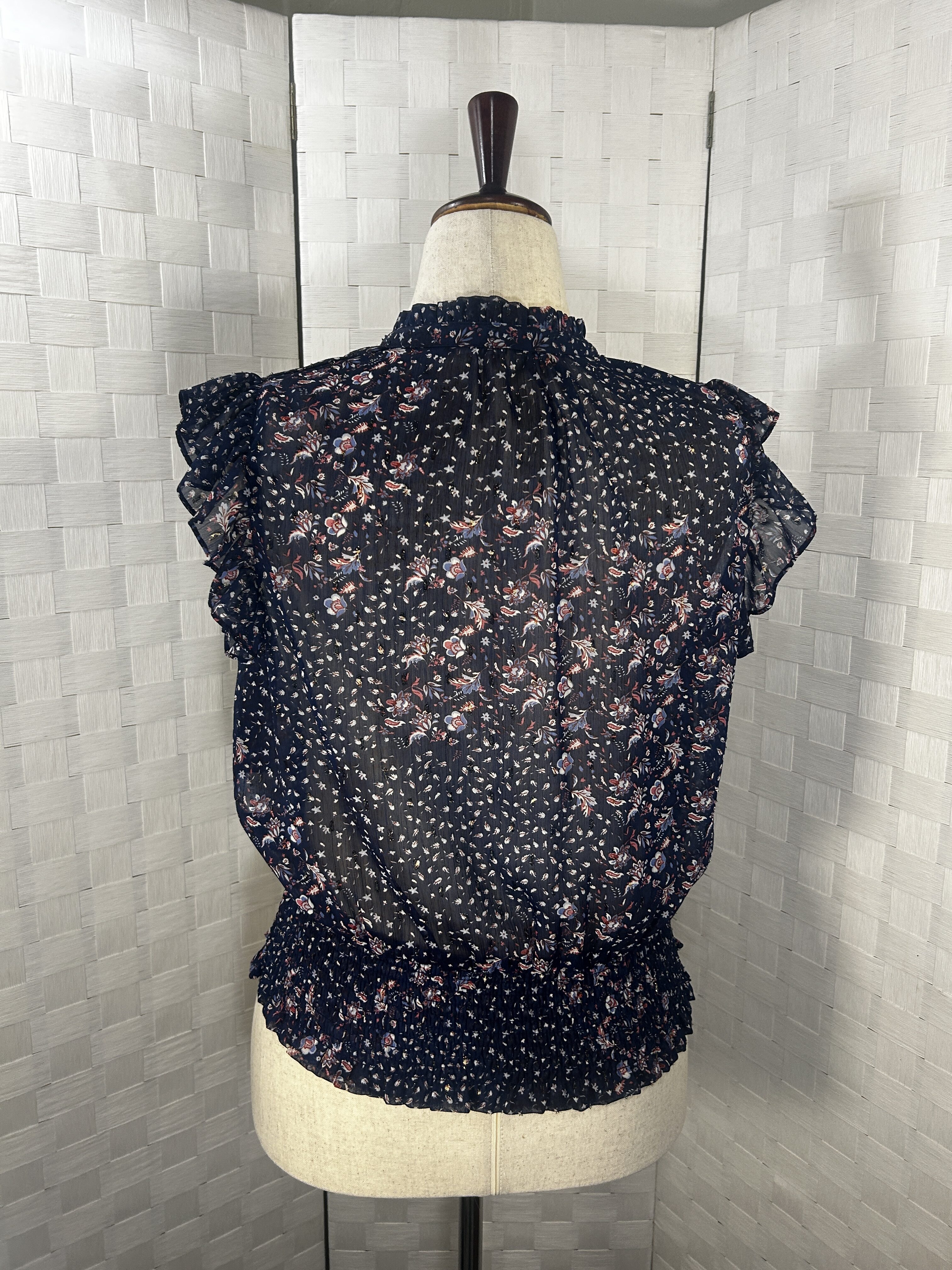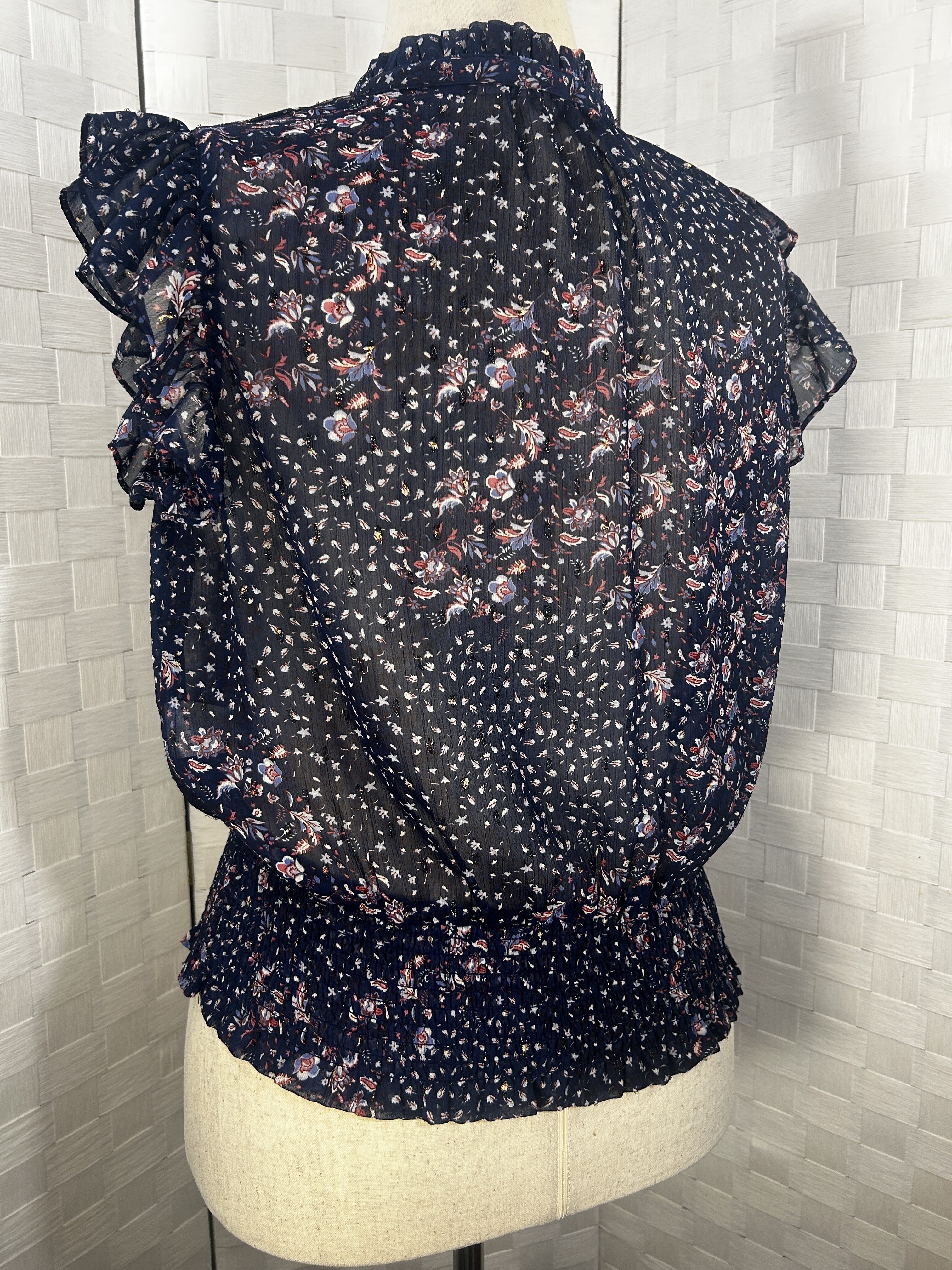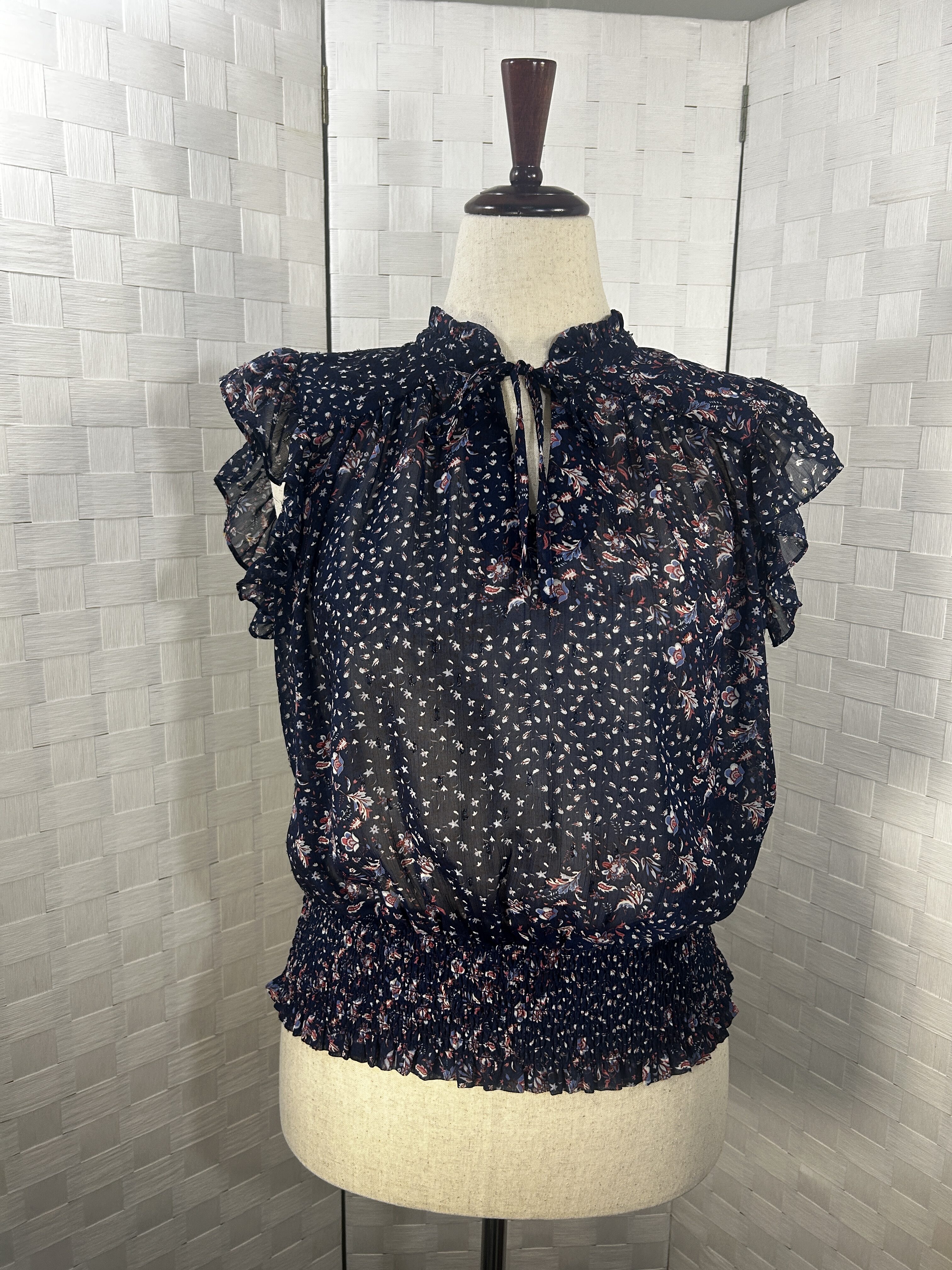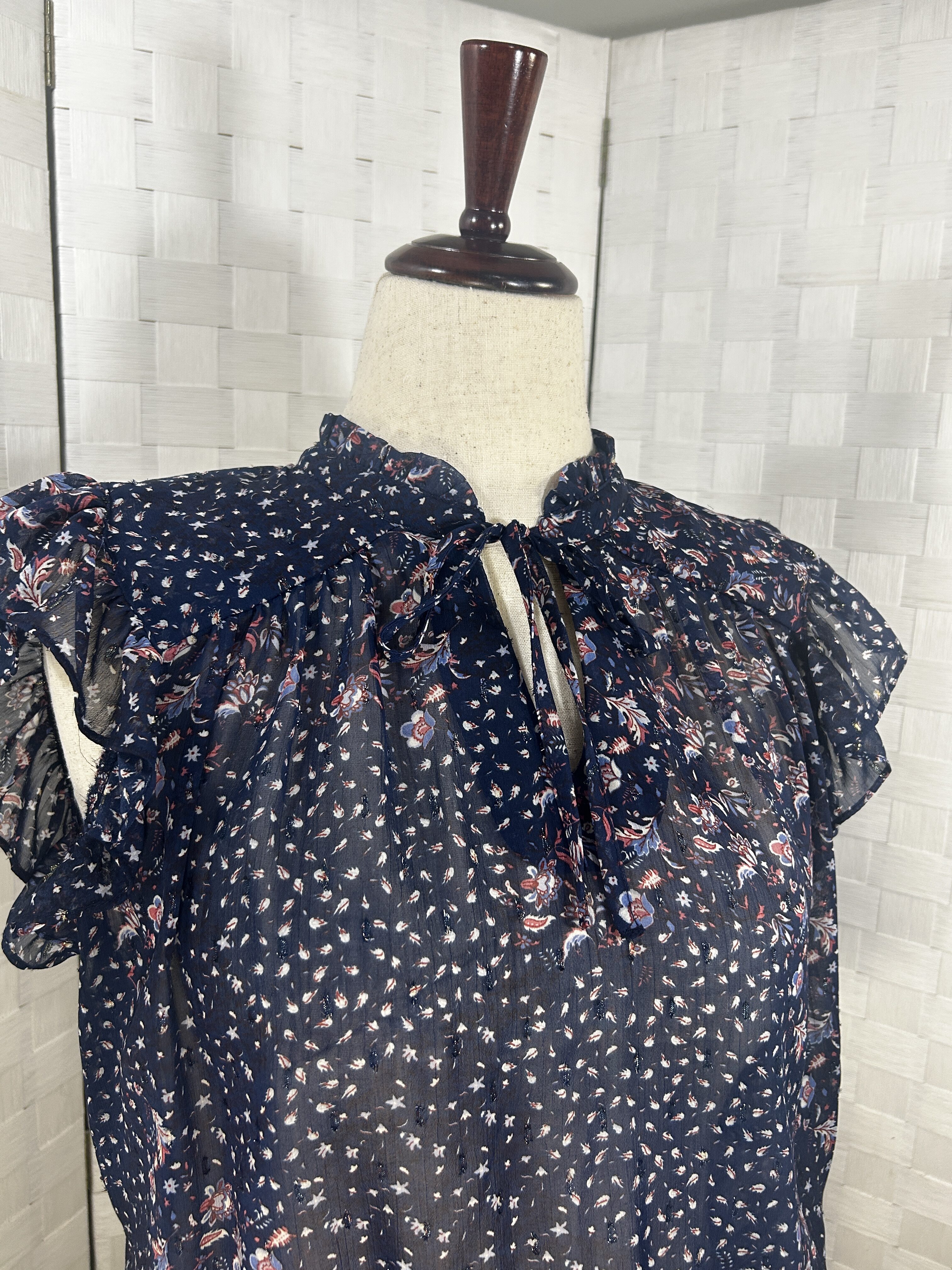 Joie sheer navy floral blouse- Cap ruffle sleeves (L)