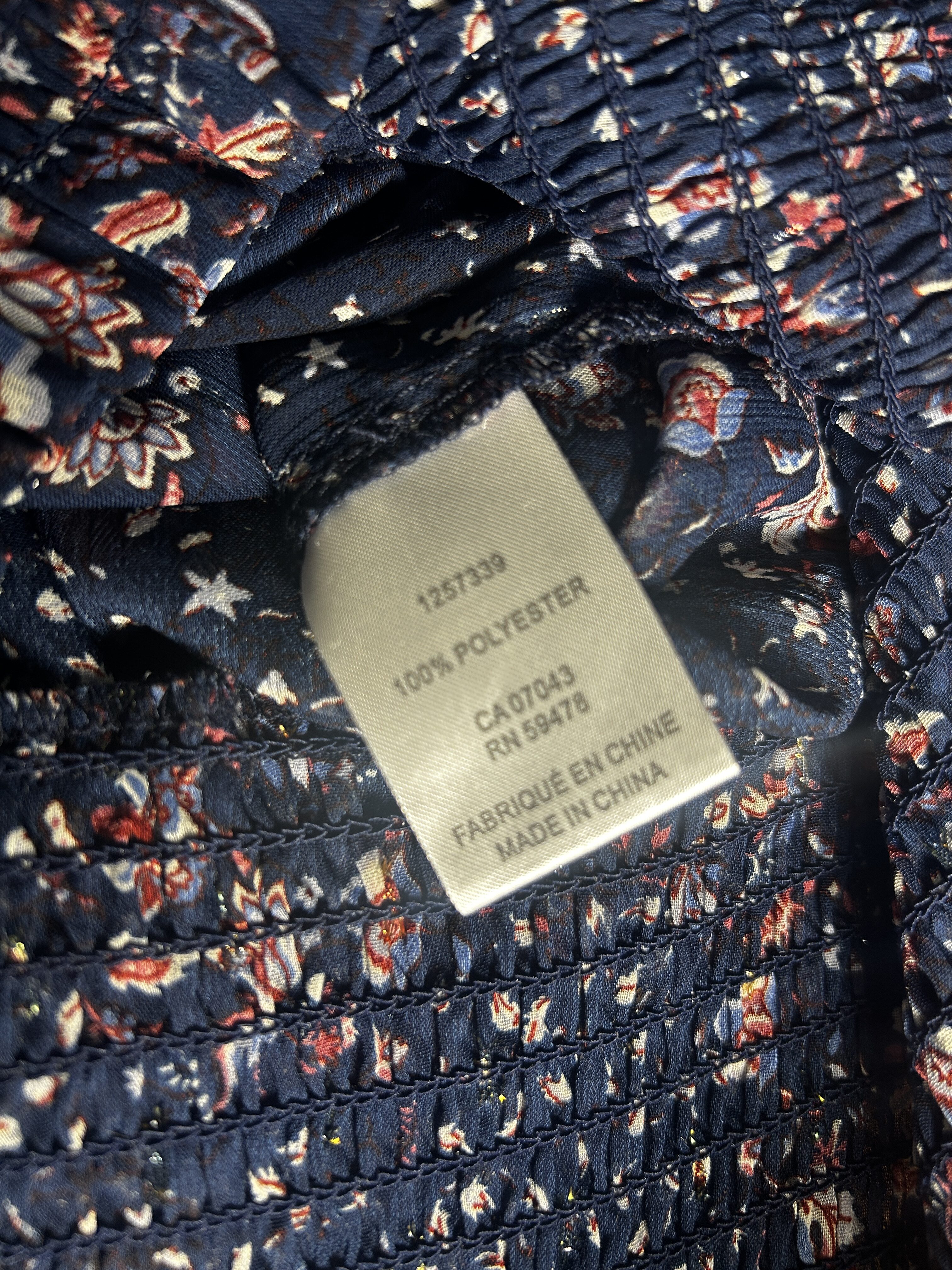 Floral pattern with small flecks of gold metallic fabric throughout. Ruffle sleeves with smocked waist.
