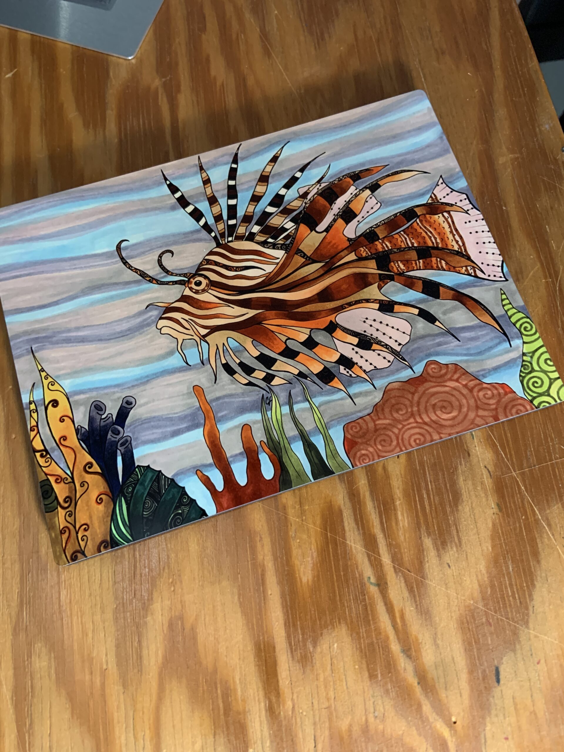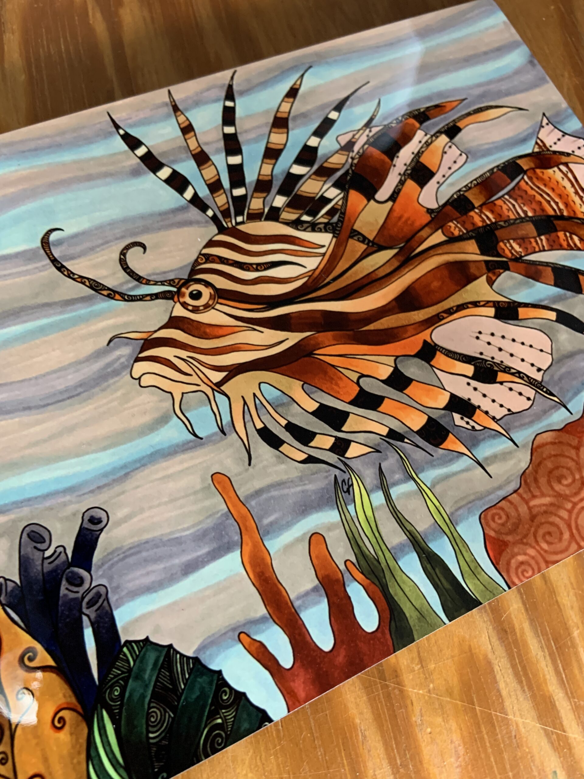 Art print 6×8 hard panel, with reposition-able pad or hanger. Lion Fish