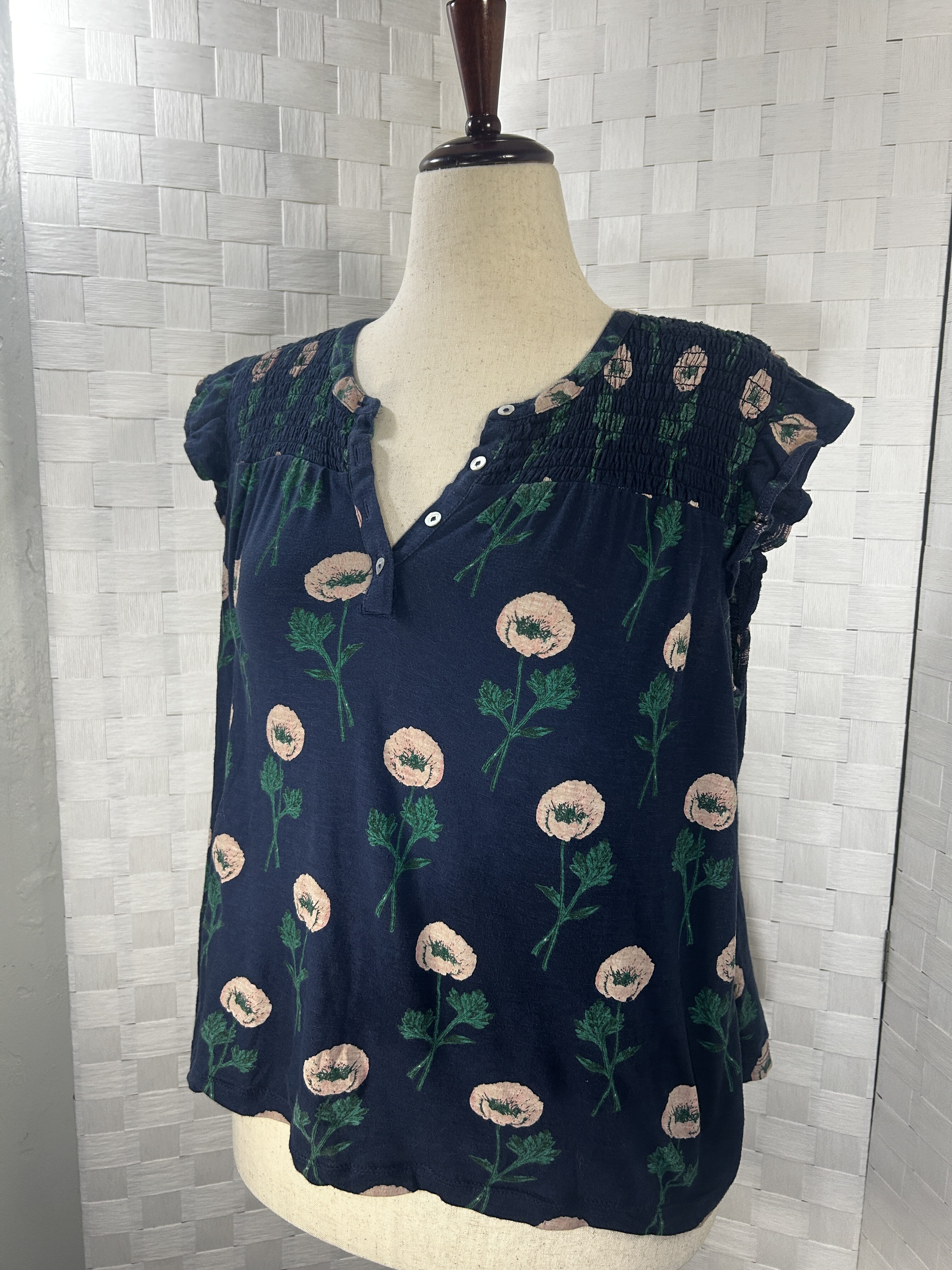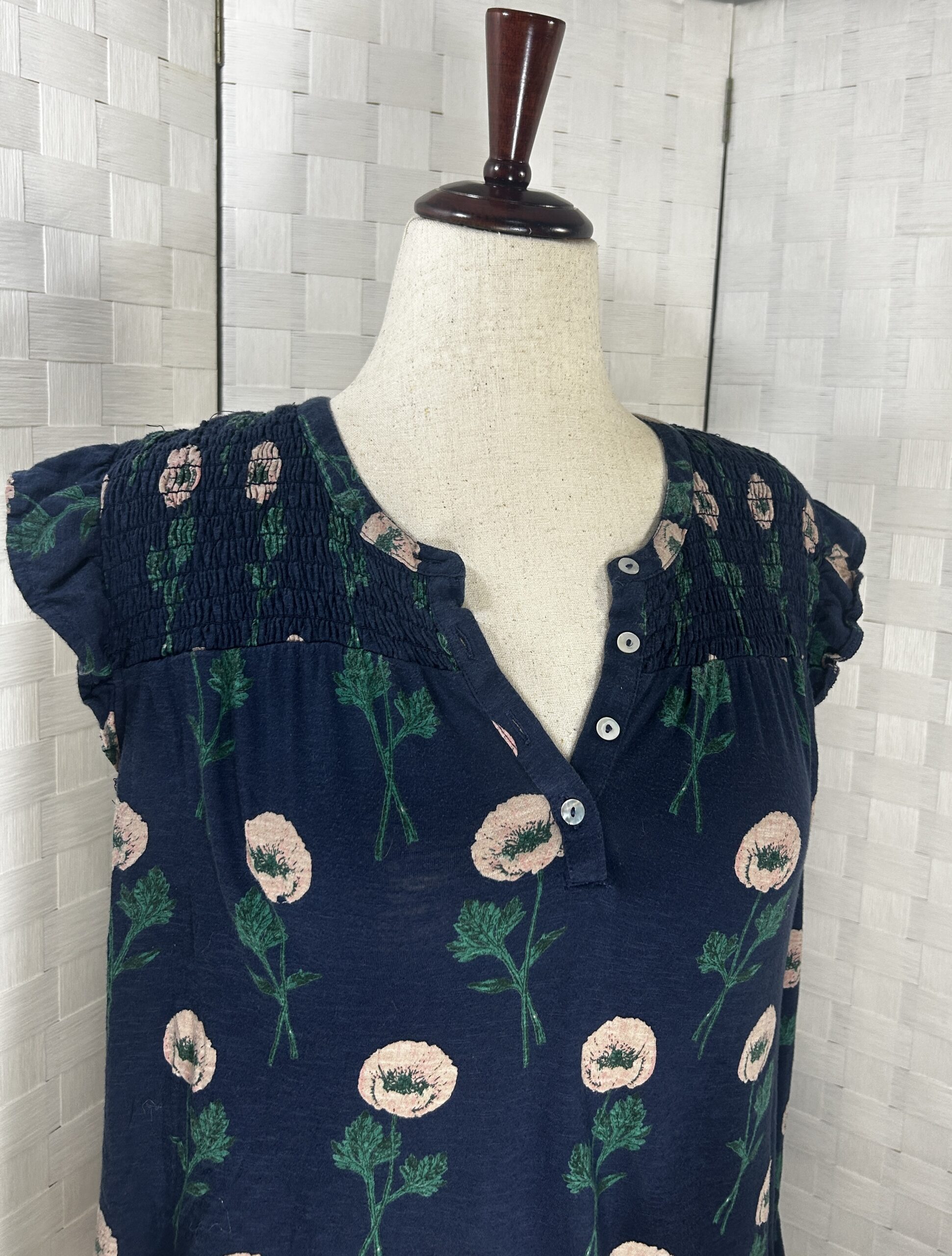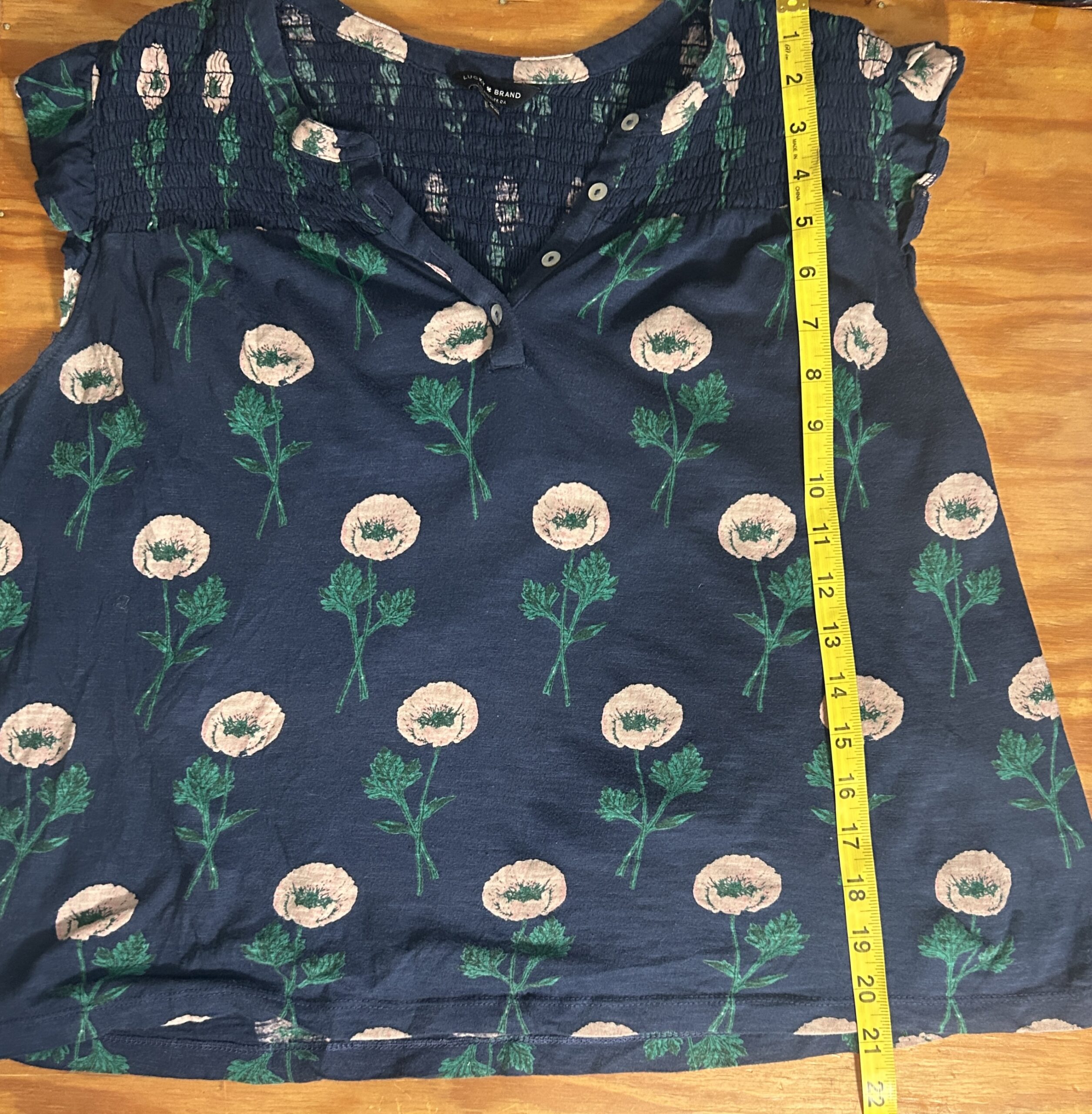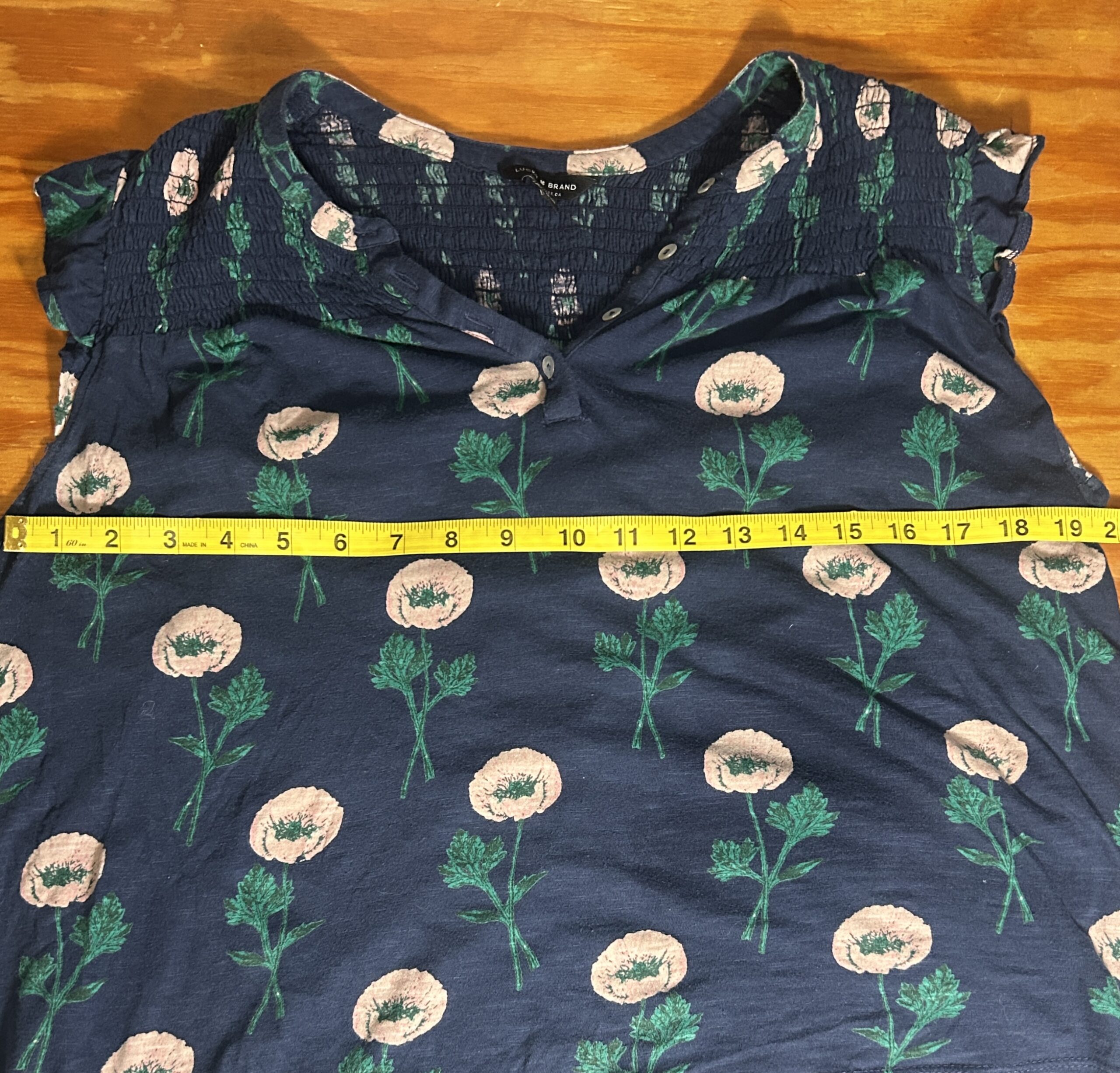 Size large- runs a bit smaller in my opinion measures approx: 19″ across the chest when laid flat and 21″ from top of the shoulder to hem.