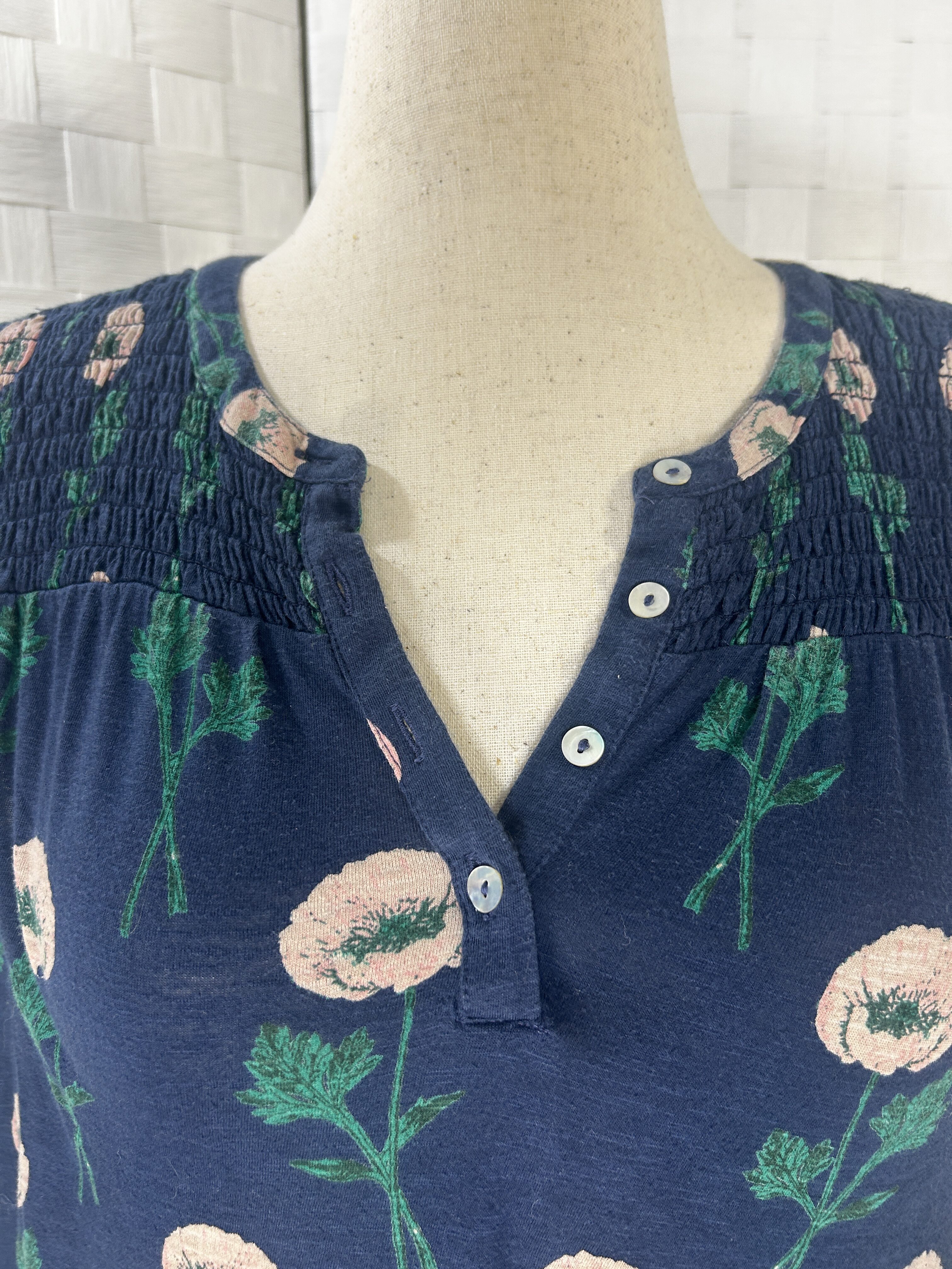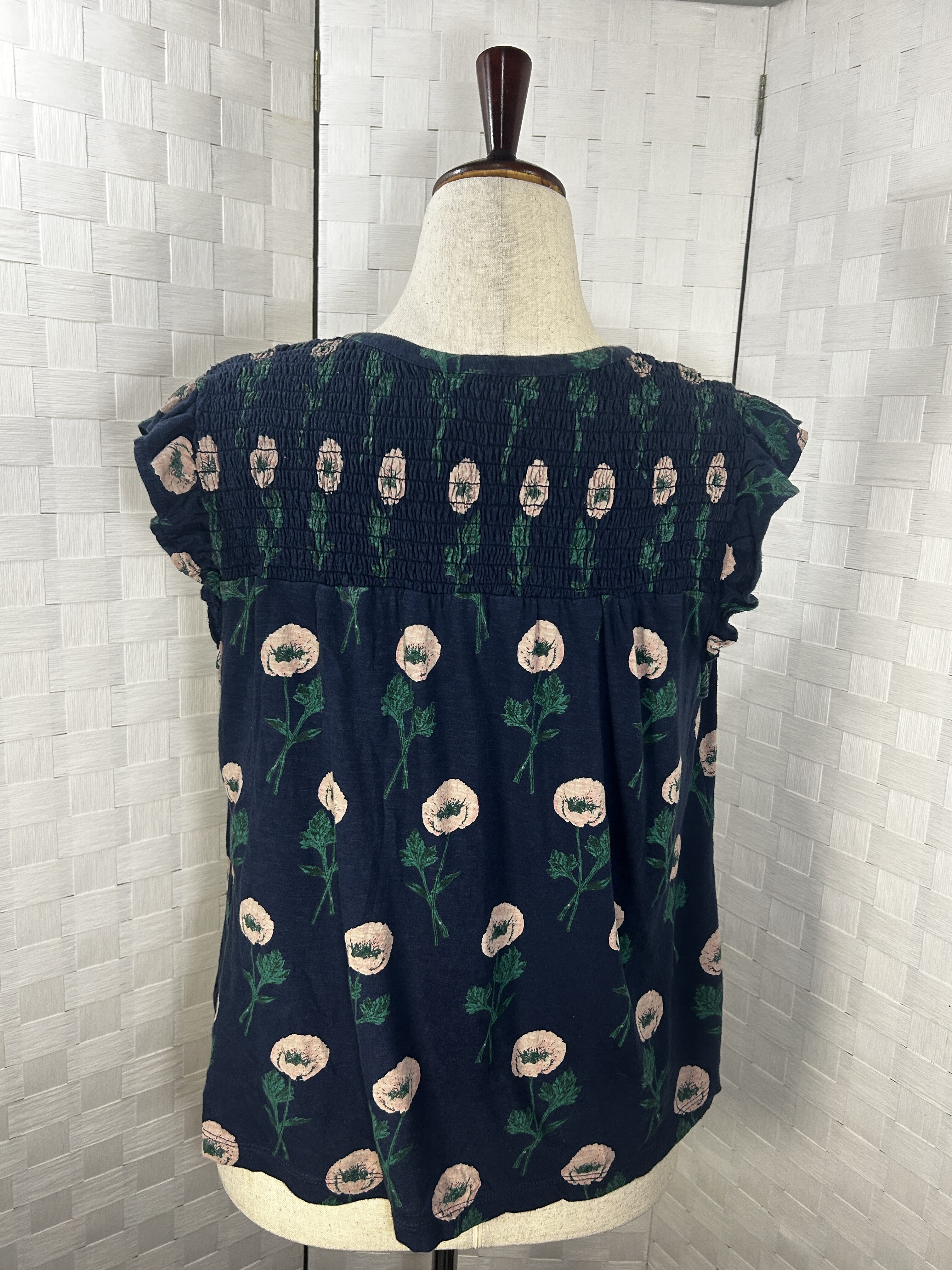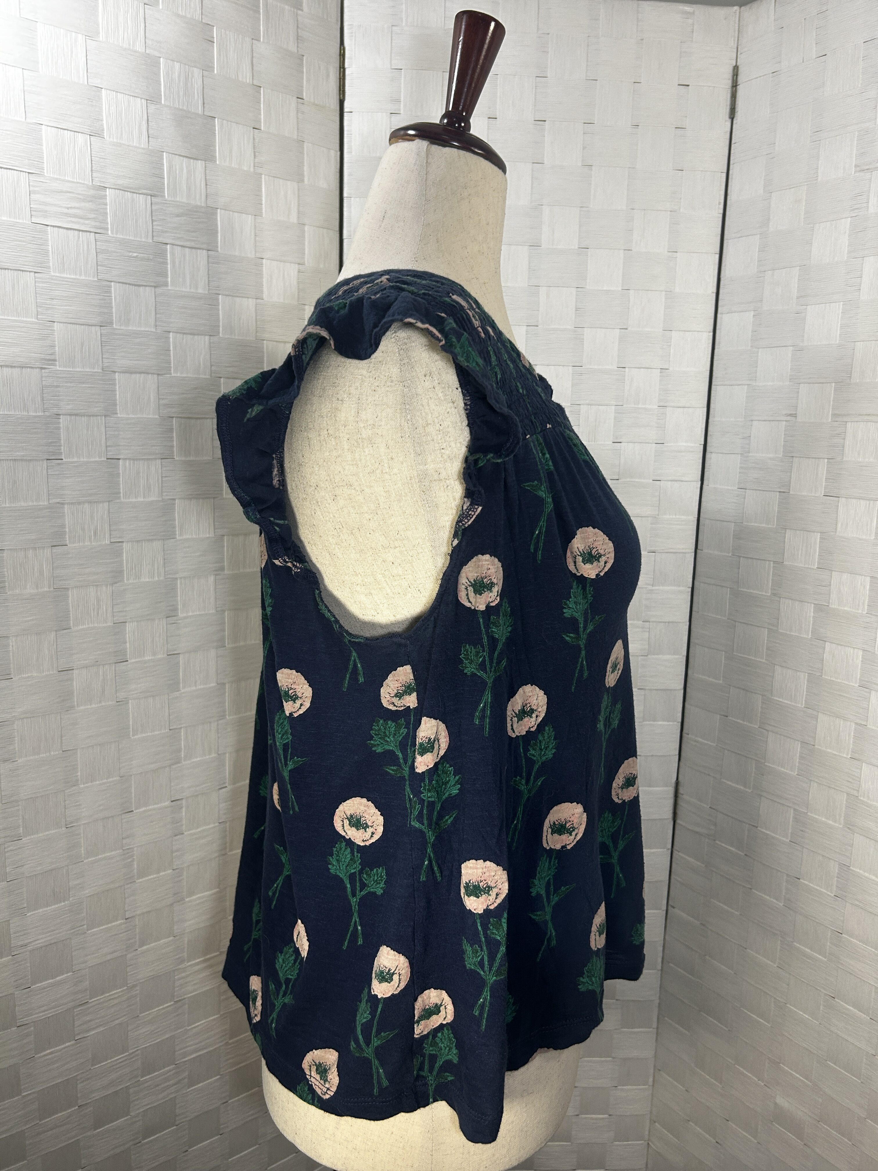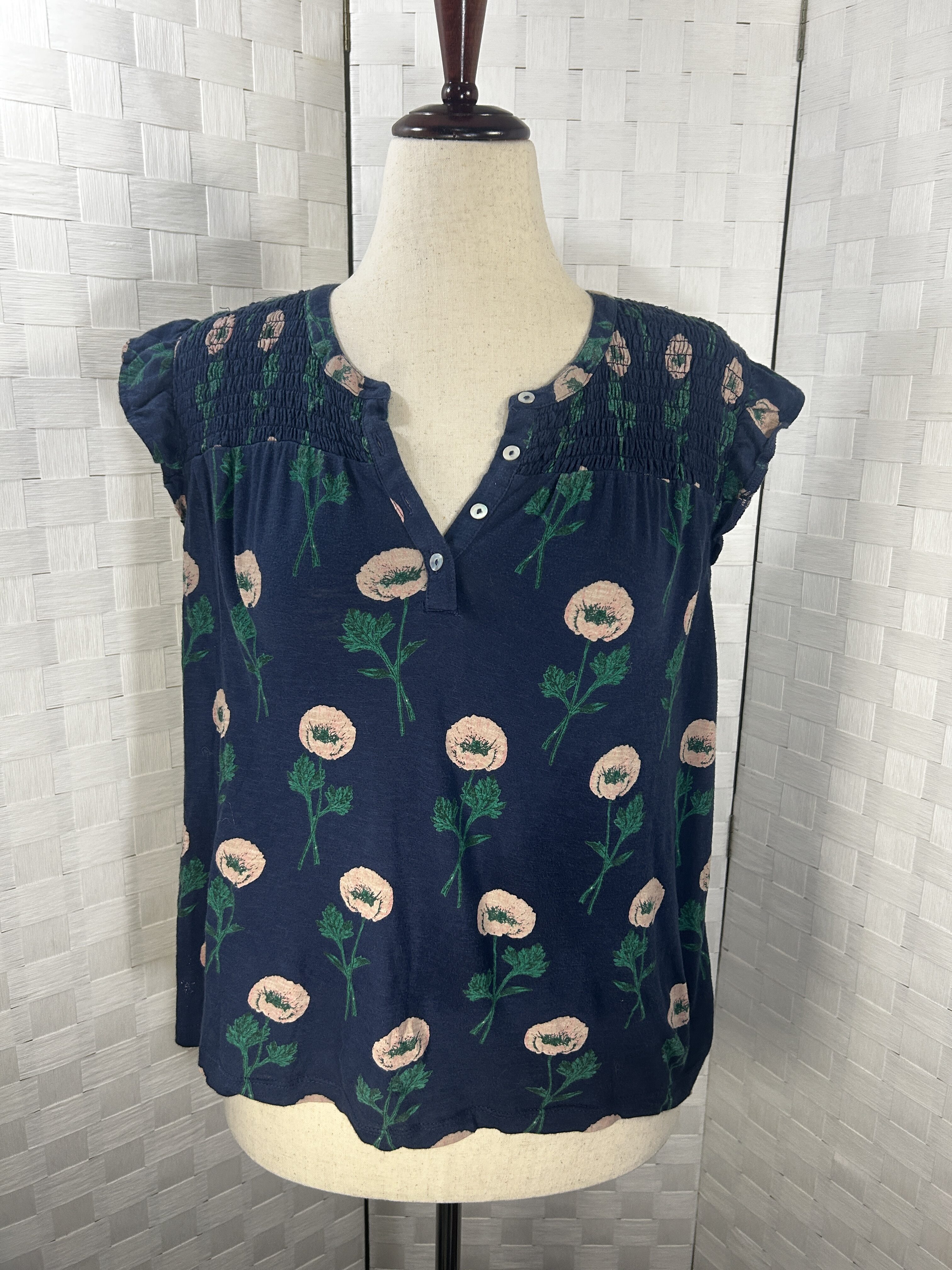 Size large- runs a bit smaller in my opinion measures approx: 19″ across the chest when laid flat and 21″ from top of the shoulder to hem.