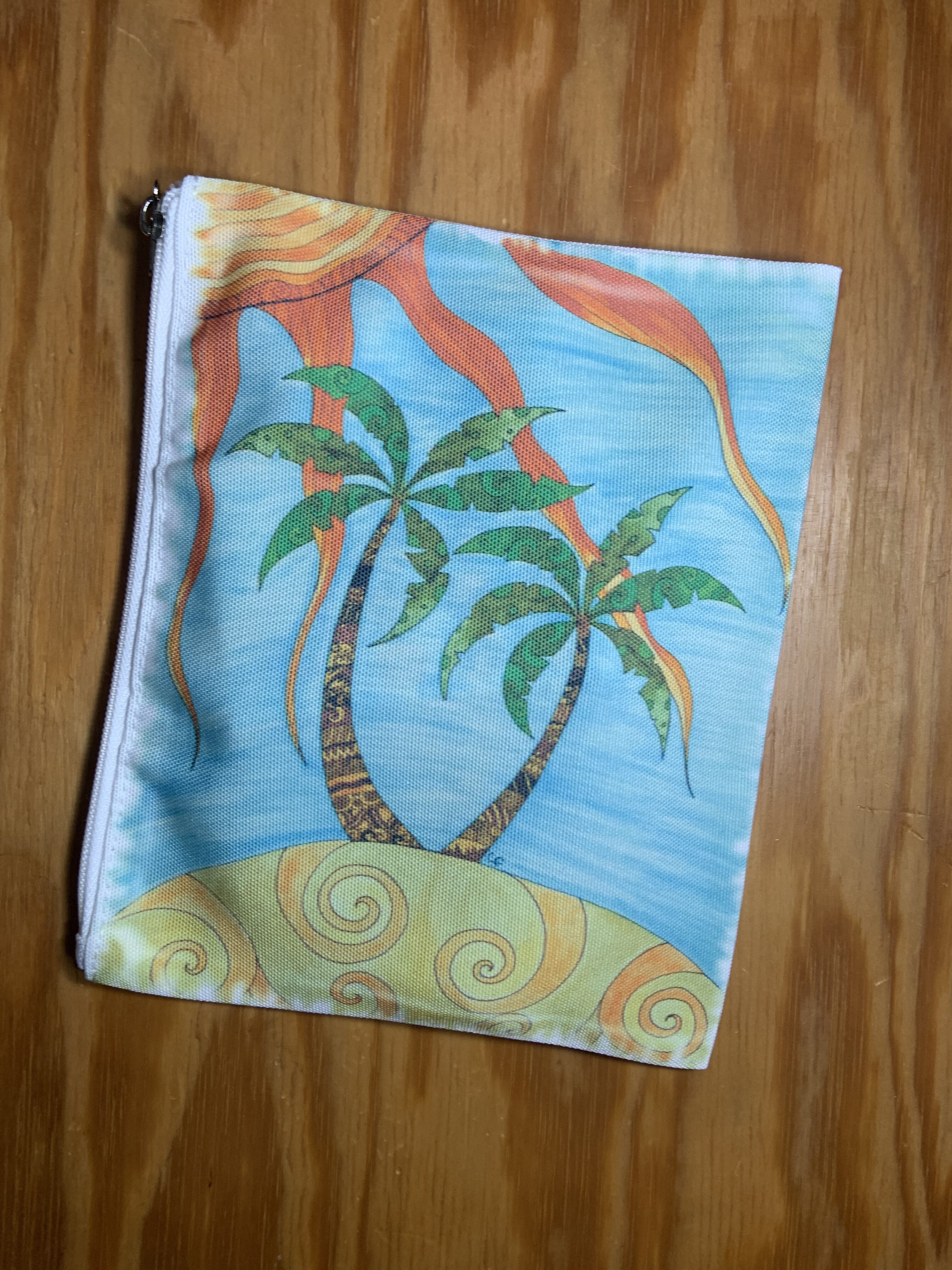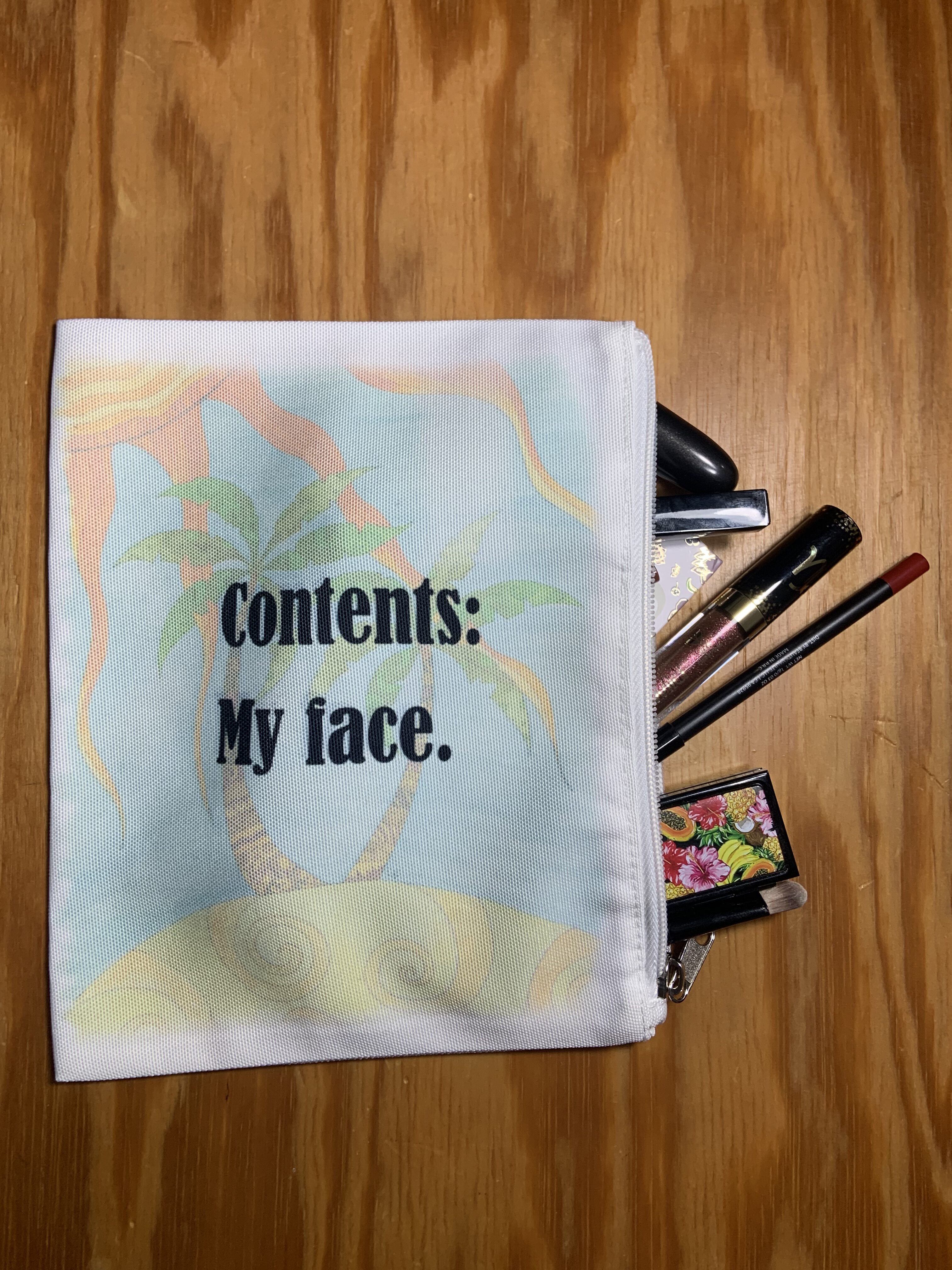 Large makeup bag, palm trees image on one side, “Contents: my face” saying on other side. 9.5×7.5