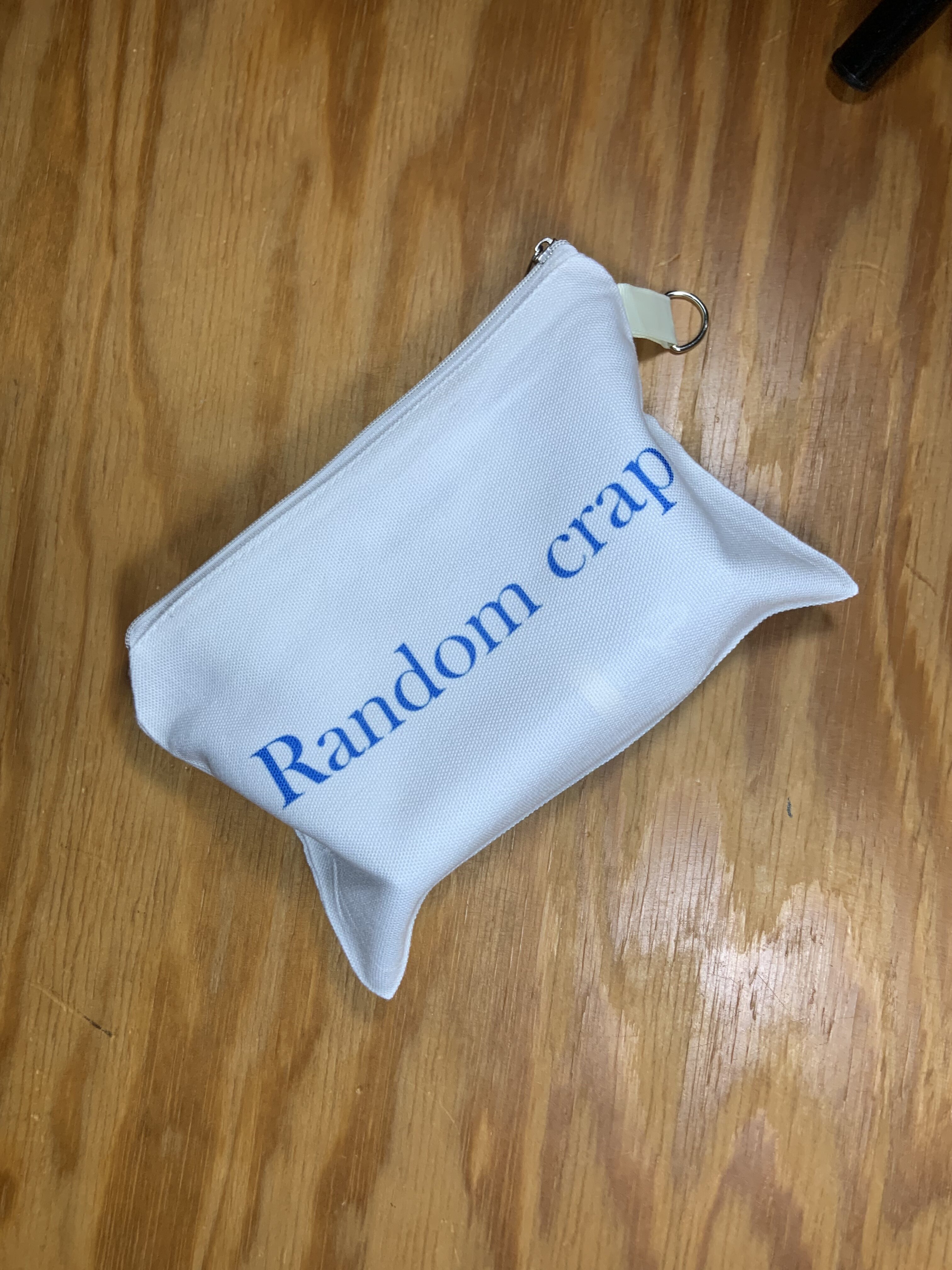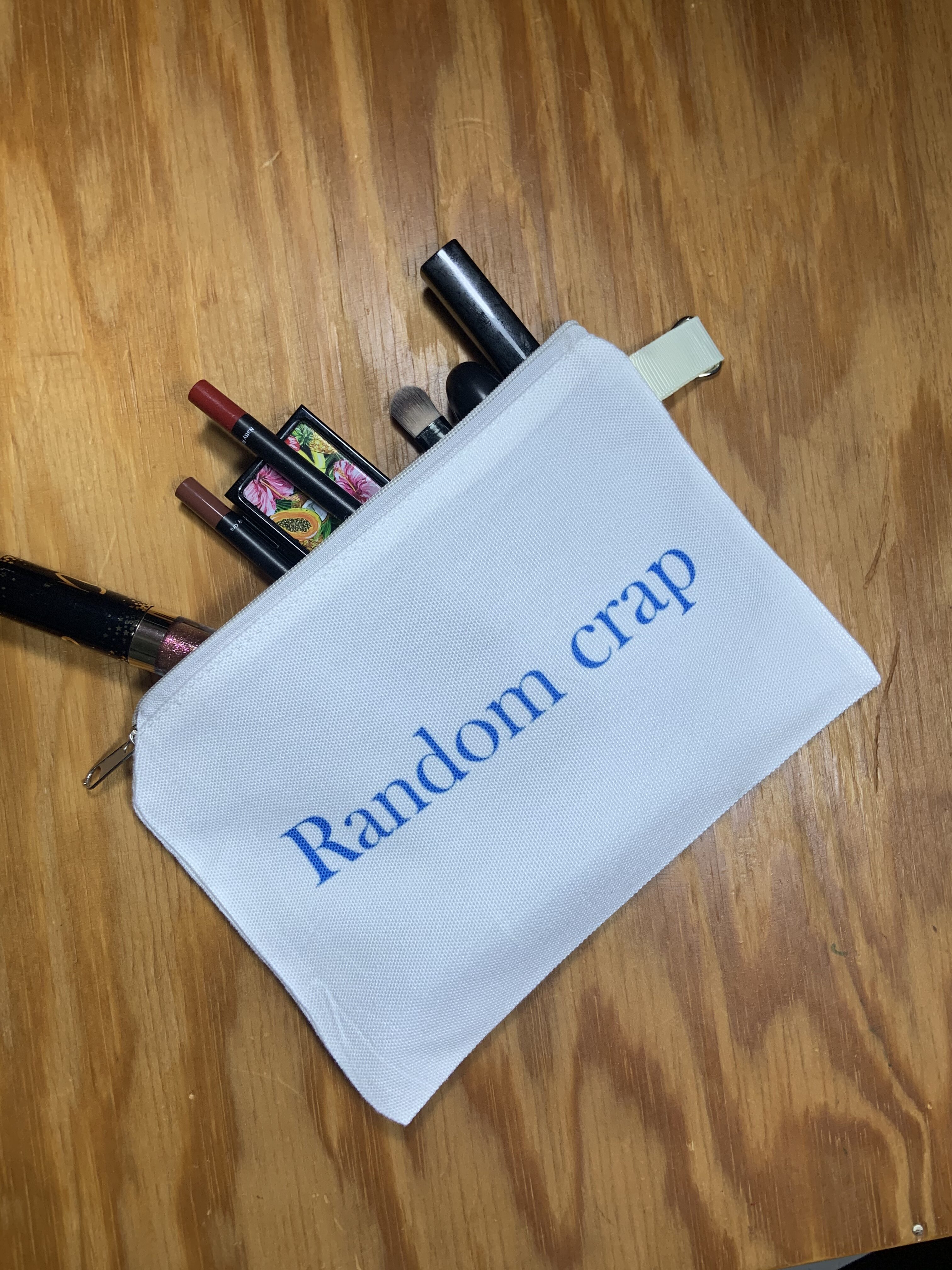 Small makeup bag. Peacock image on one side, “Random crap” saying on other side.