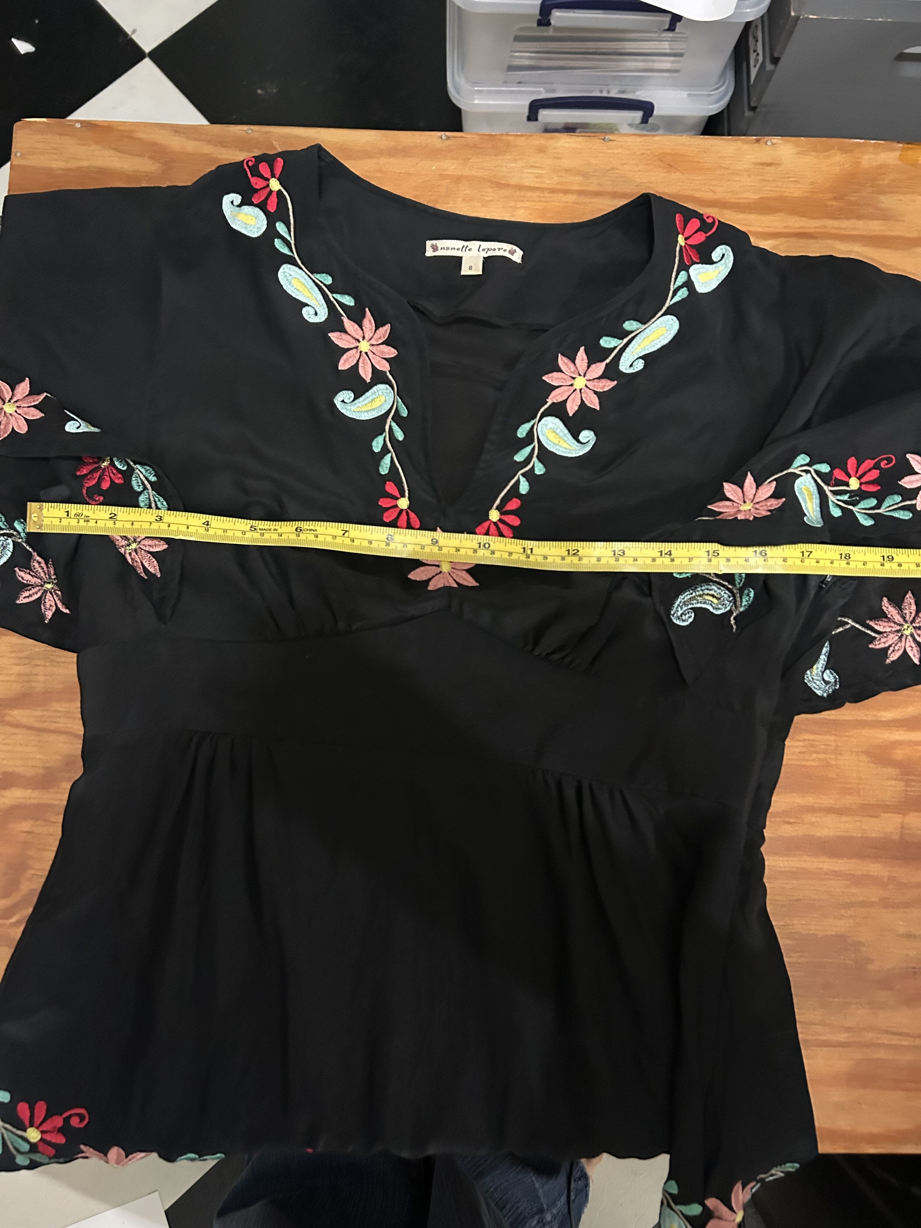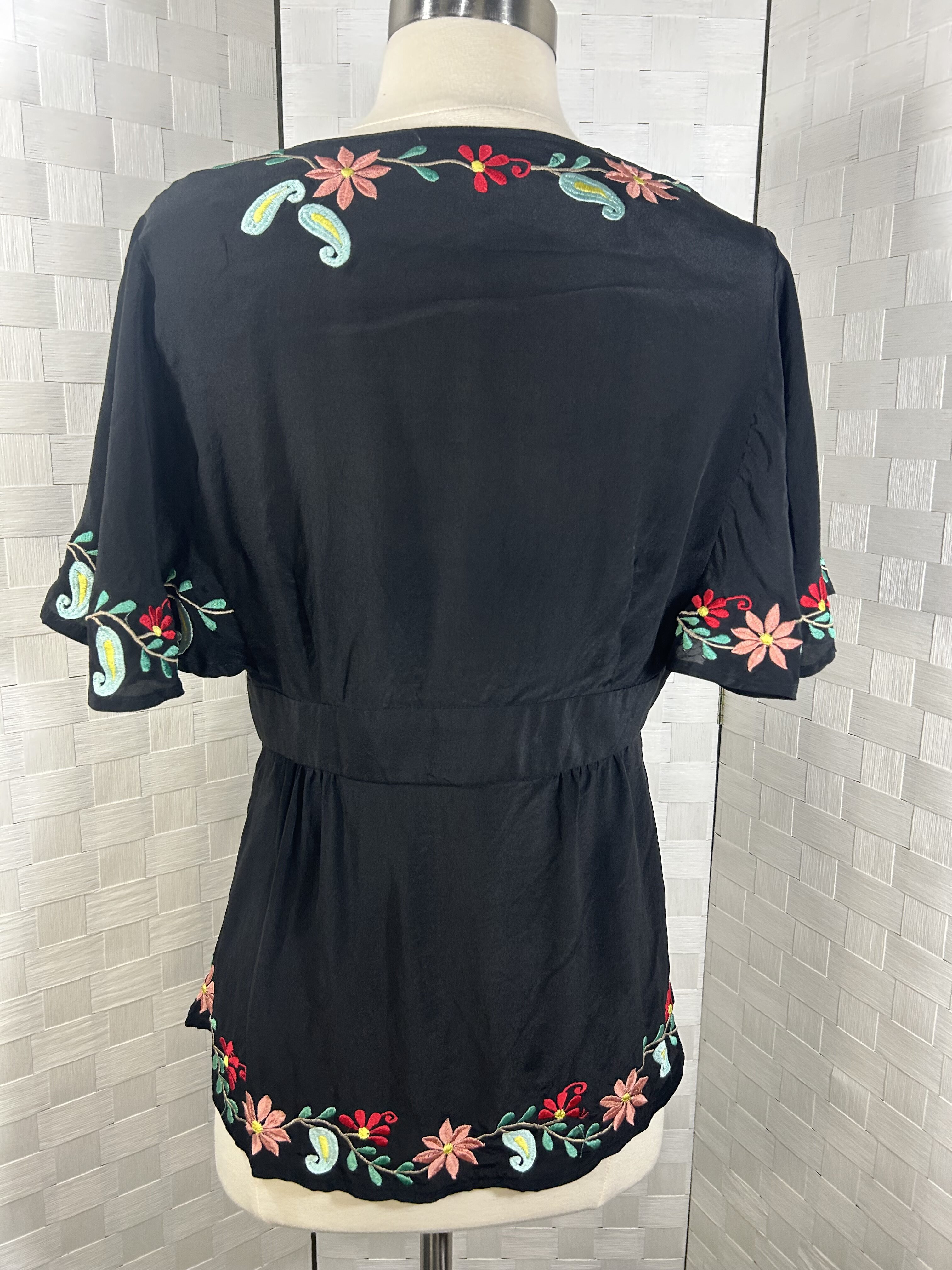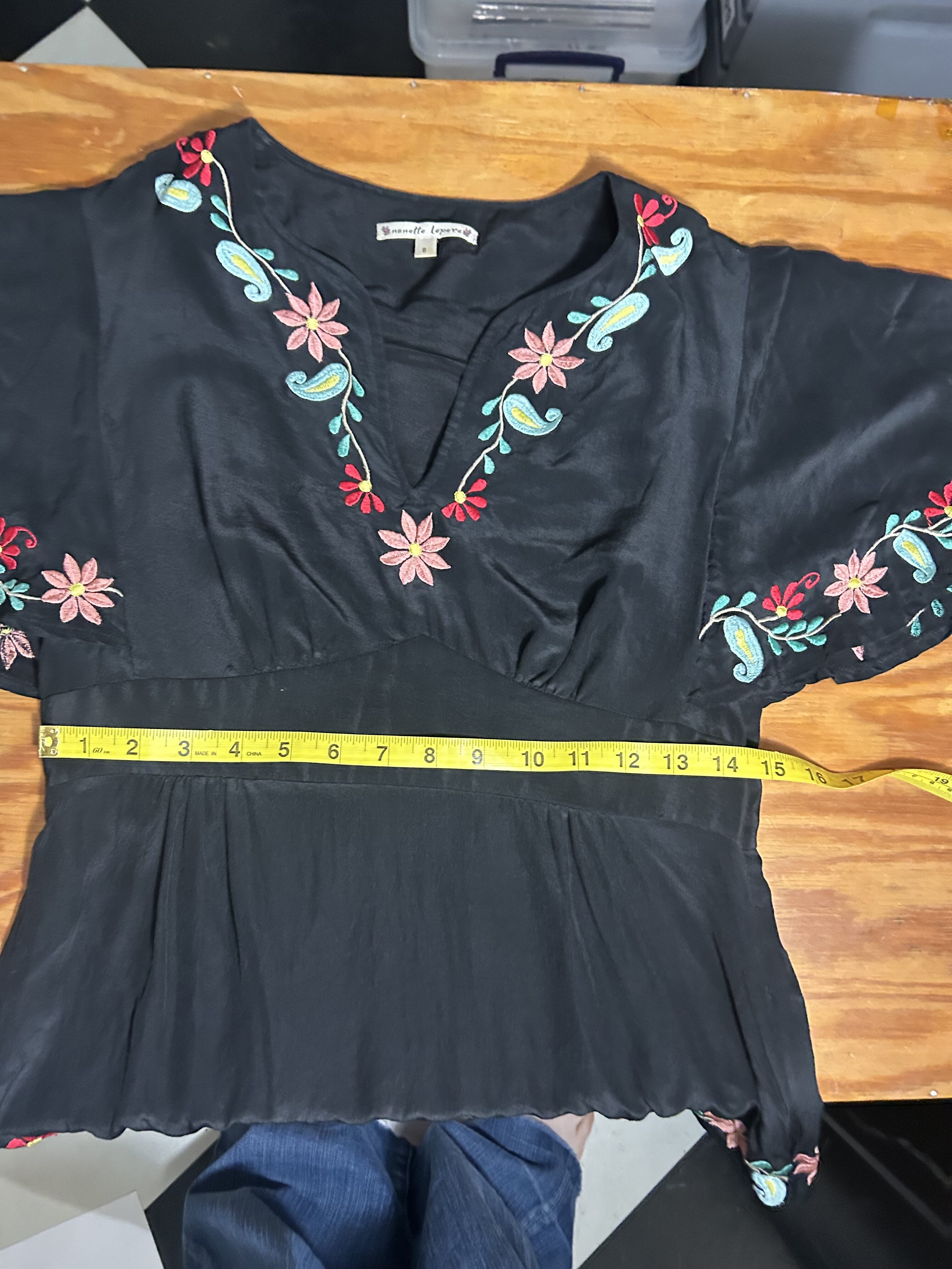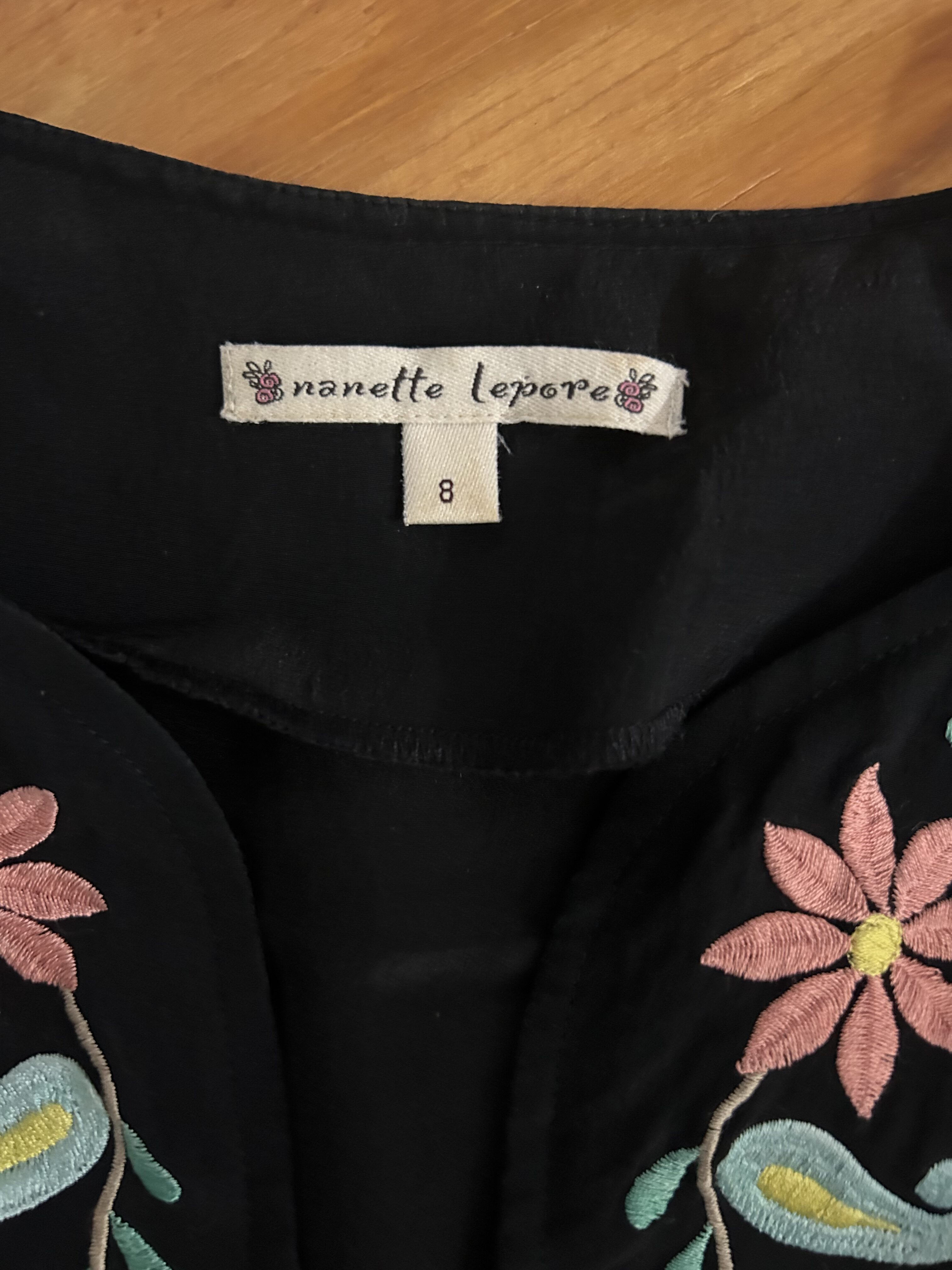 Nanette Lepore Black silk blouse with flutter sleeves, and bright floral trim.