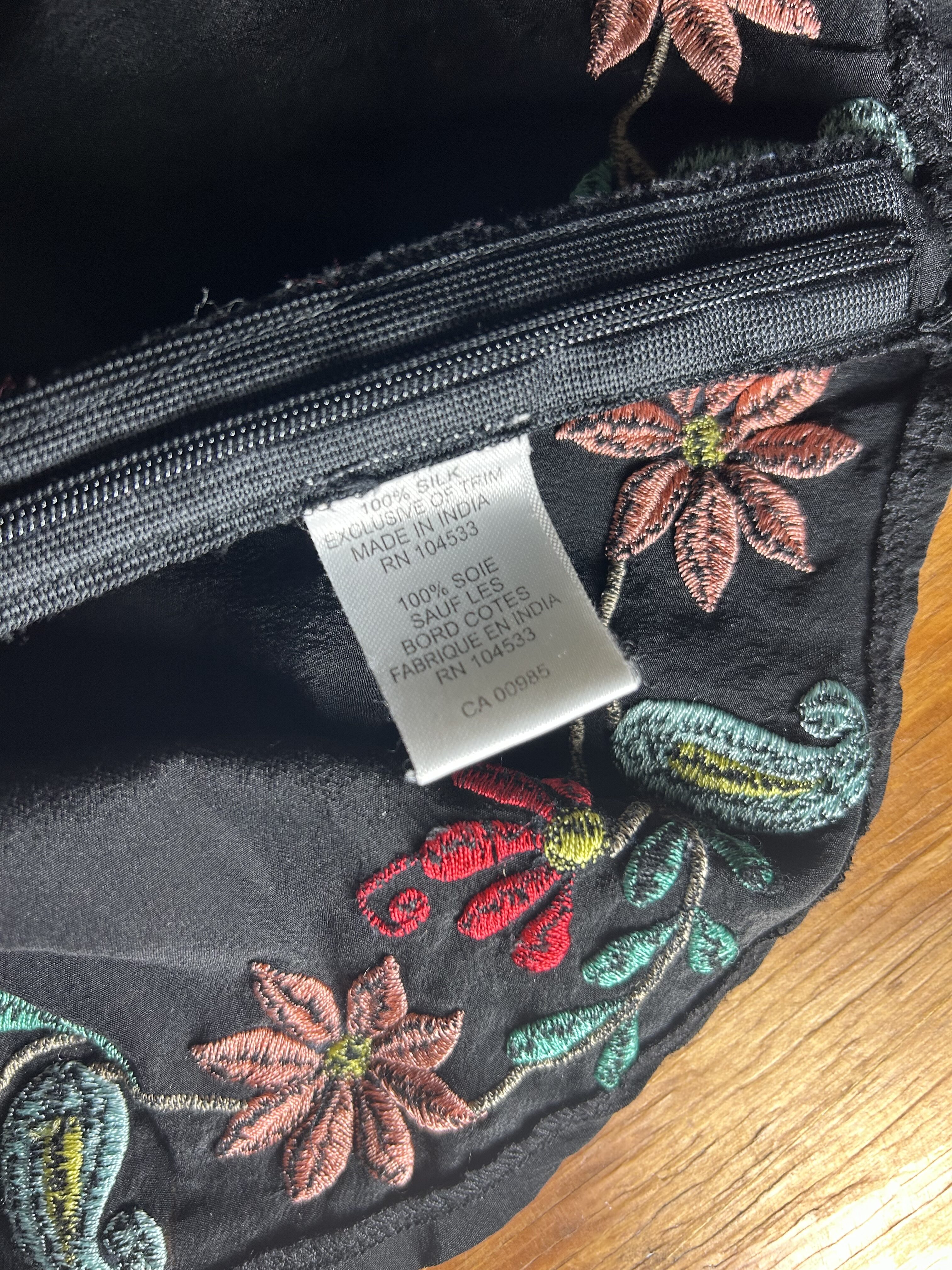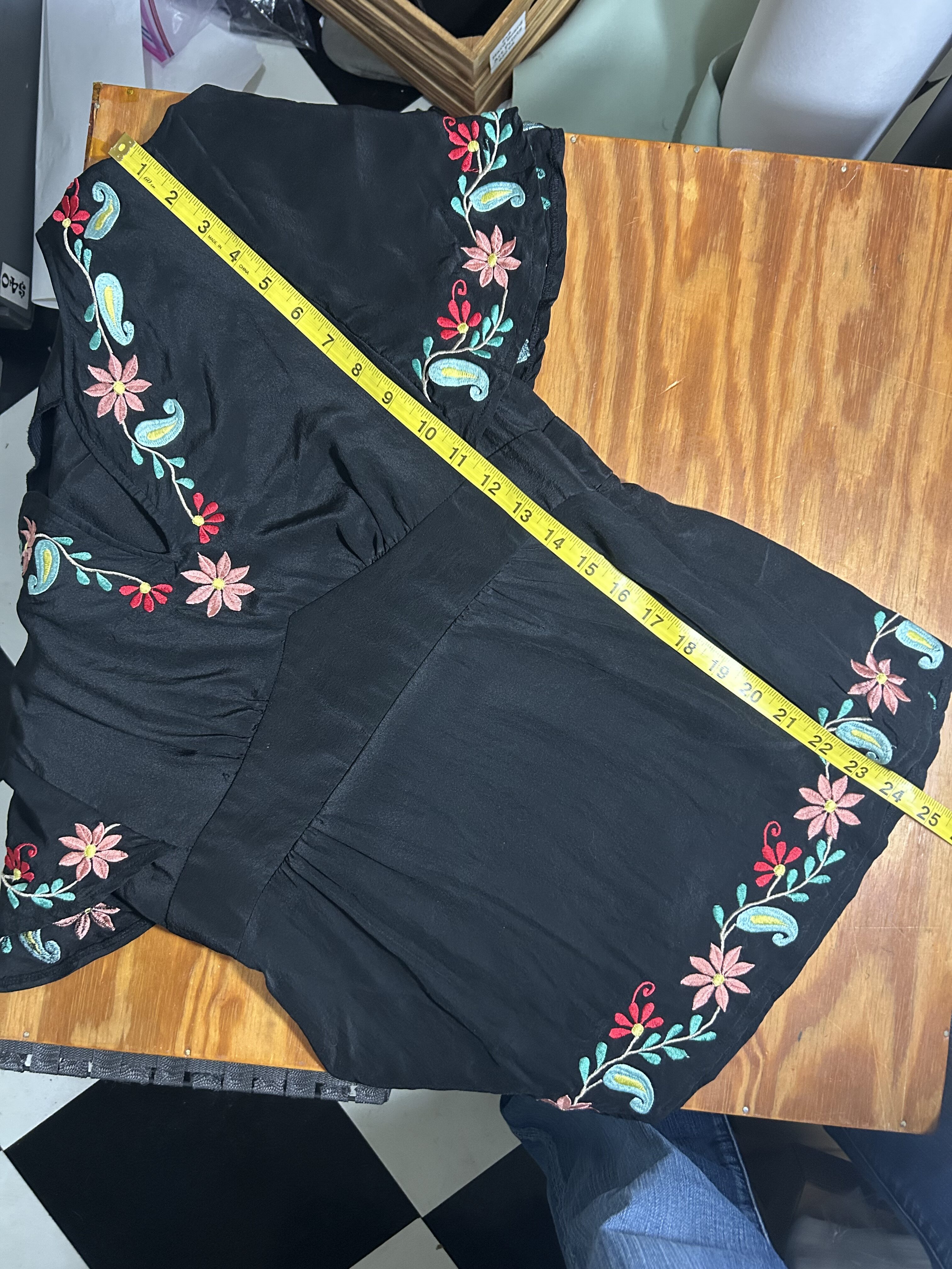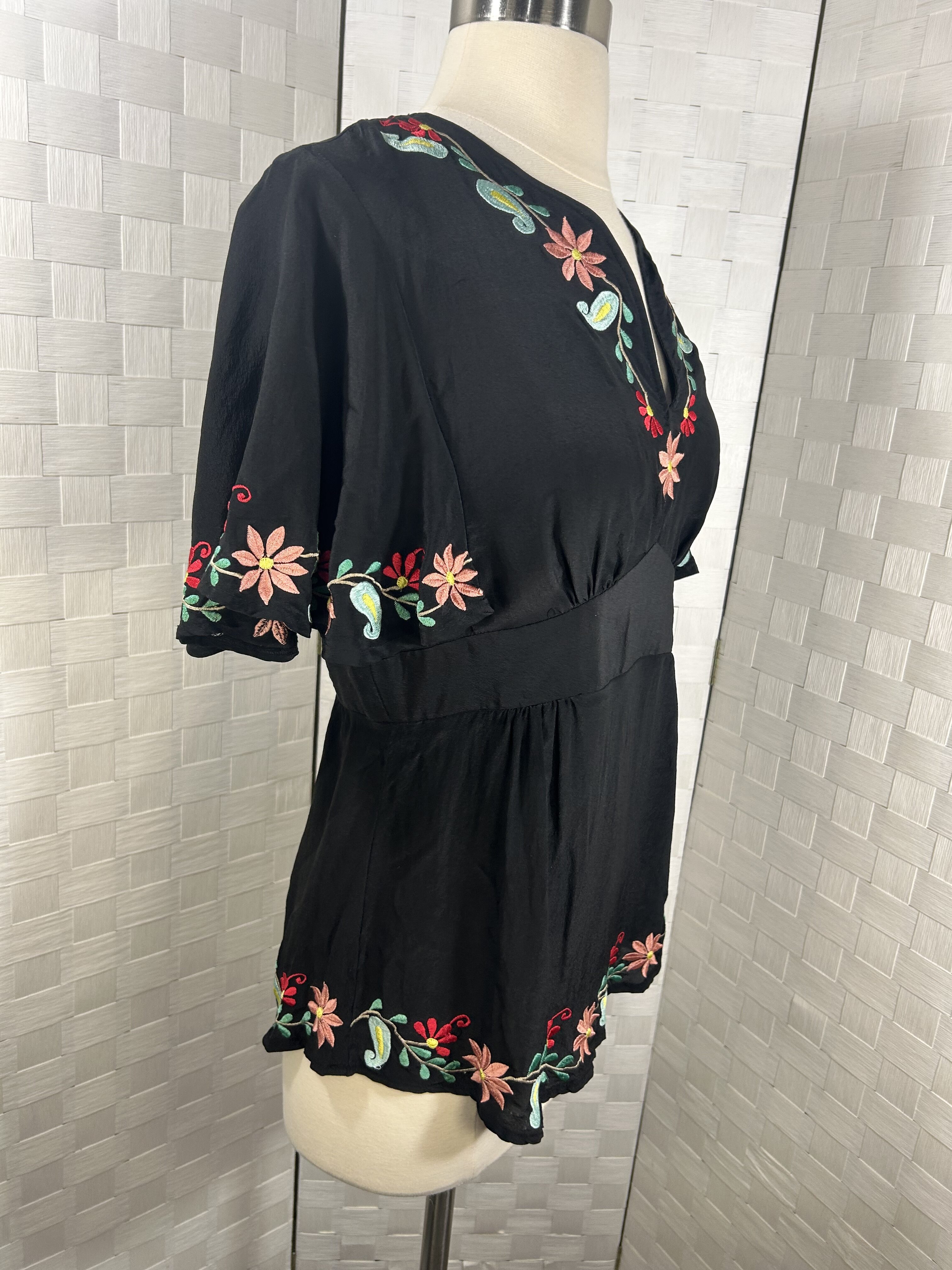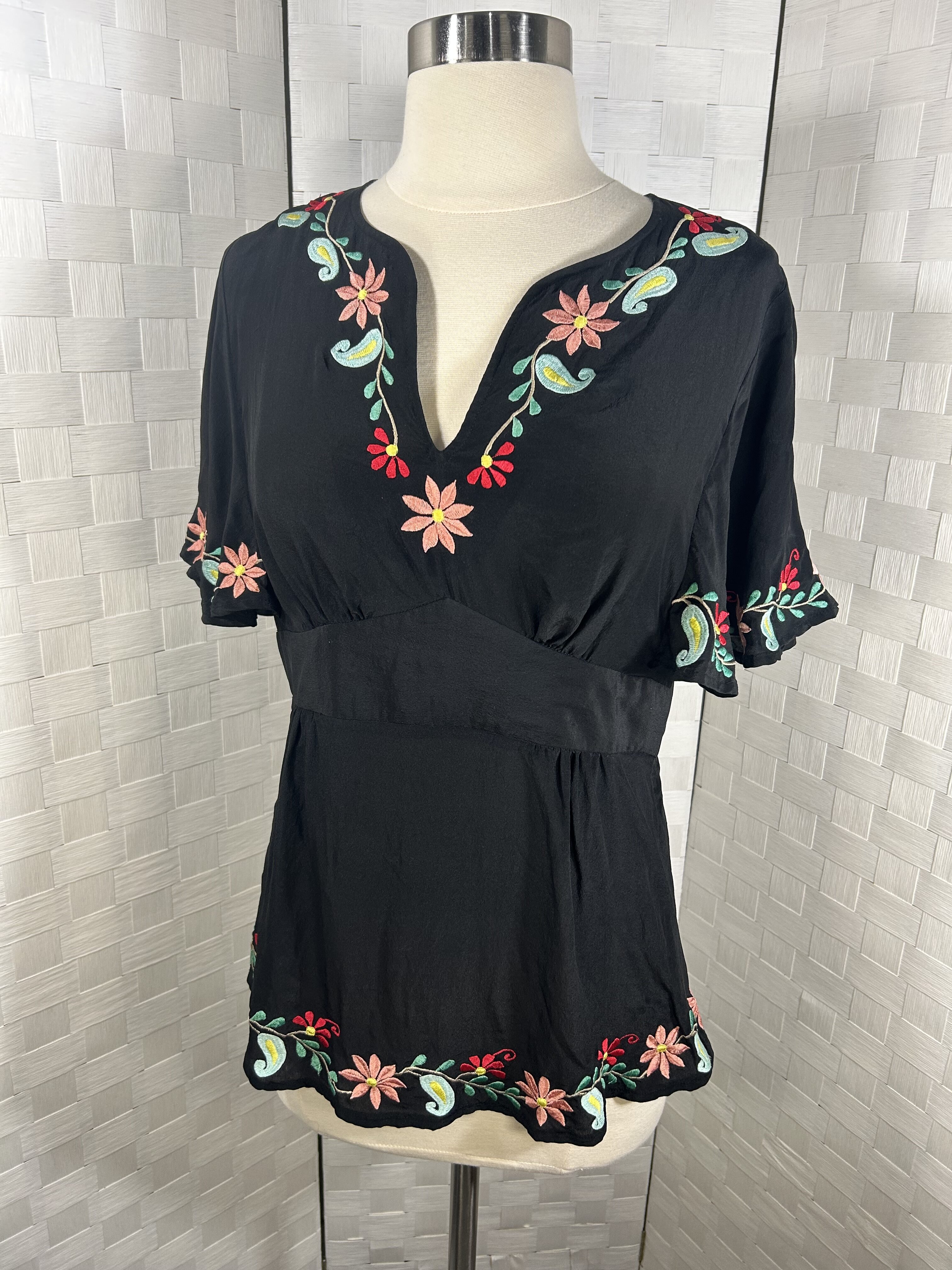 Nanette Lepore Black silk blouse with flutter sleeves, and bright floral trim.