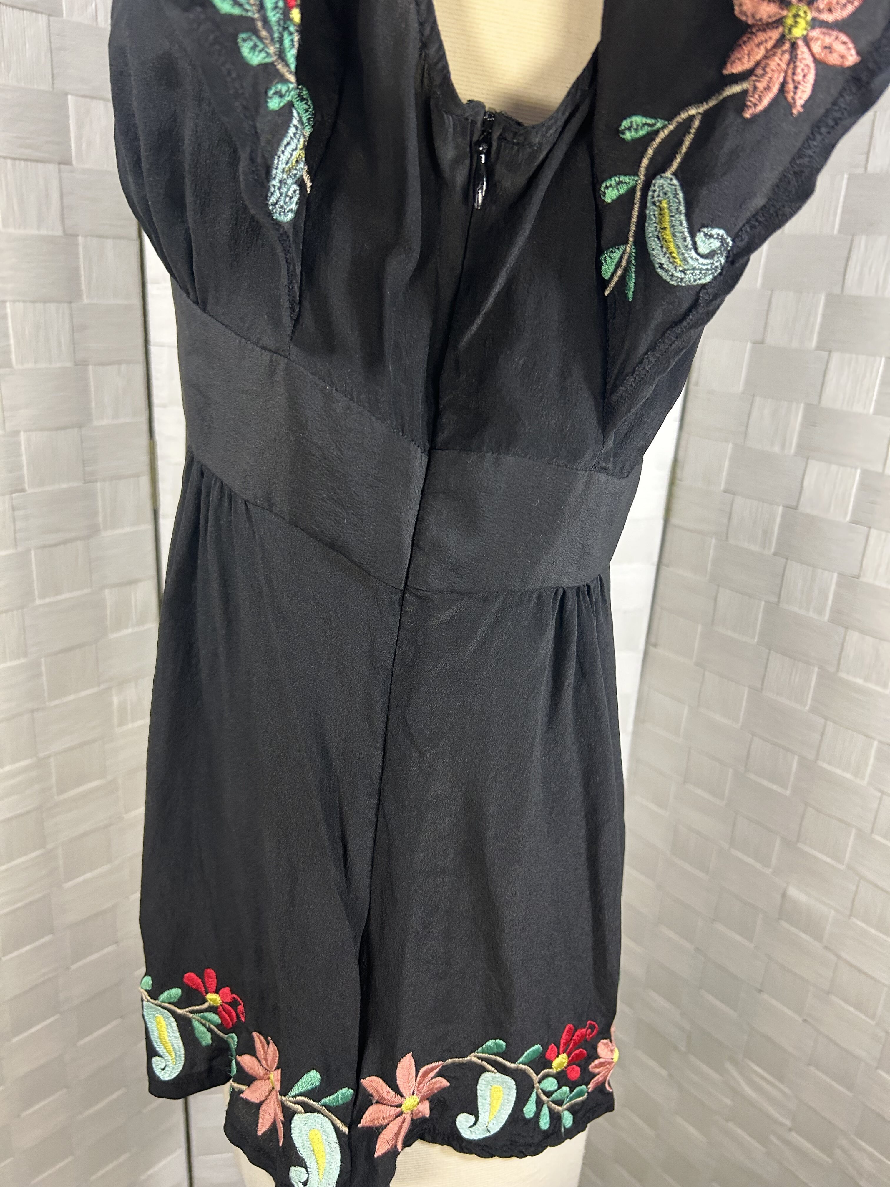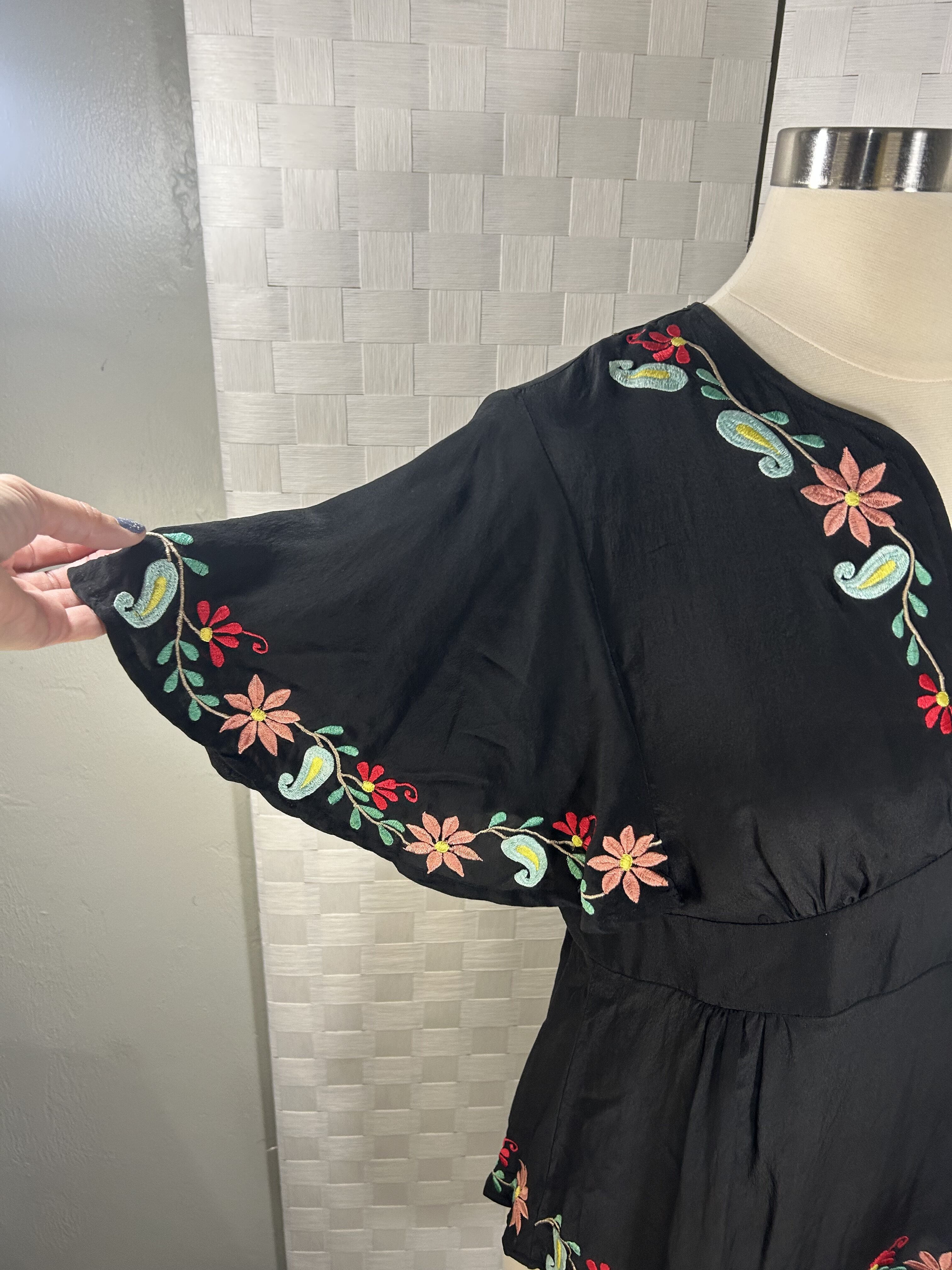 Nanette Lepore Black silk blouse with flutter sleeves, abd bright floral trim.