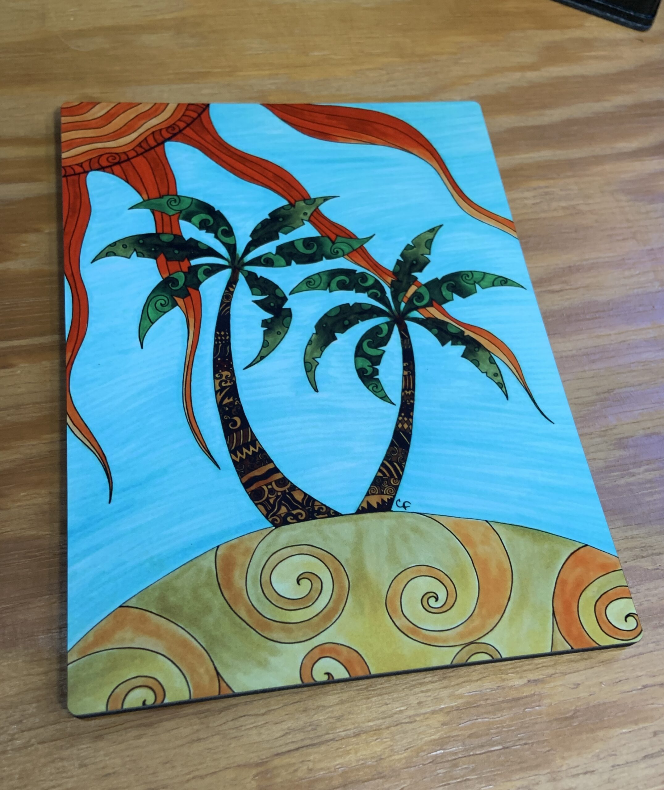 Art print 6”x8” hard panel, with reposition-able pad or hanger. Palm trees.