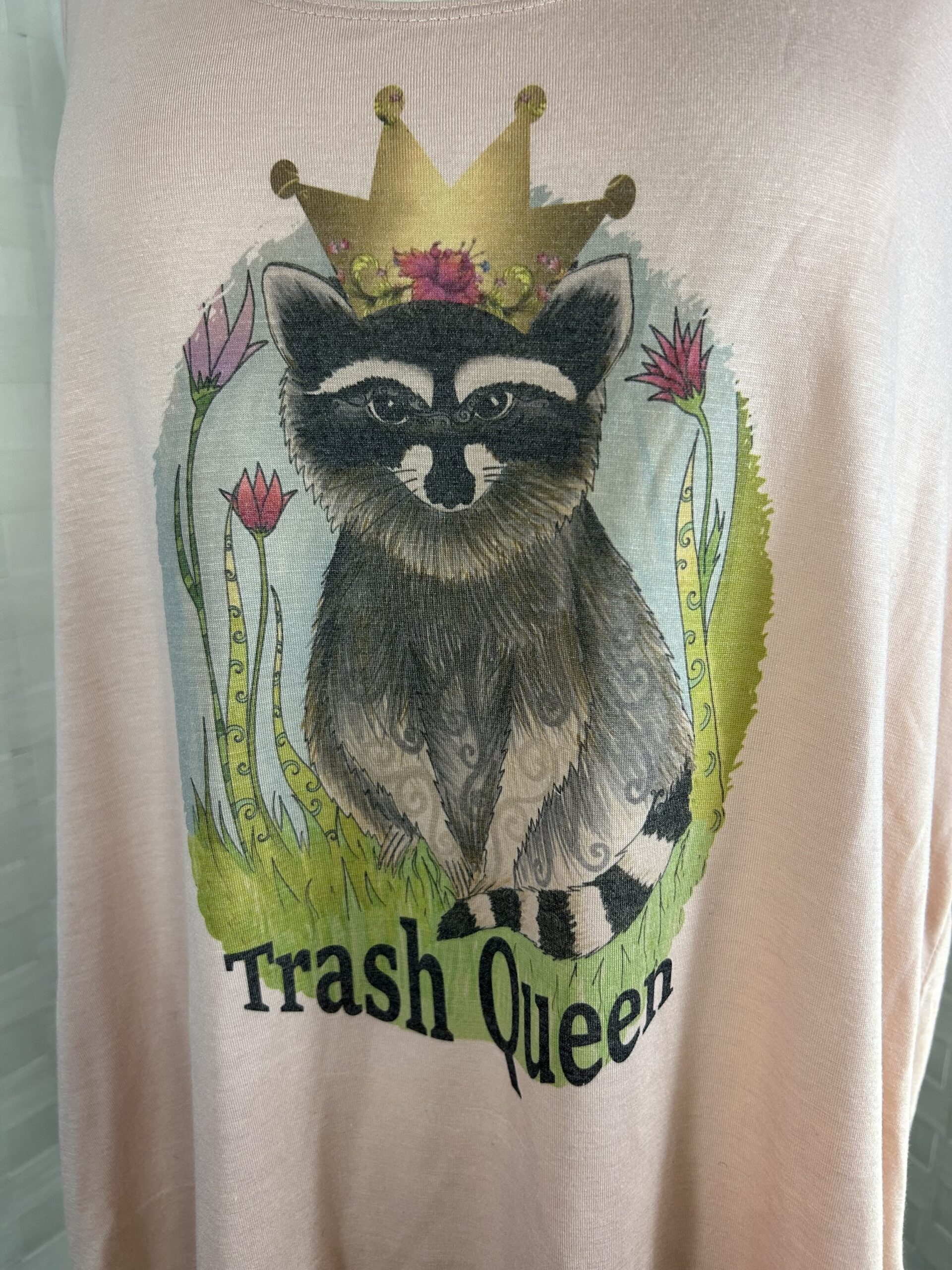 “Trash Queen” Raccoon print tank top. Peach color with split sides