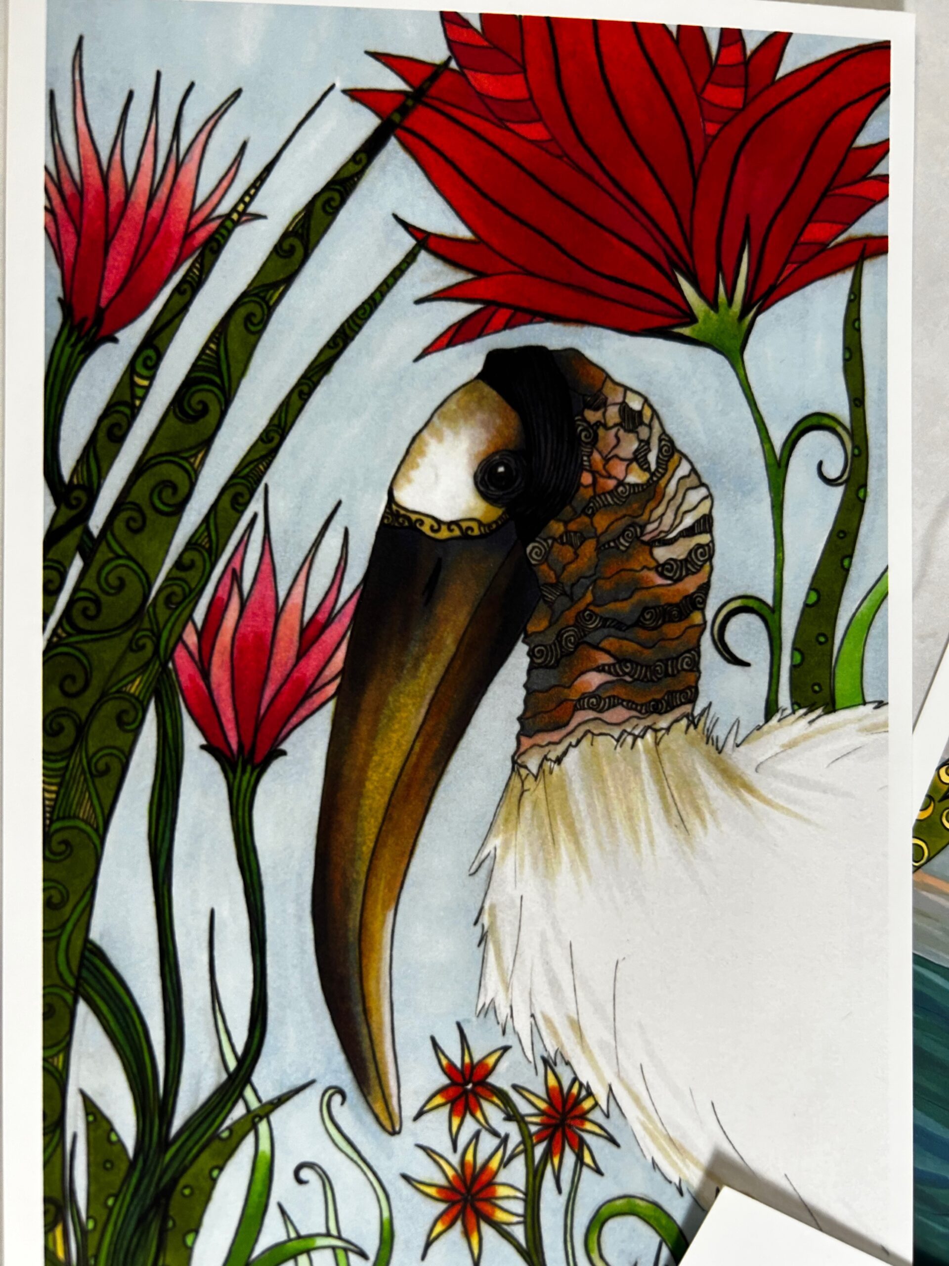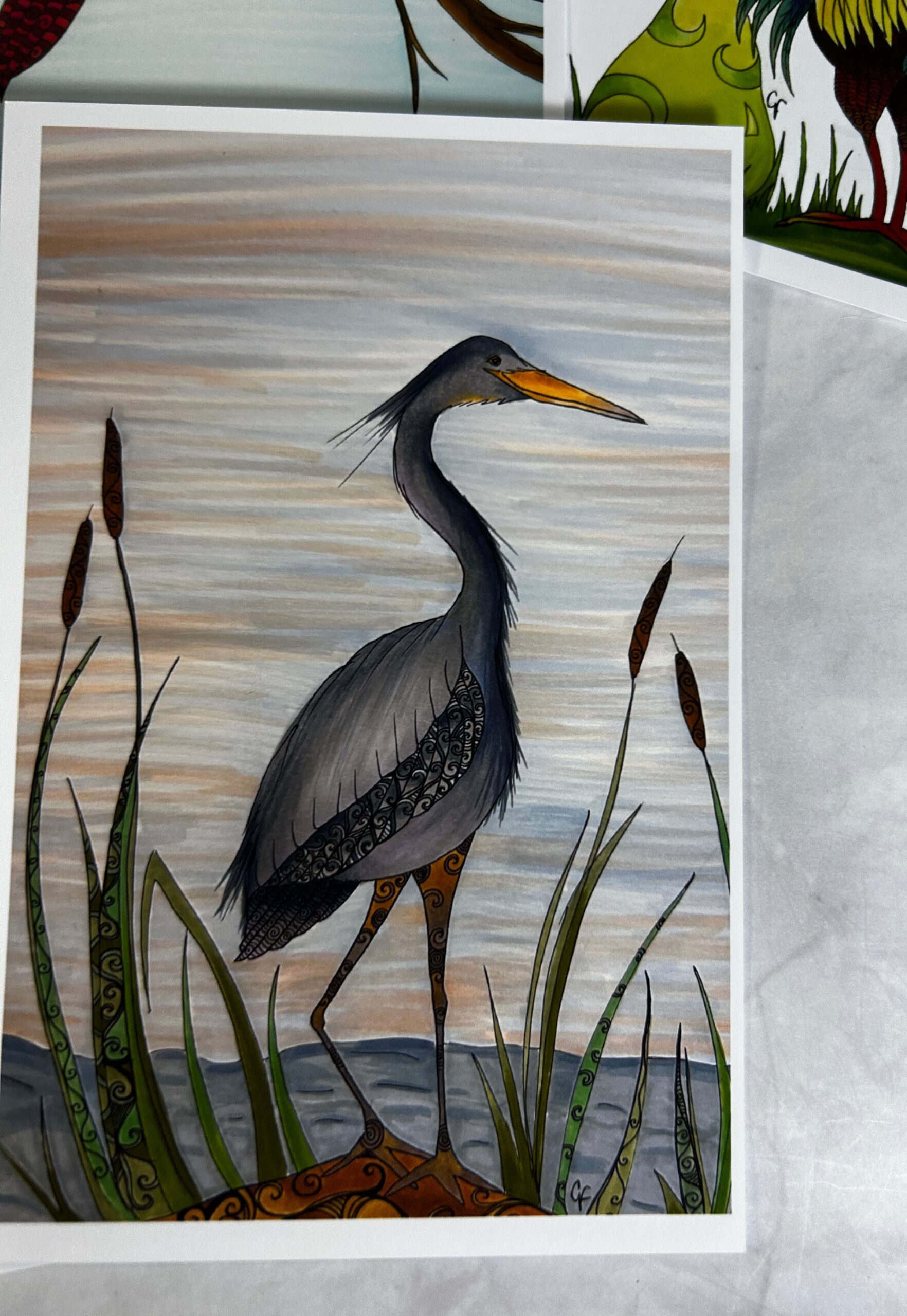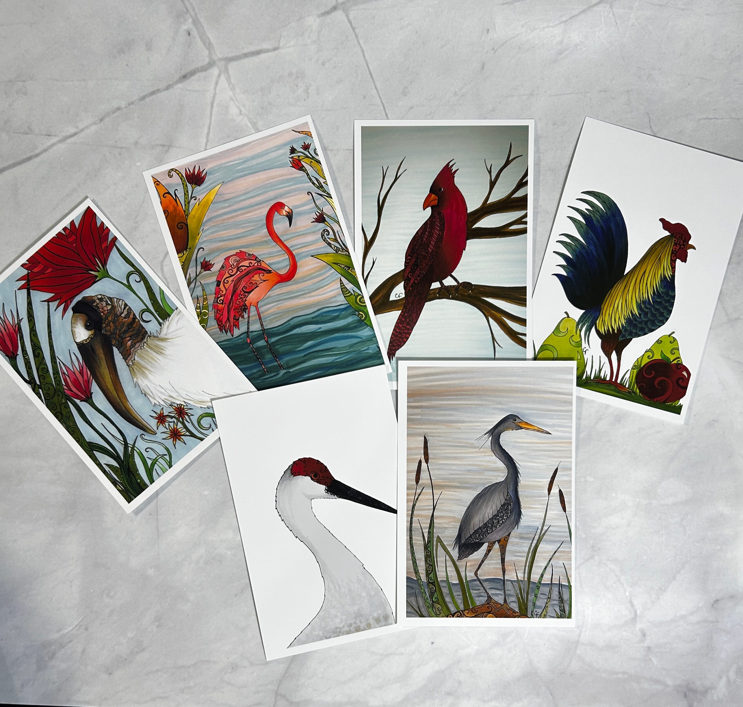 Sandhill Crane, Blue Heron, Cardinal, Wood Stork, Flamingo, and Rooster.