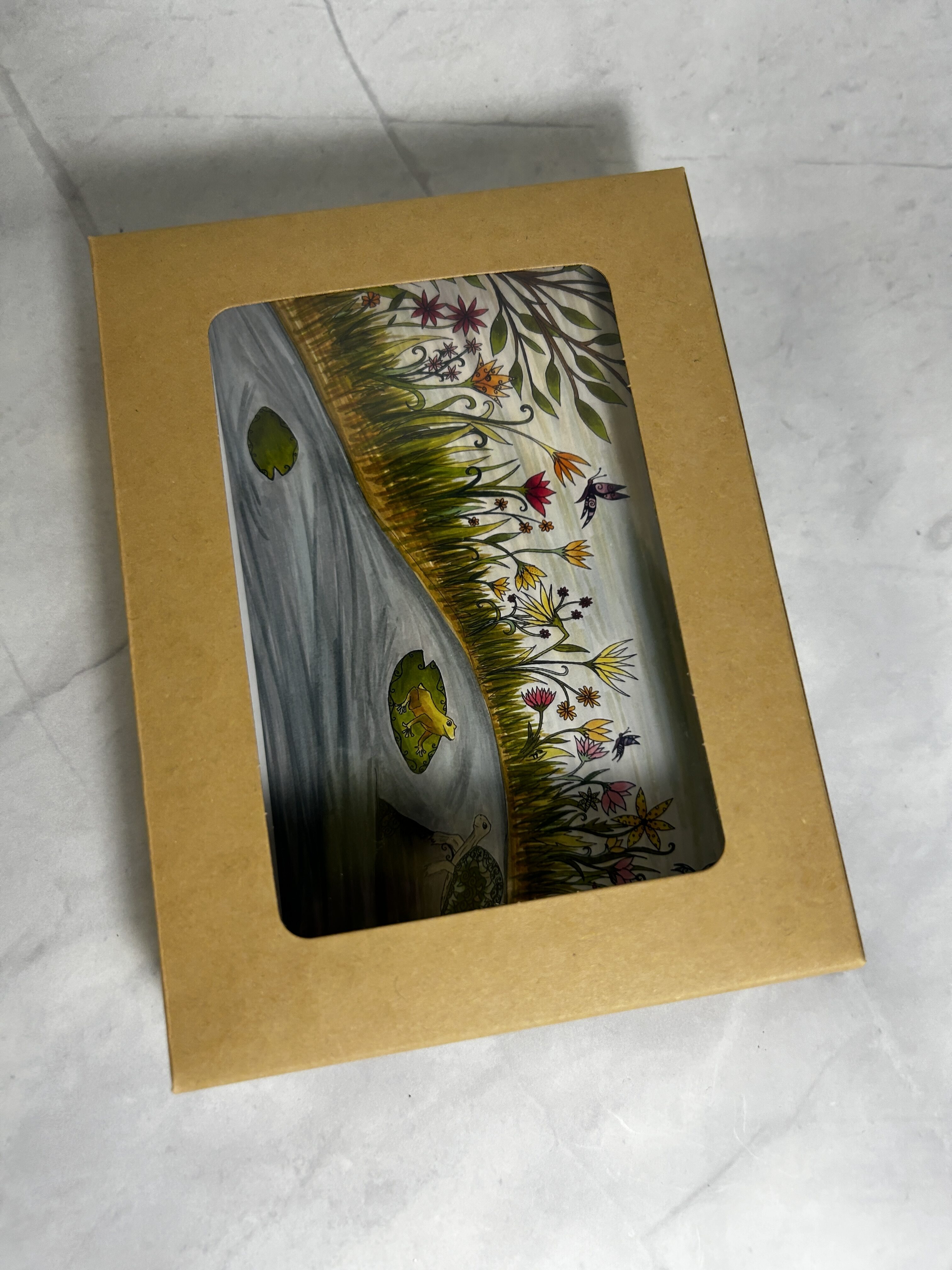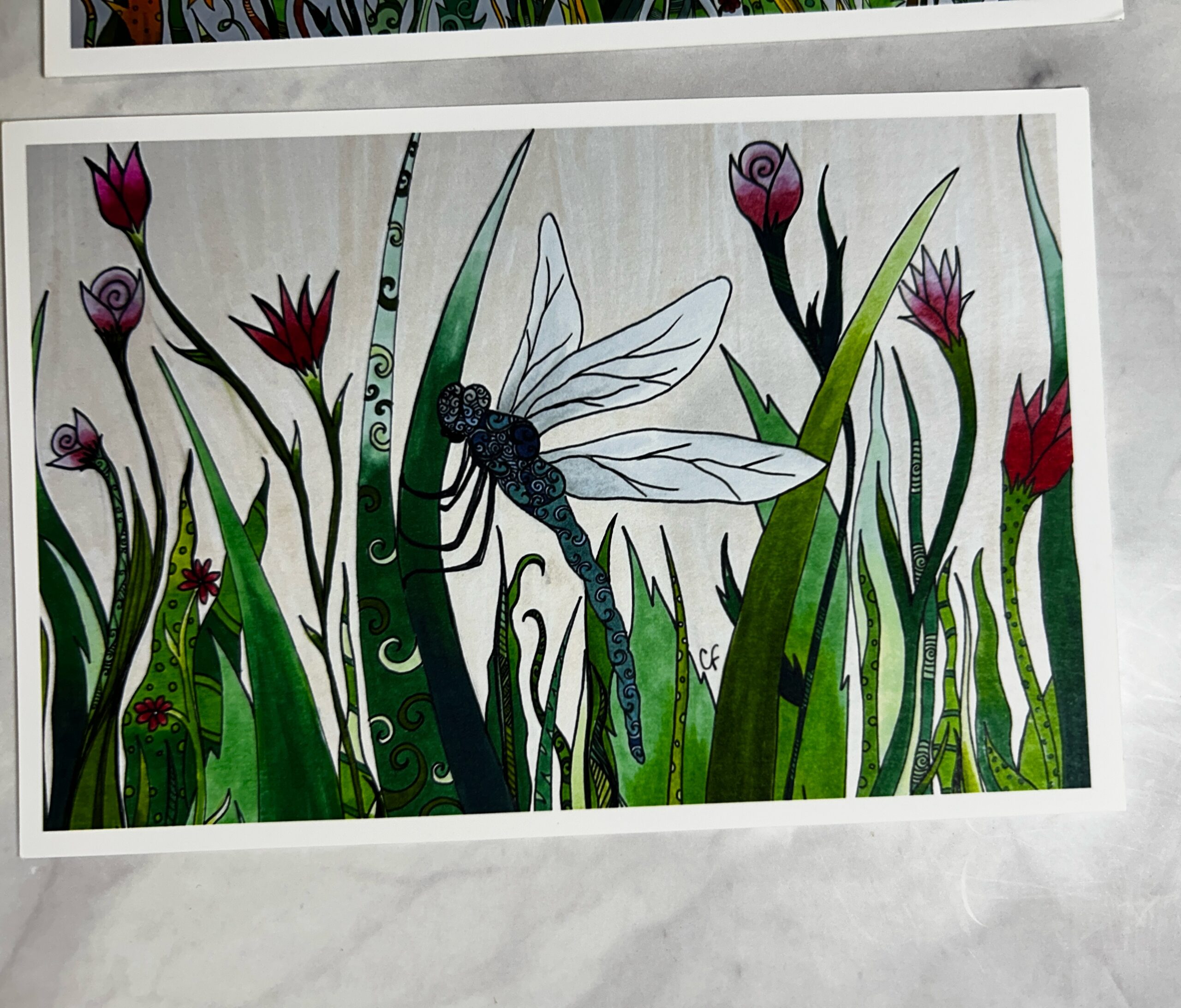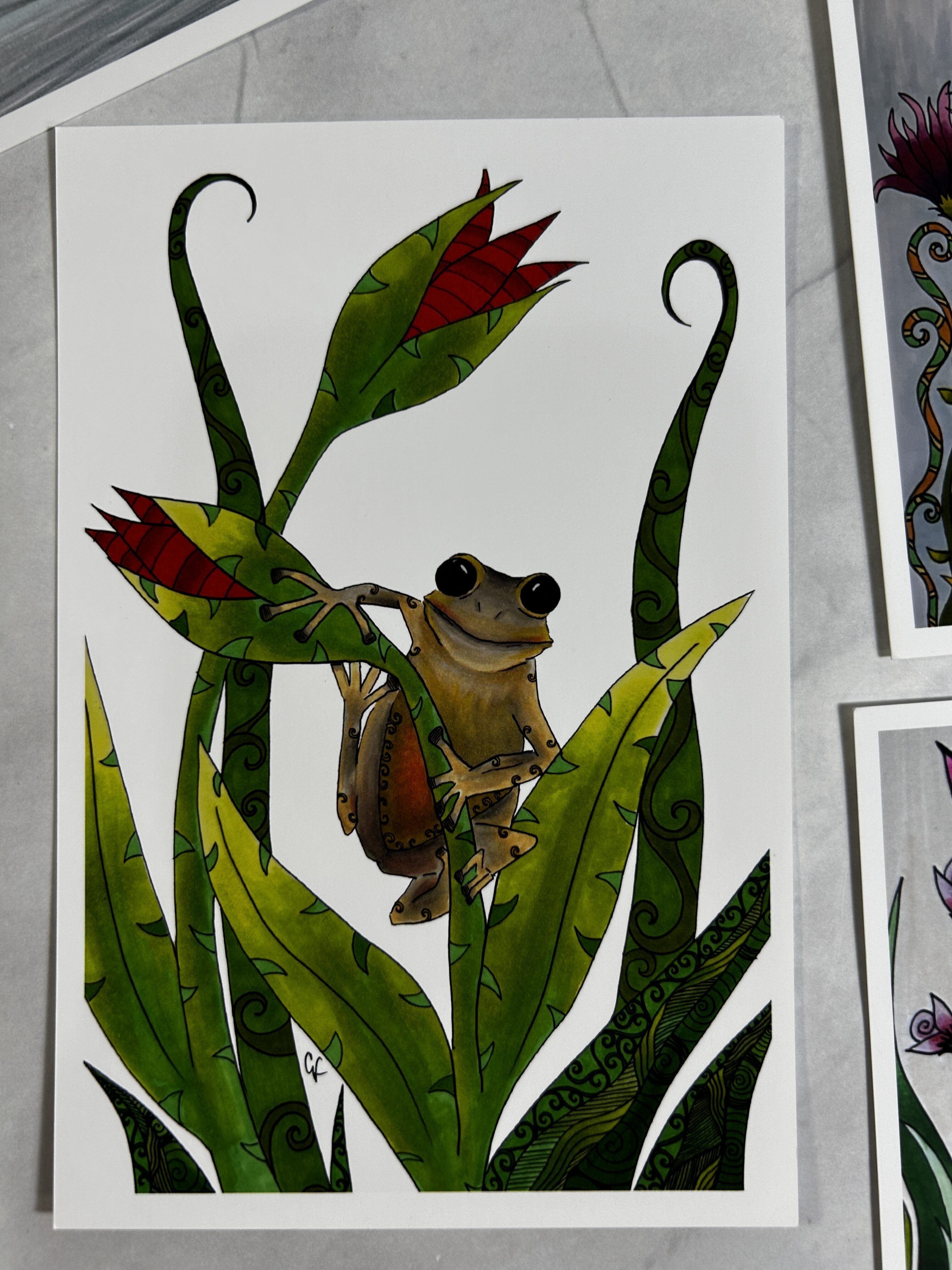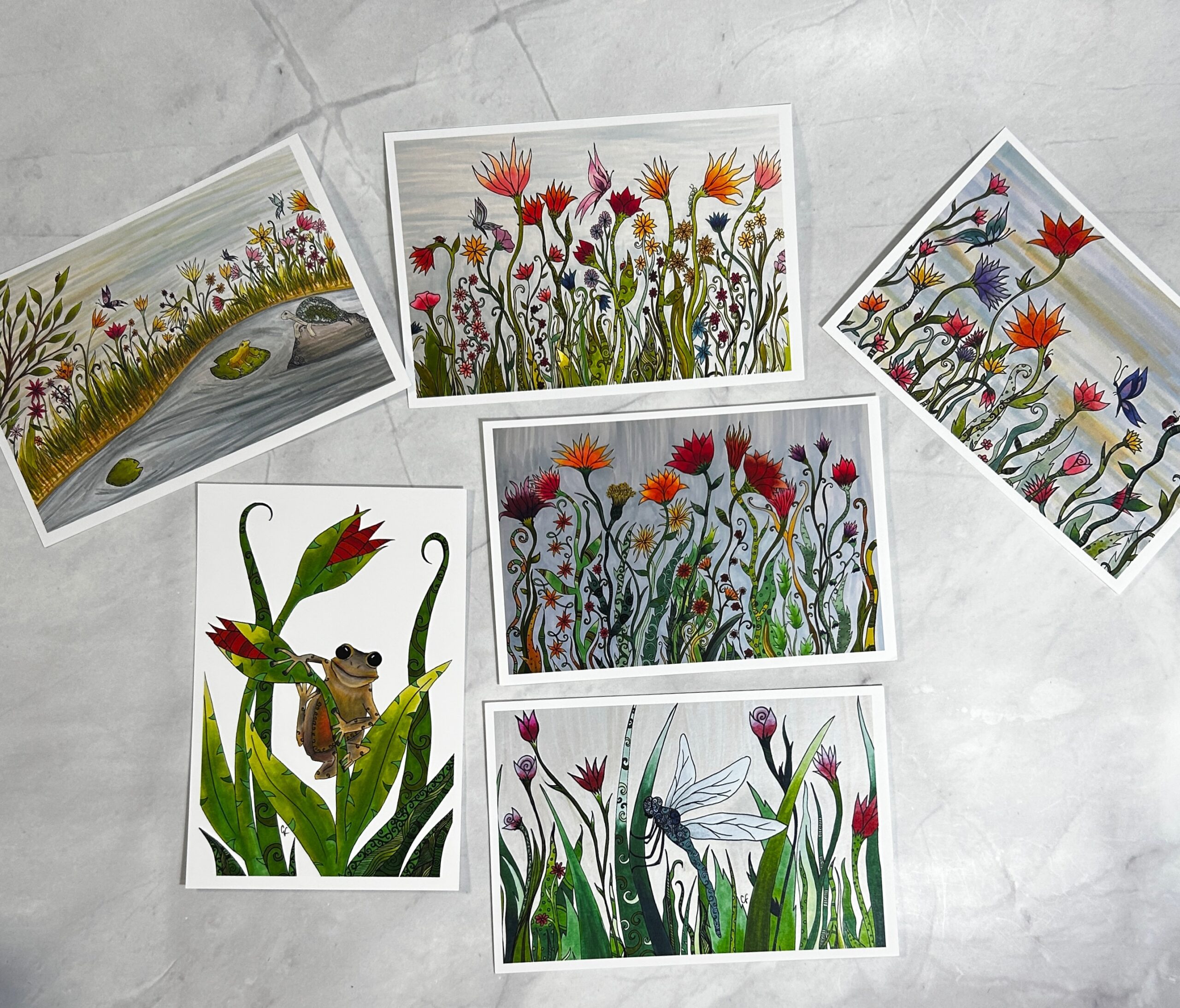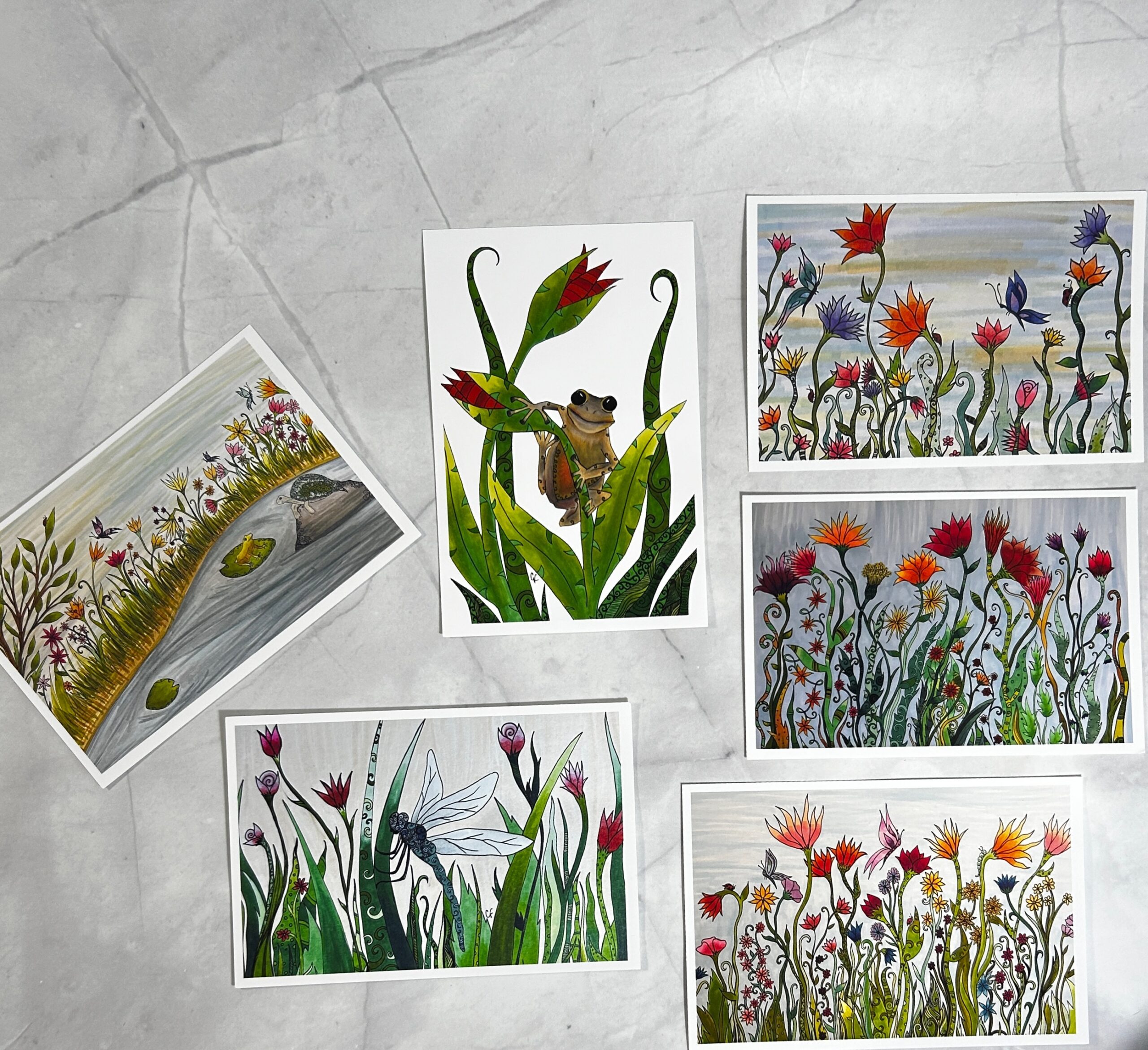 Variety of frogs, dragonfly and flower art print postcards
