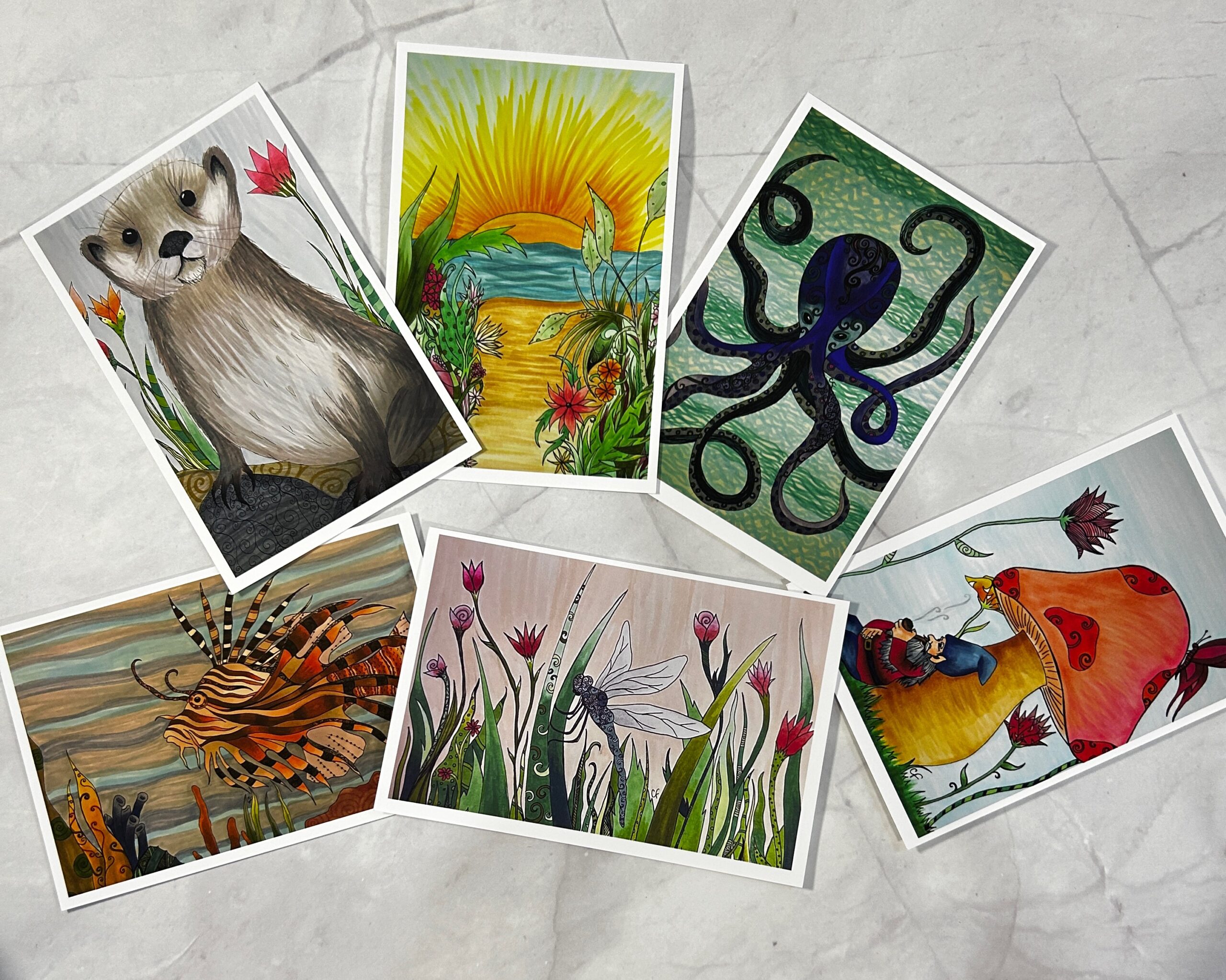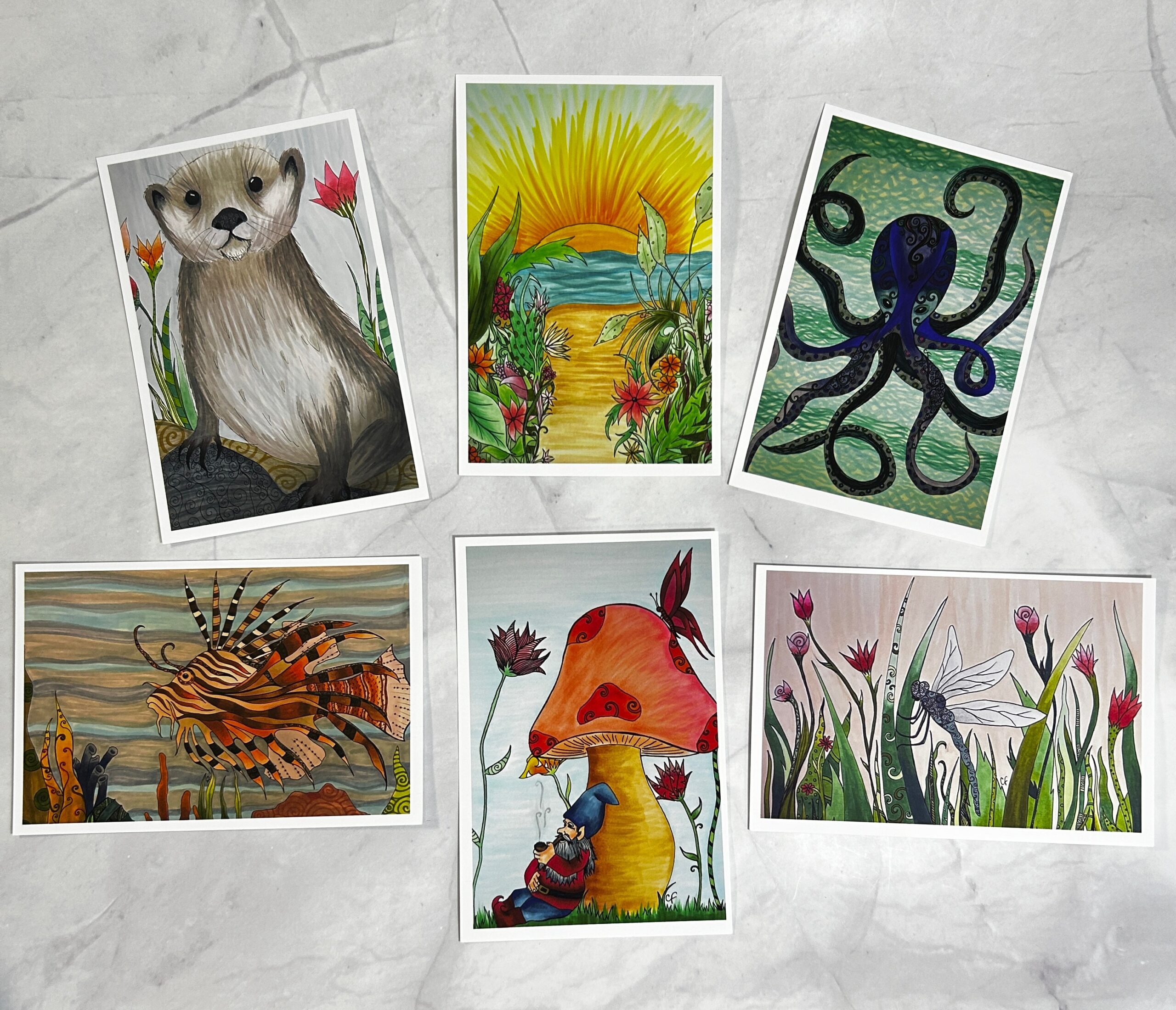 Set of 6 art print post cards, 4’x6′ postcards these are printed on high quality matte art paper.