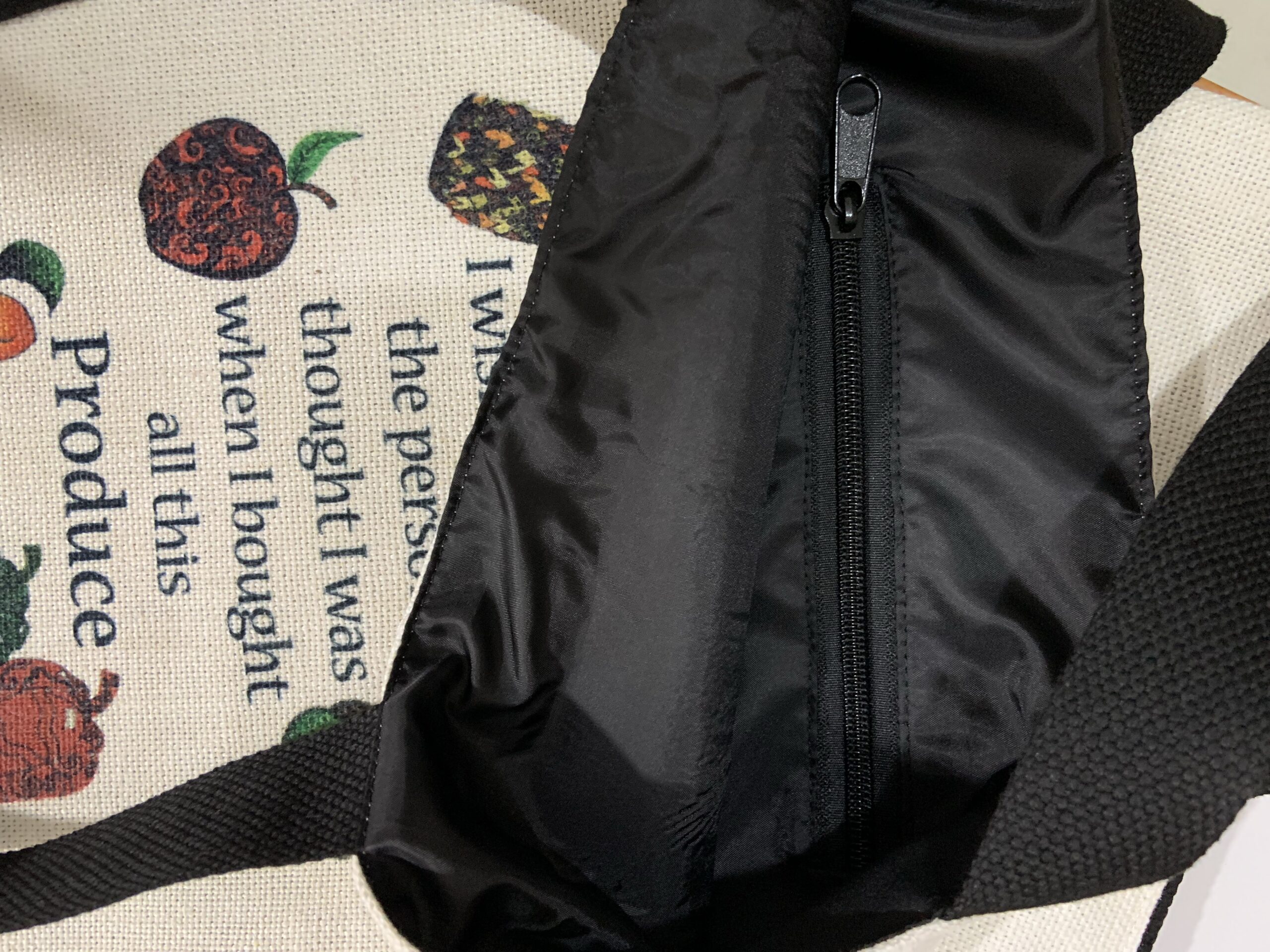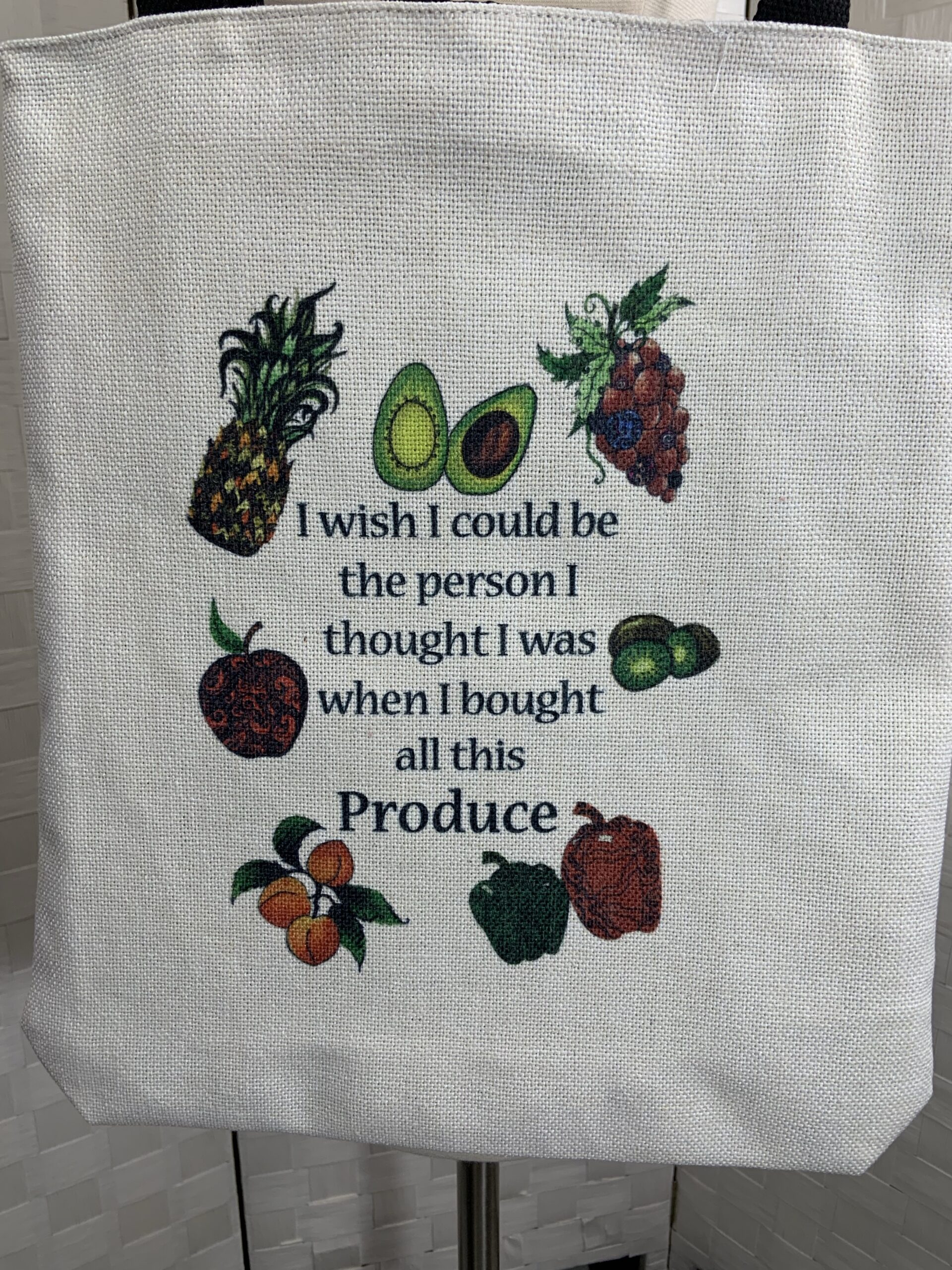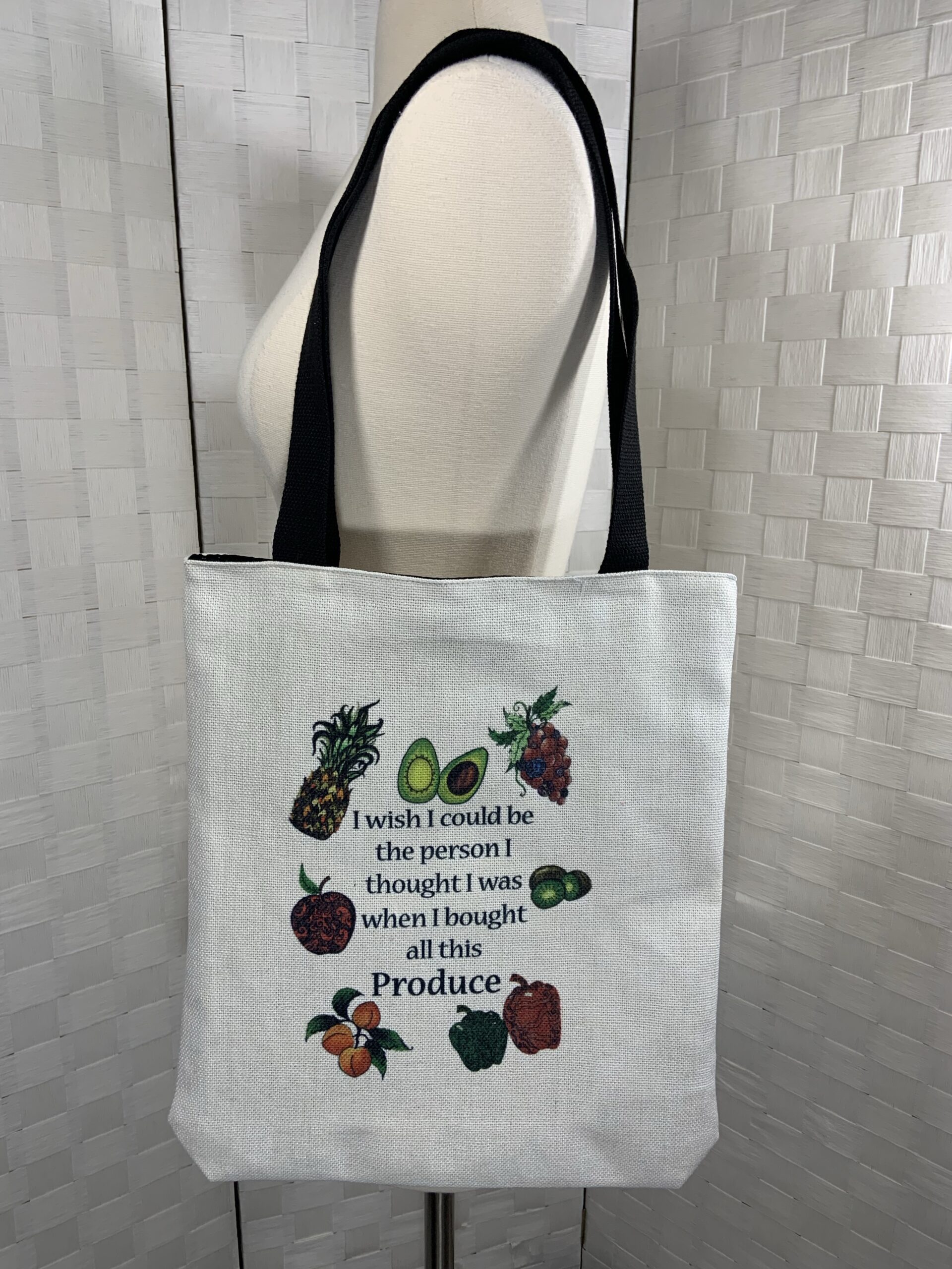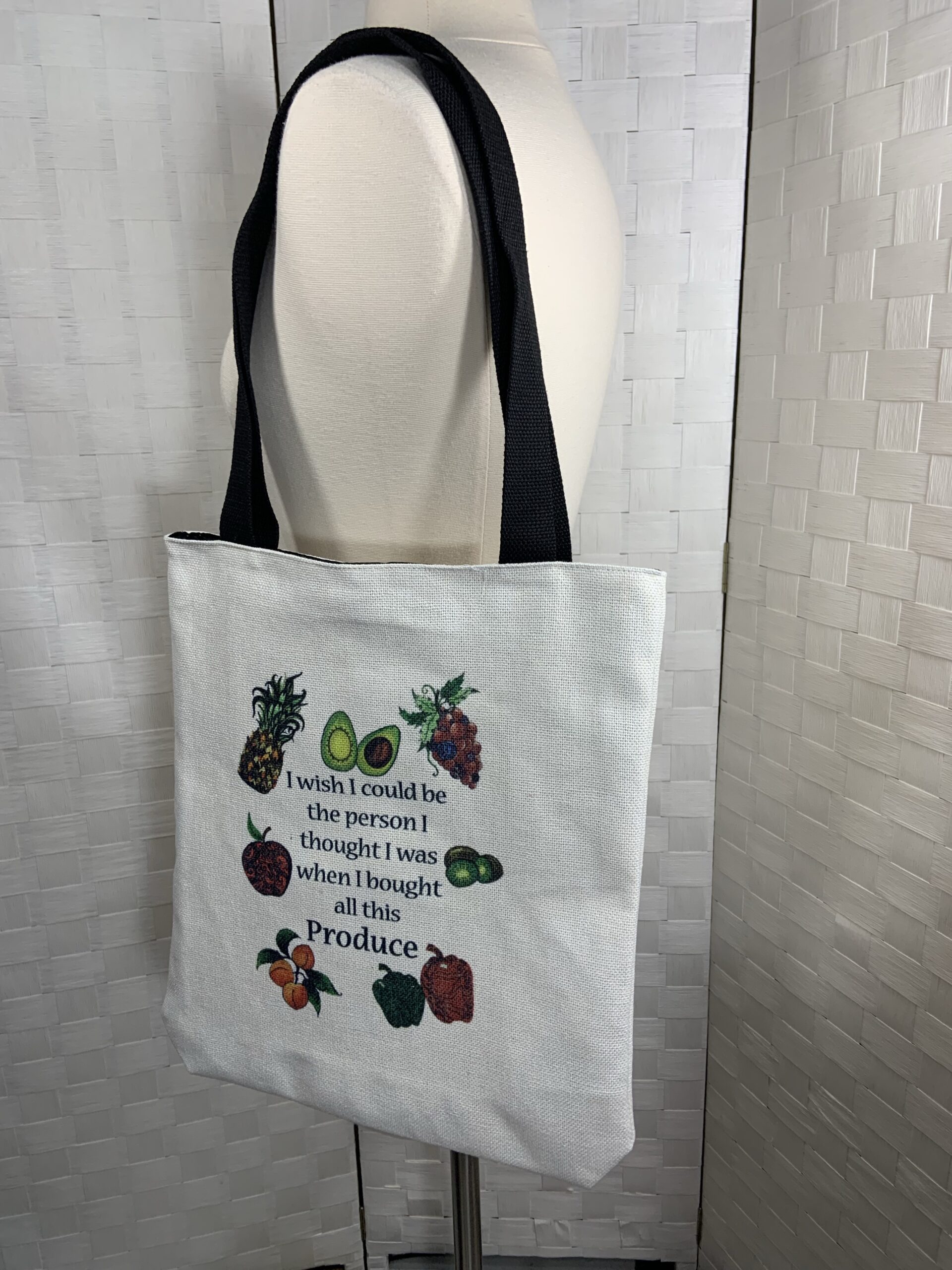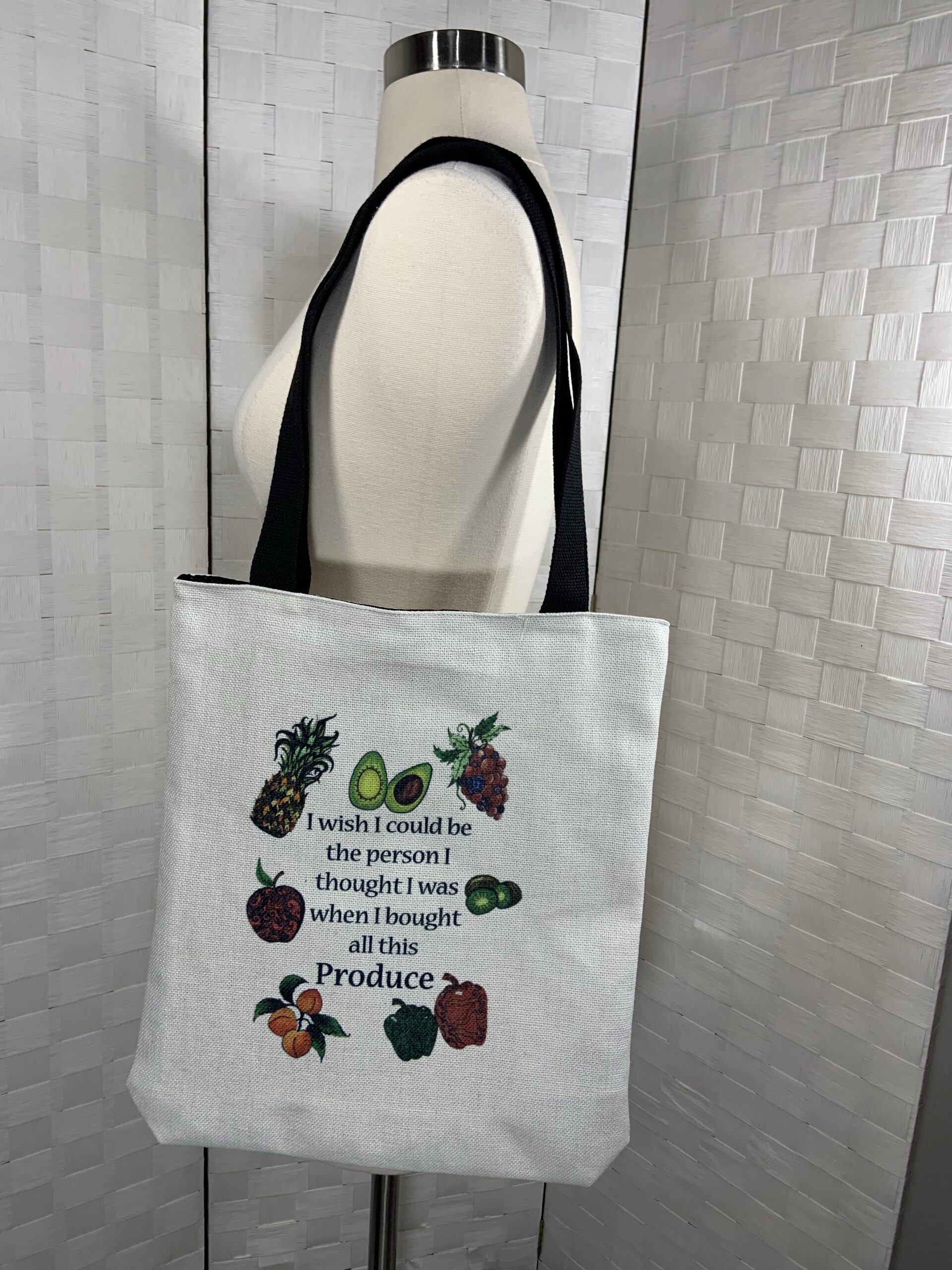 Reusable tote bag with zipper, fruit and vegetable print “I wish I could be the person I thought I was when I bought all this Produce” saying.