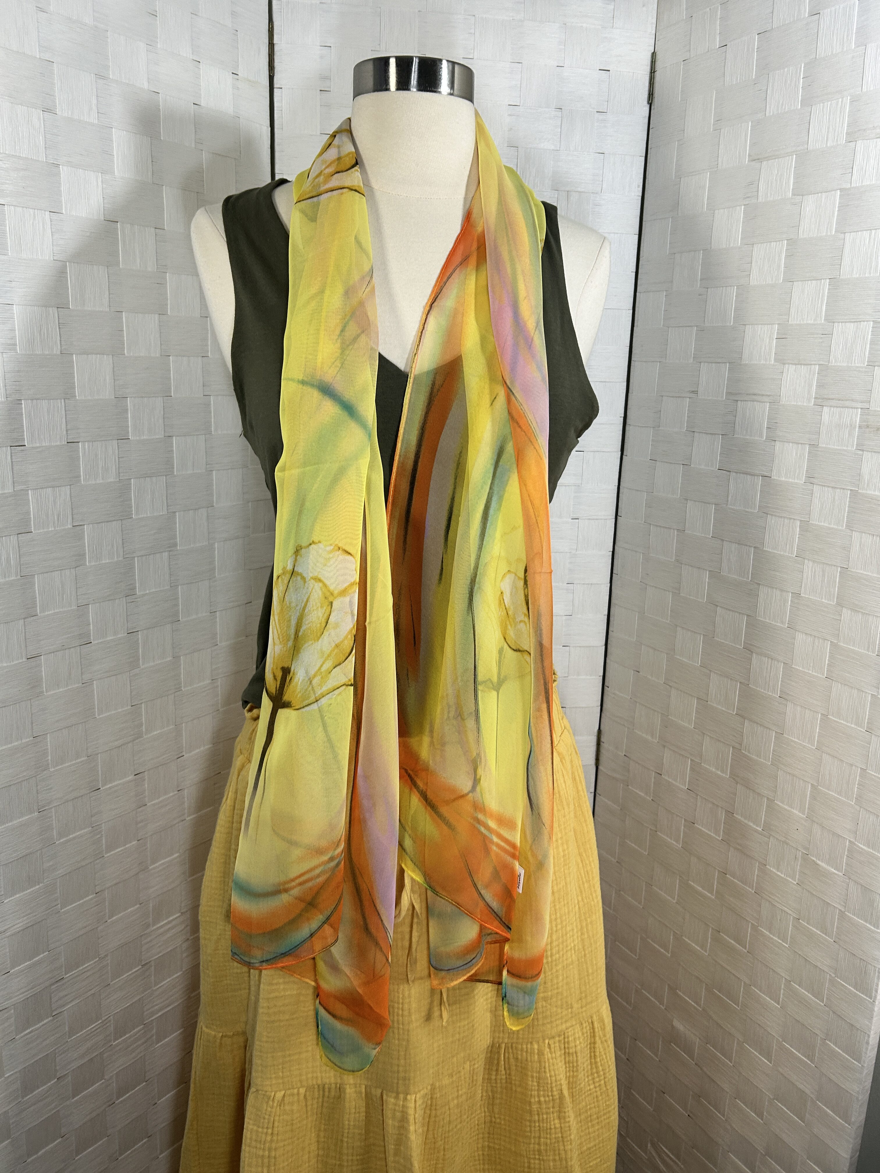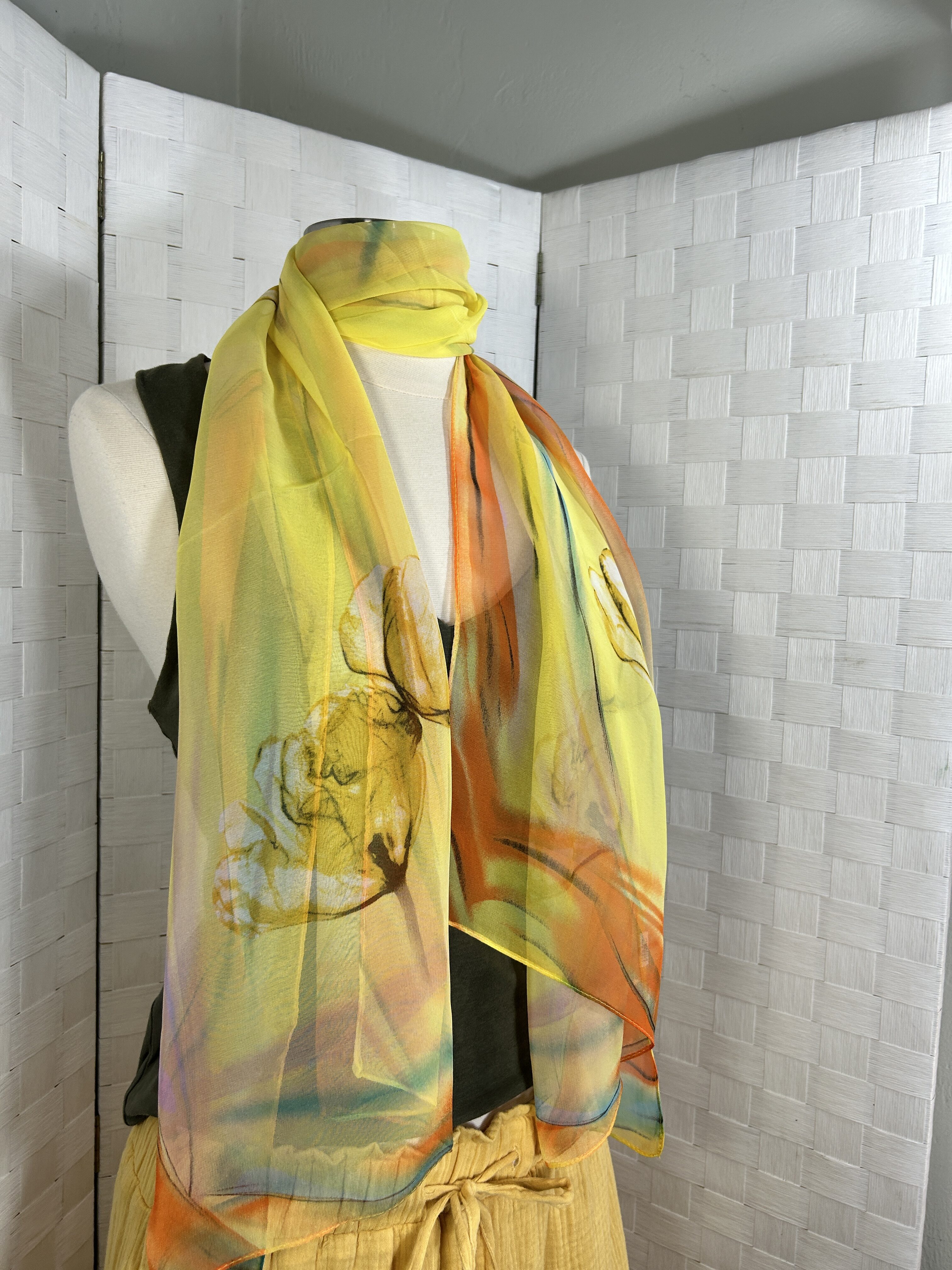 Silky feel summer scarf with floral print, yellow base with multicolor print (green, yellow, red)