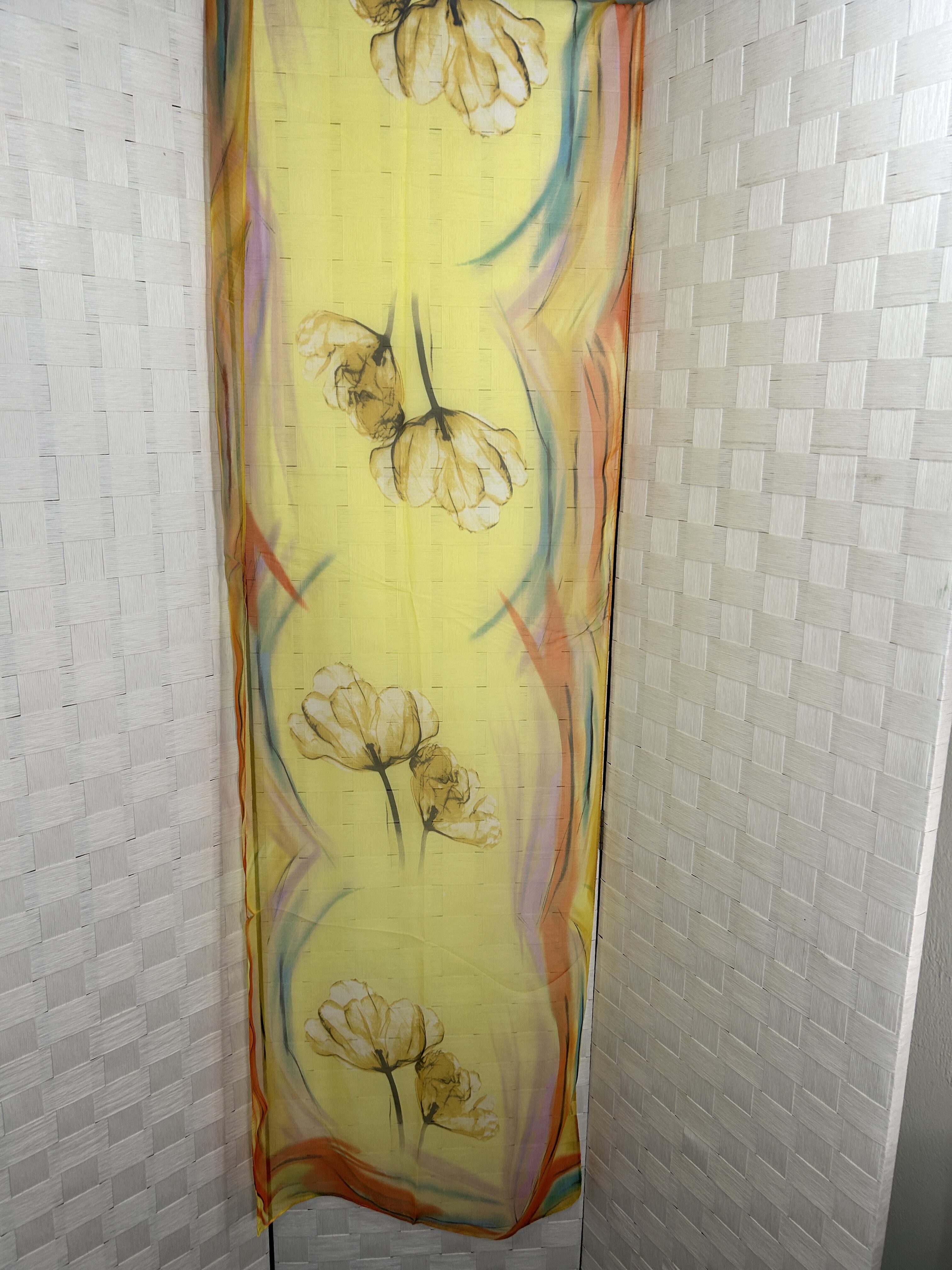 Silky feel summer scarf with floral print, yellow base with multicolor print