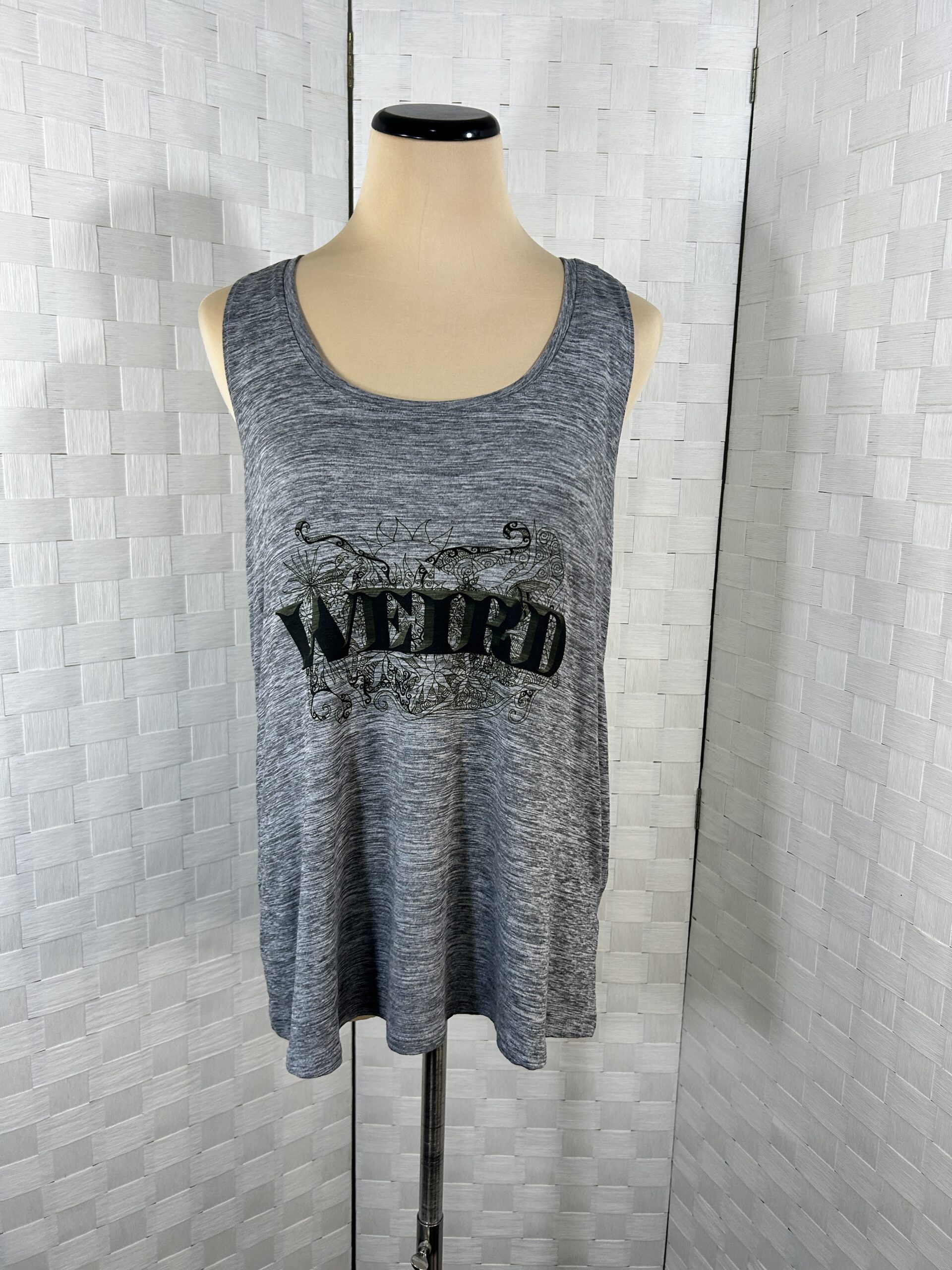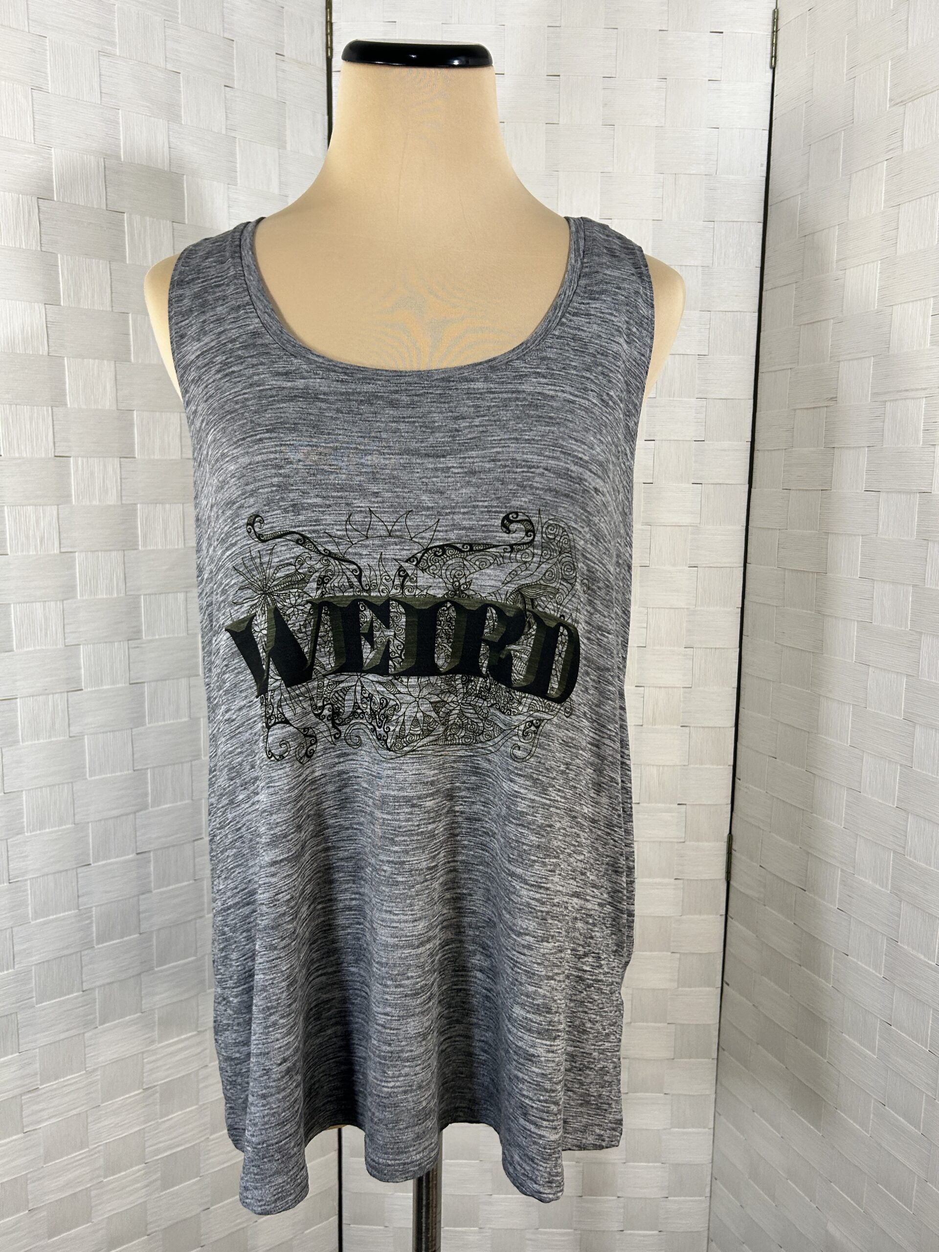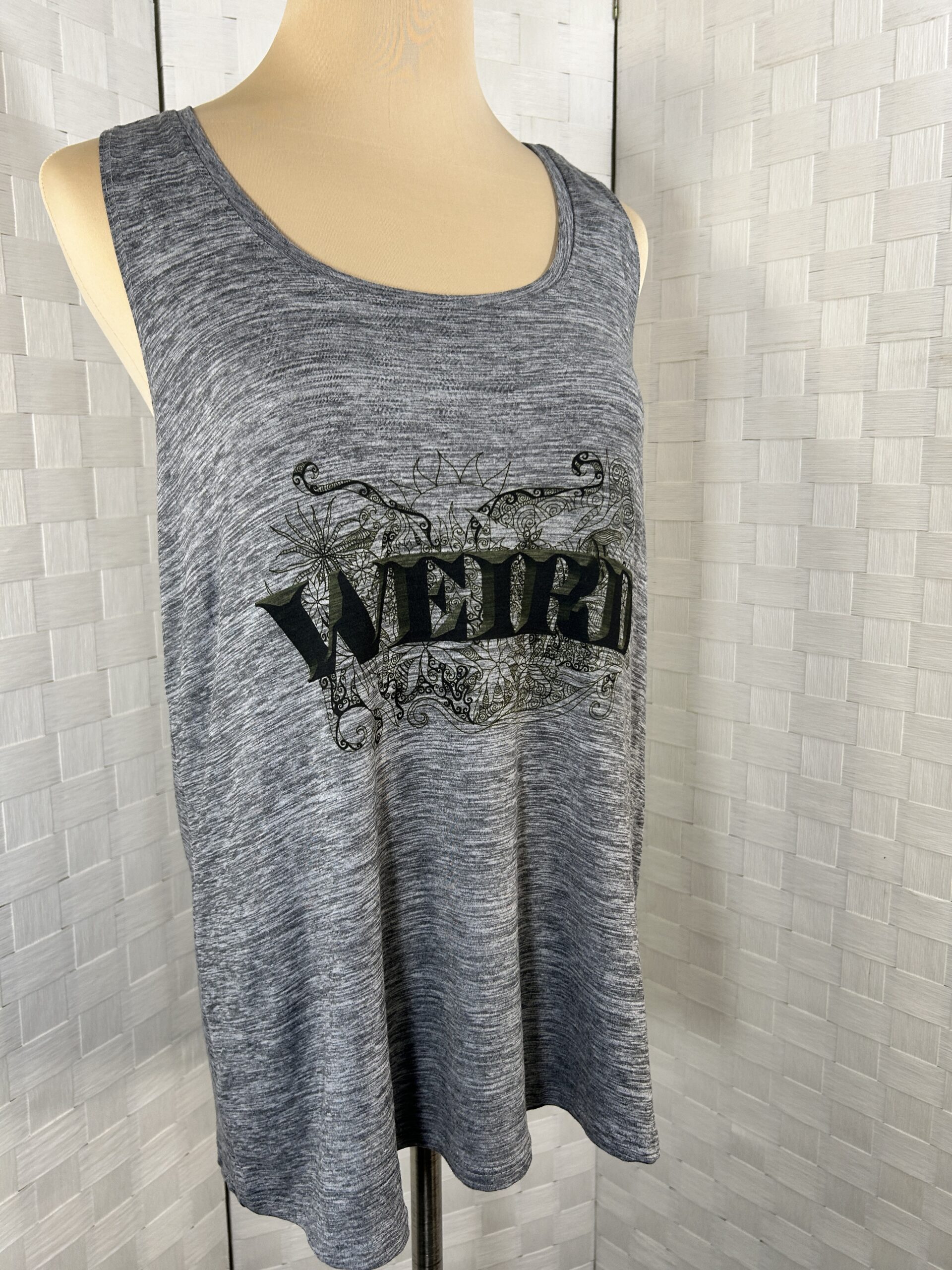 Heather gray with “Weird” text over one of my abstract/floral designs