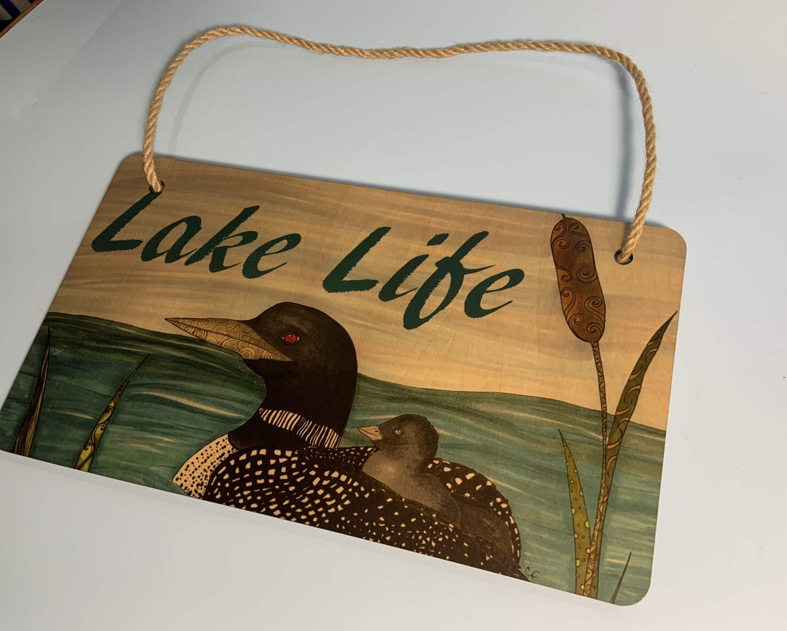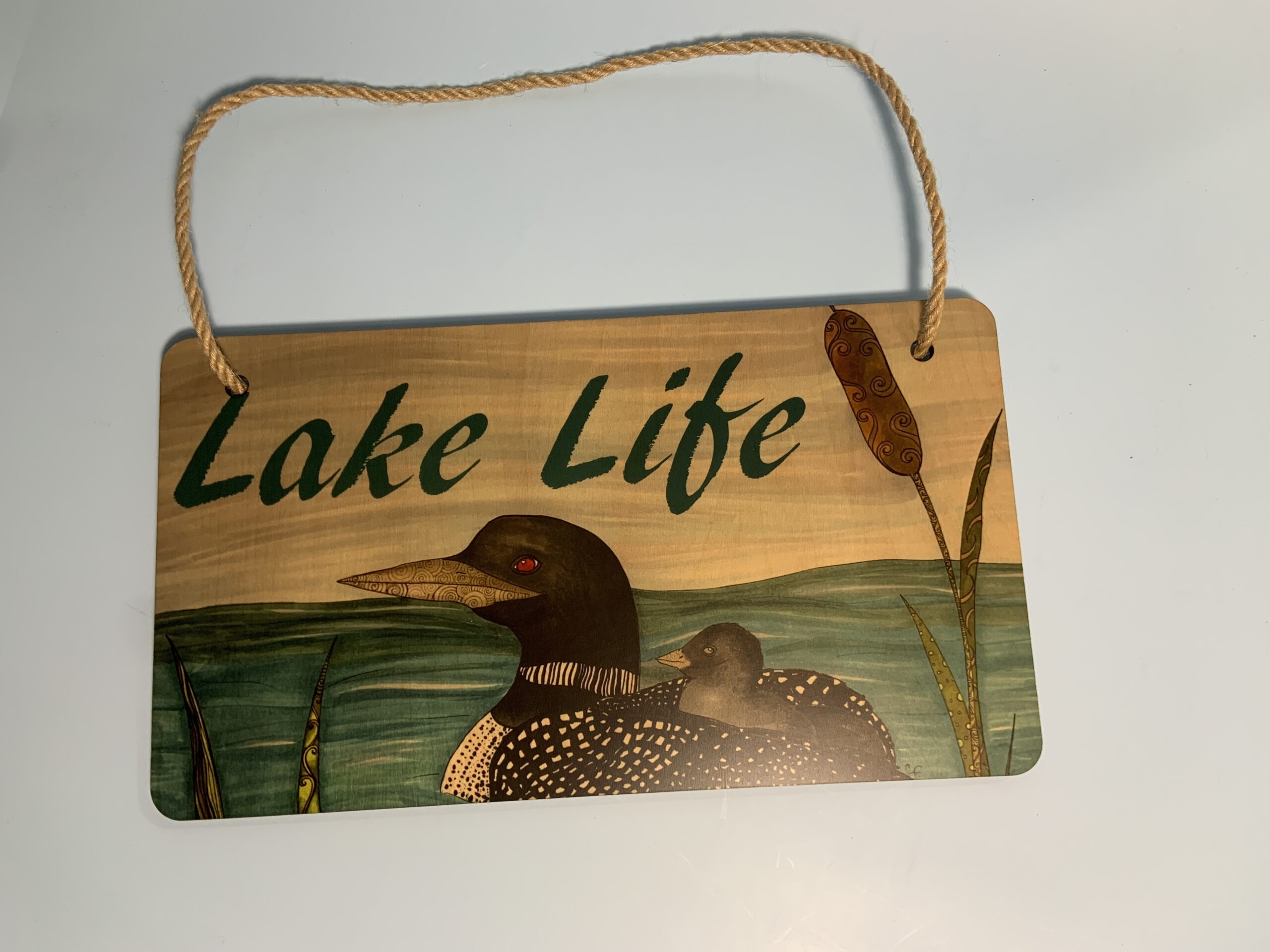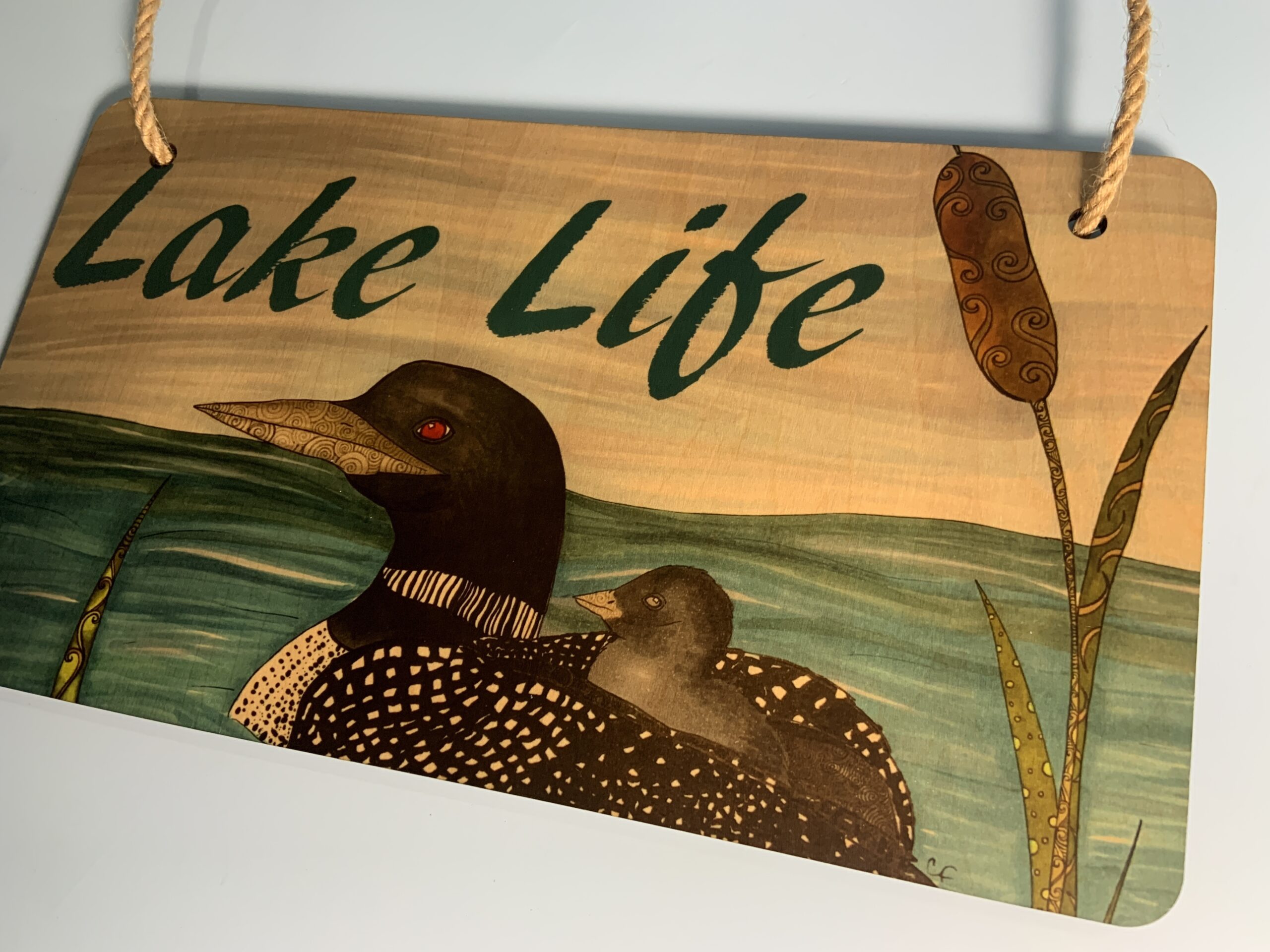 Wood hanging sign with print of my Loon drawing “Lake Life”