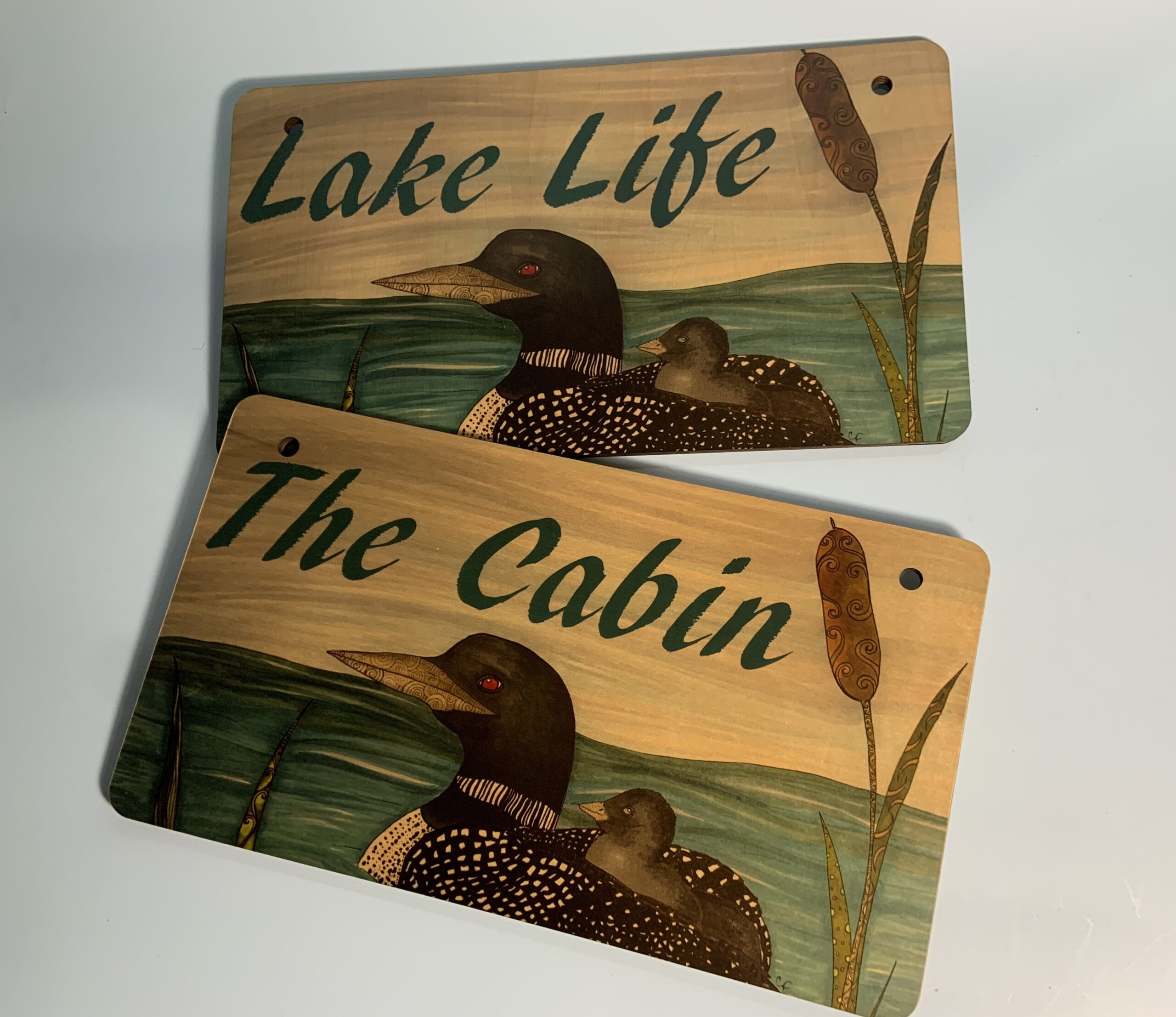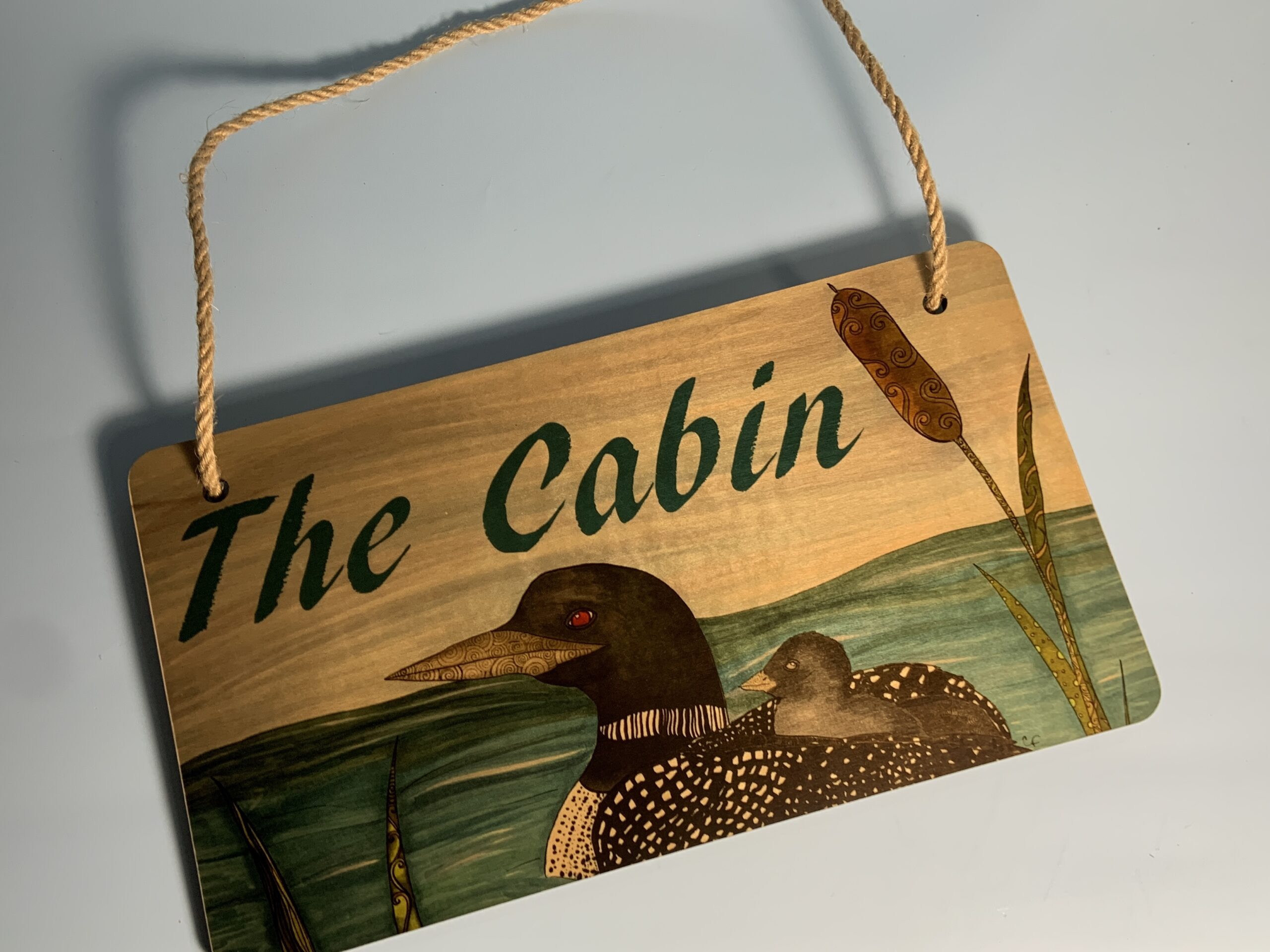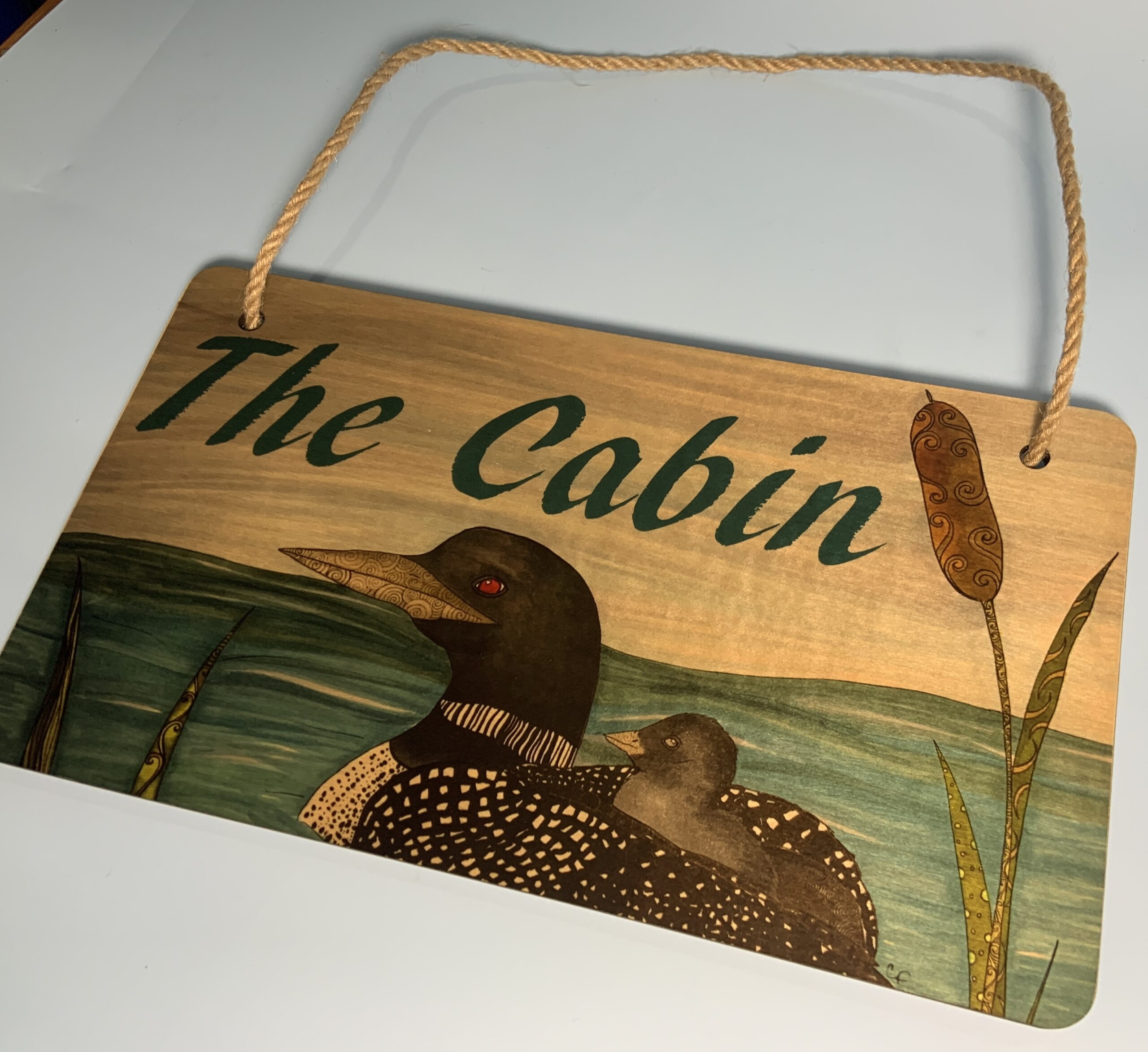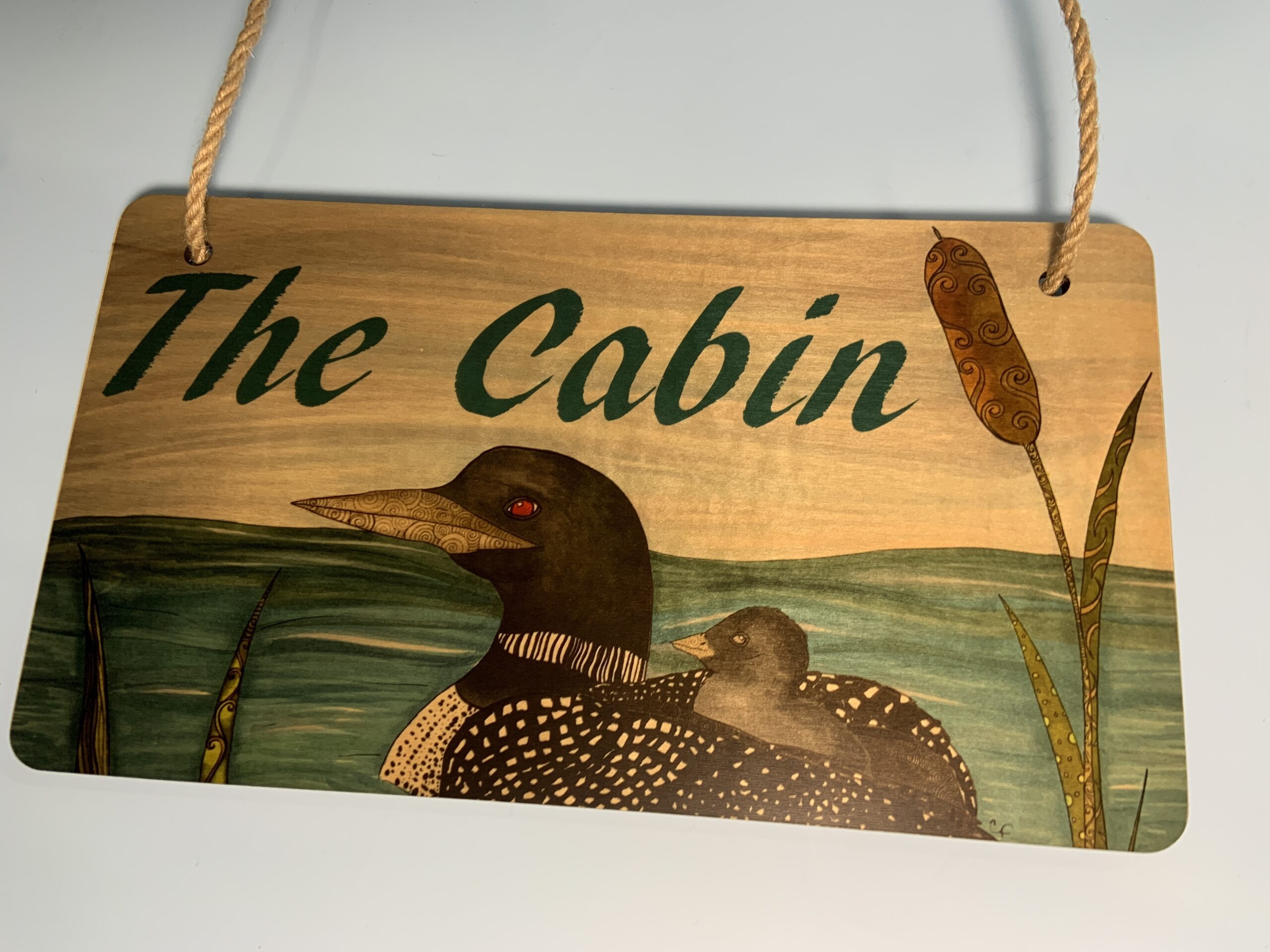 Wood hanging sign with print of my Loon drawing “The Cabin”